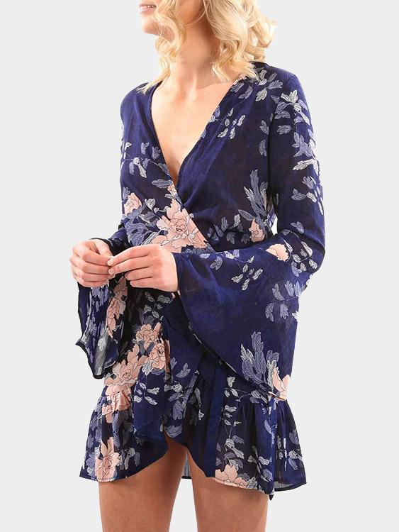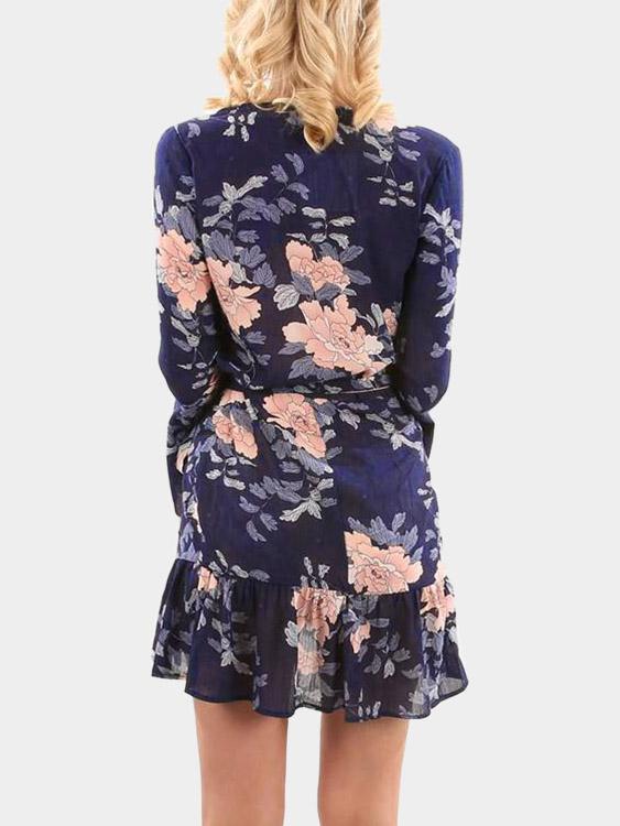Navy Deep V-Neck Long Sleeve Floral Print Mini Dresses