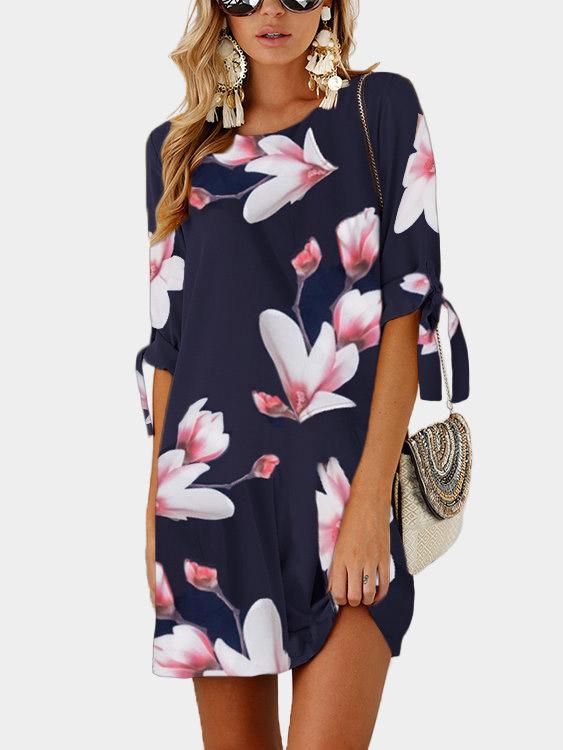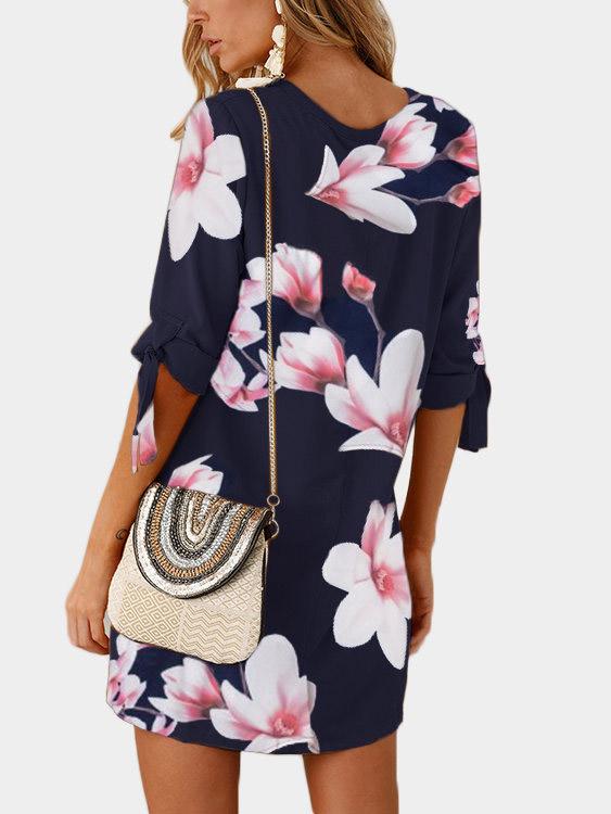 Navy Round Neck Half Sleeve Floral Print Self-Tie Mini Dresses - Navy / S is backordered and will ship as soon as it is back in stock.
