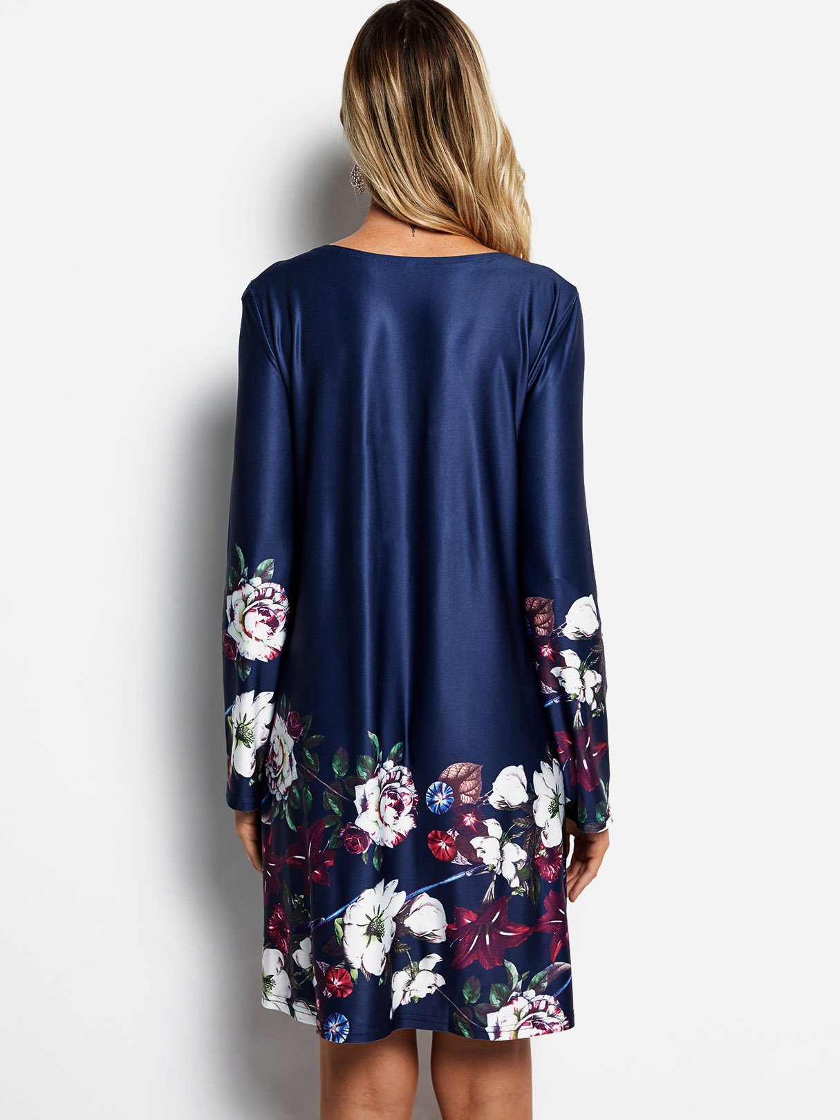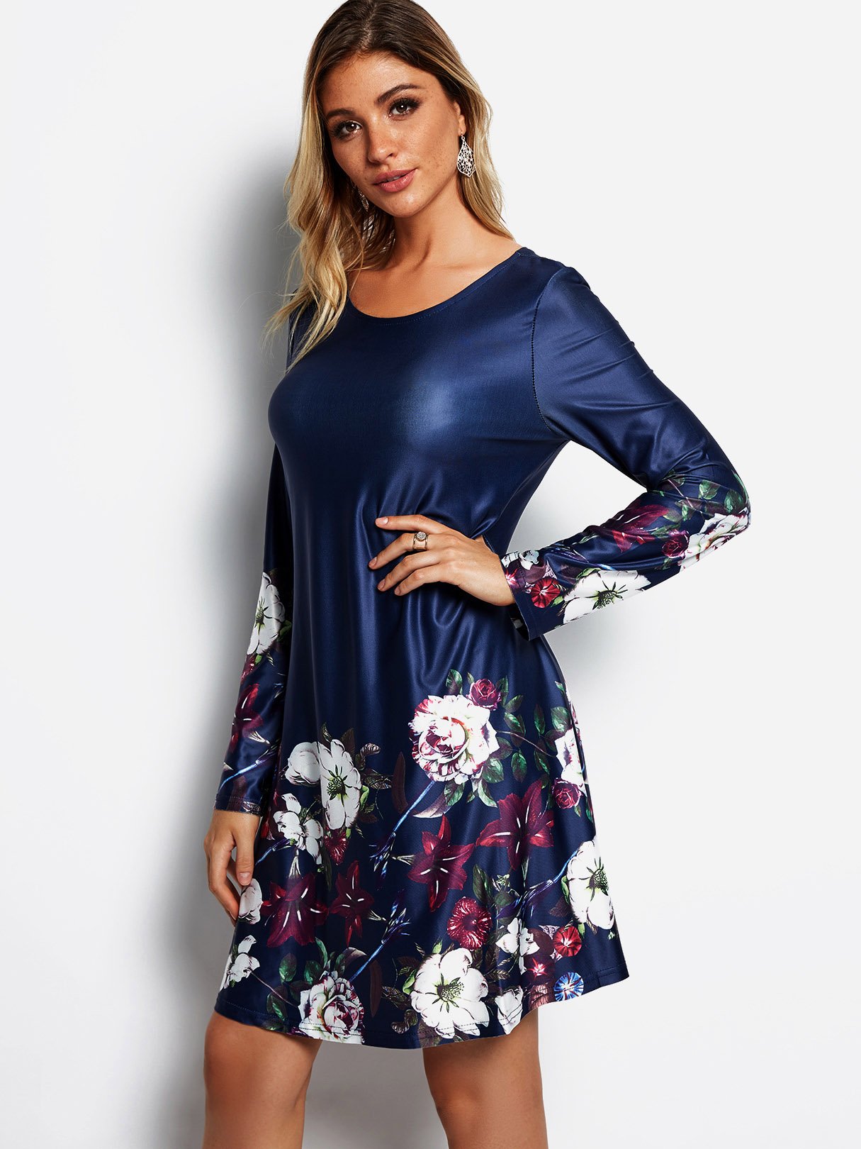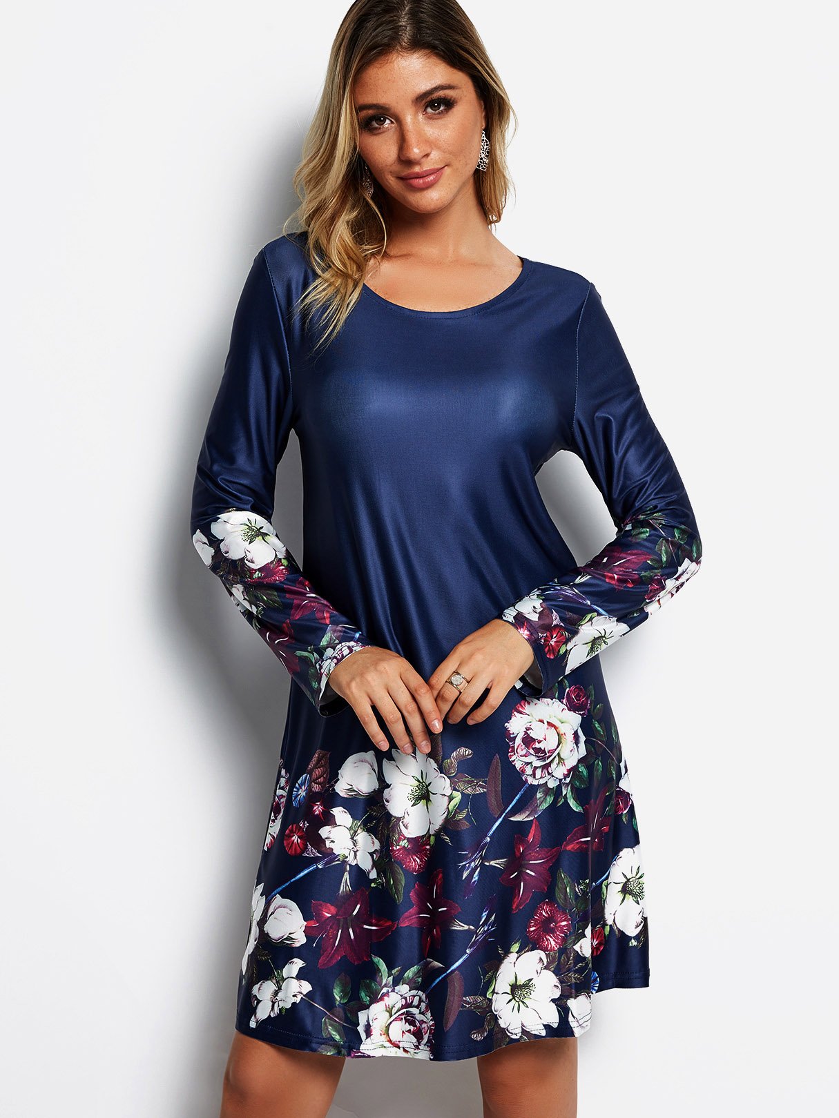Navy Round Neck Long Sleeve Floral Print Mini Dress - Navy / S is backordered and will ship as soon as it is back in stock.