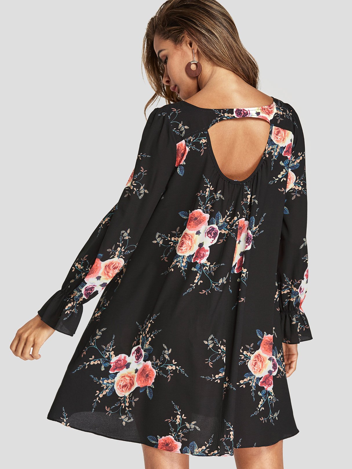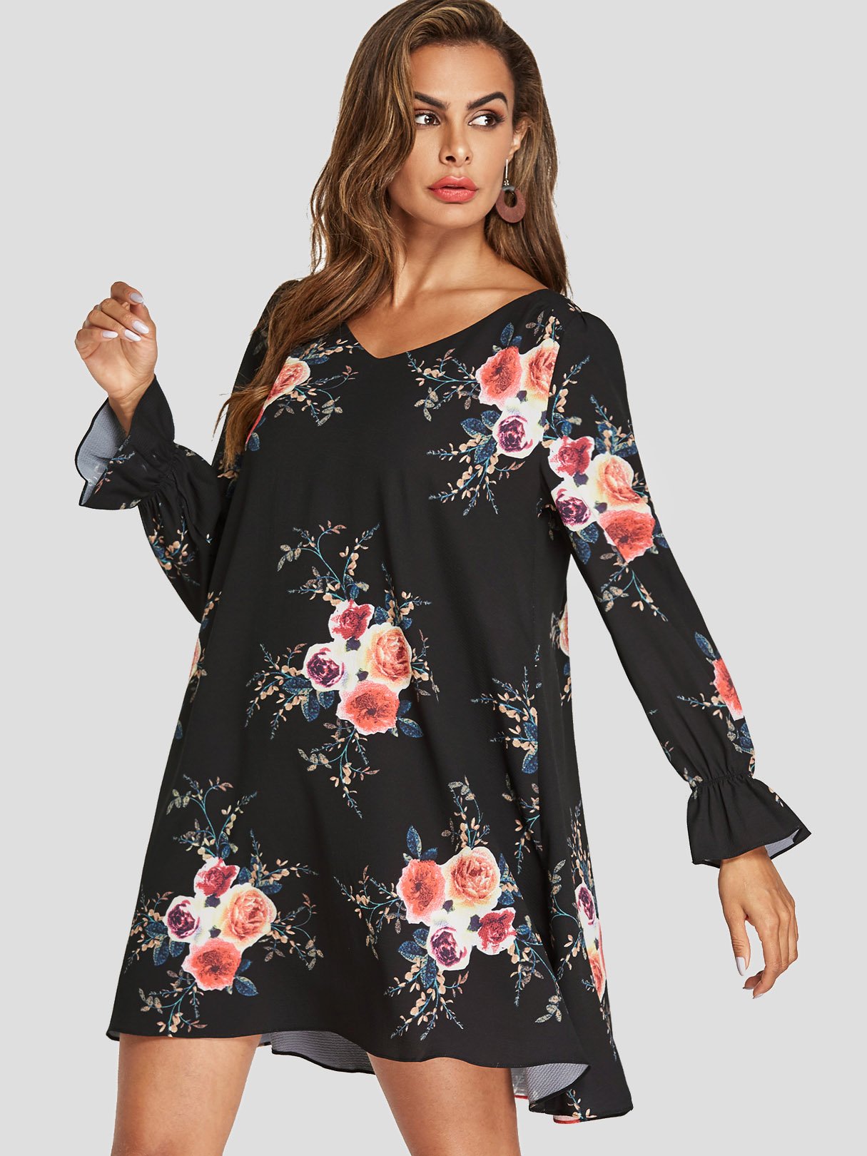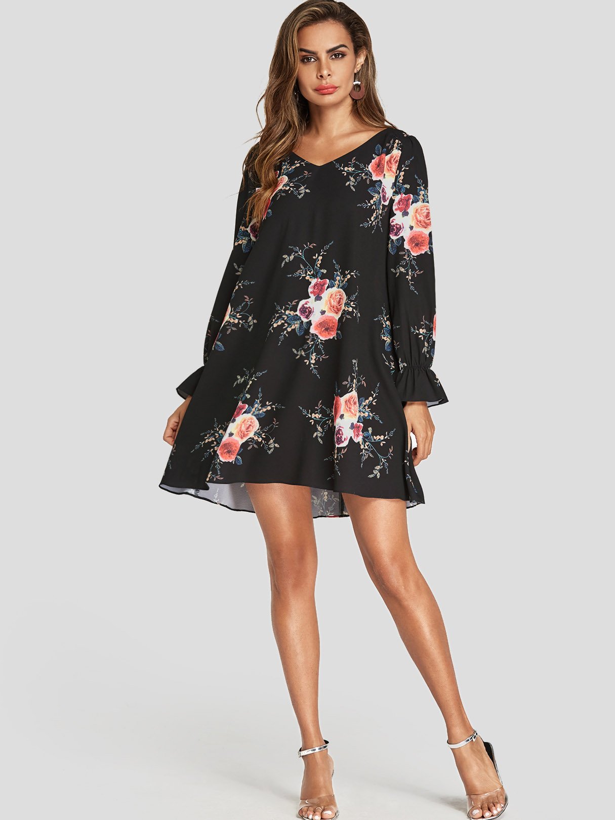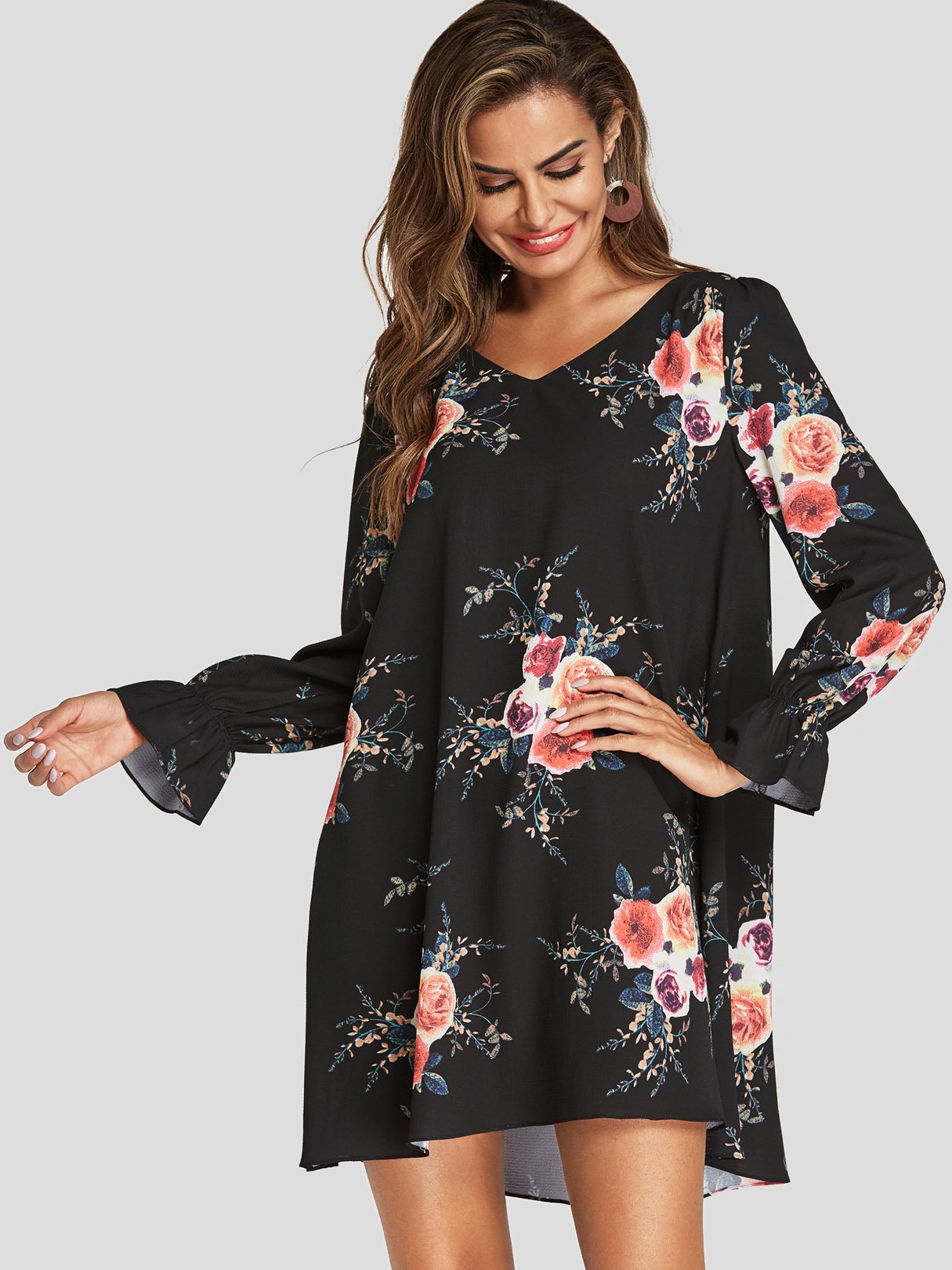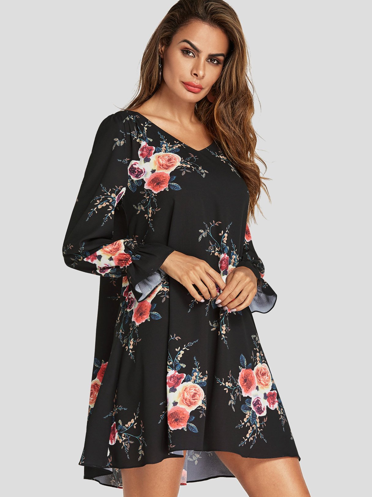 Material:PolyesterNeckline:V-NeckSeason:Spring,Autumn,WinterSleeves:Long SleevesPattern:Floral PrintStyle:Vacation StyleDetail:Cut OutLength:MiniFit:Loose FitSleeves Type:Elastic SleevesOccasion:Vacation