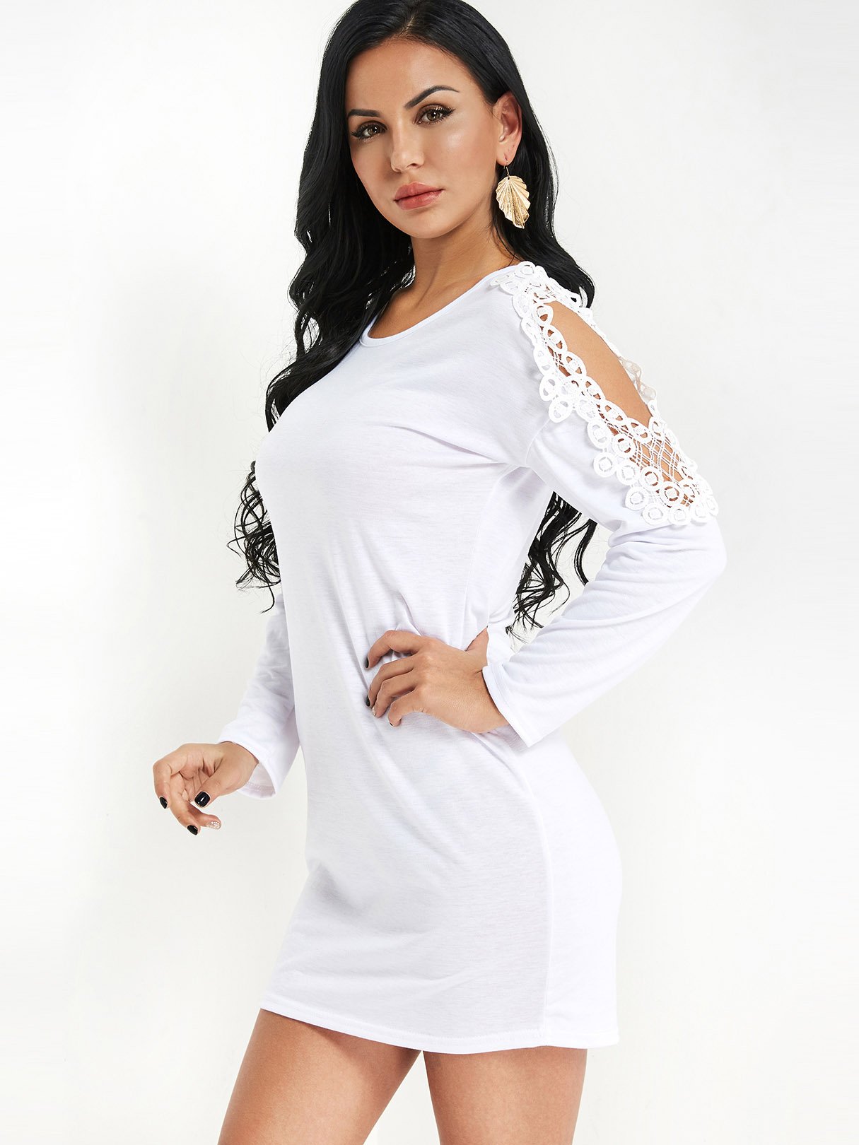 Round Neck Cold Shoulder Lace Long Sleeve Bodycon Hem White Mini Dress