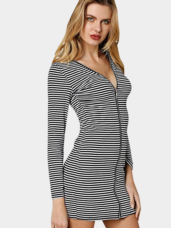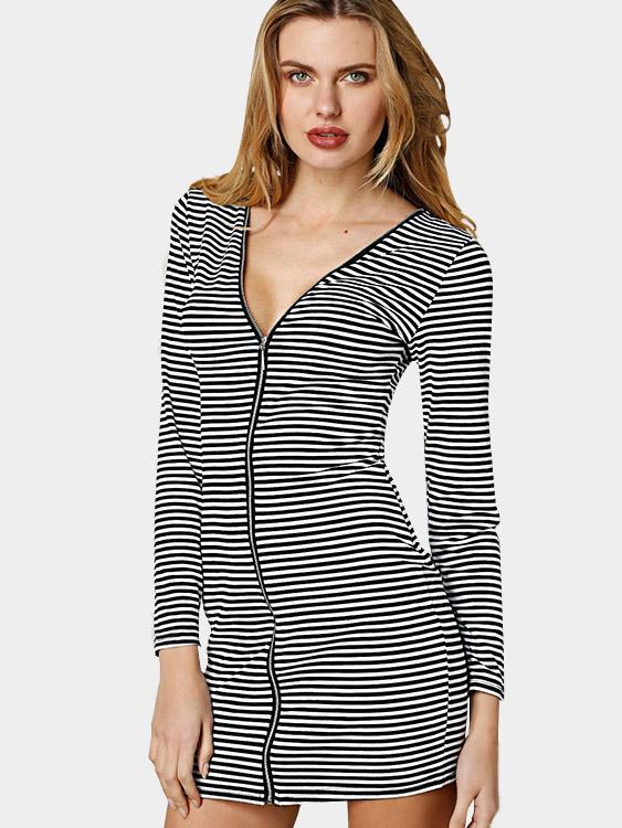 Round Neck Long Sleeve Stripe Zip Back Backless Mini Dresses