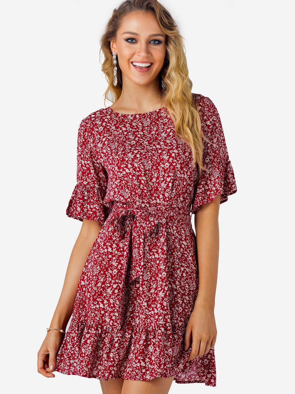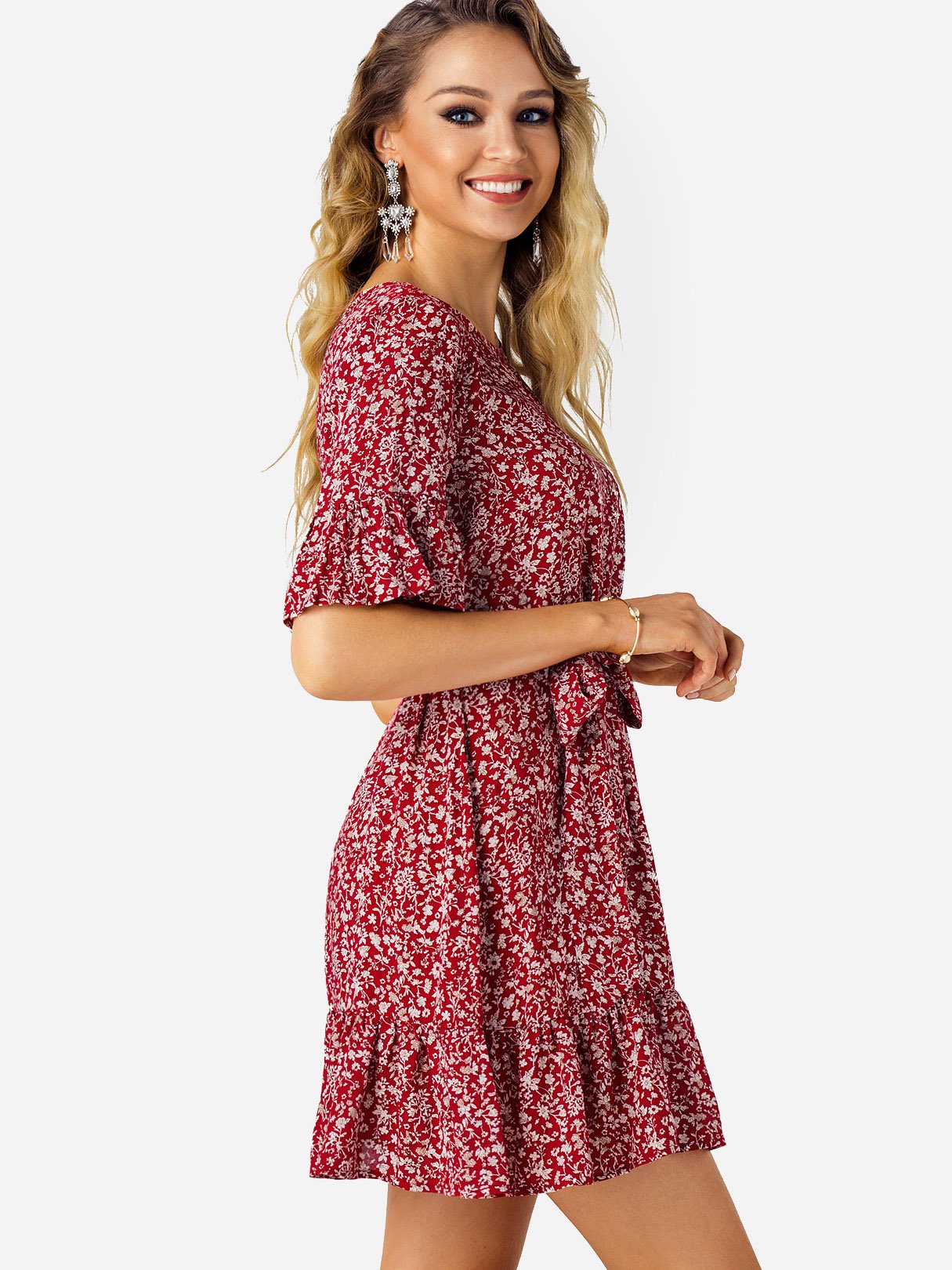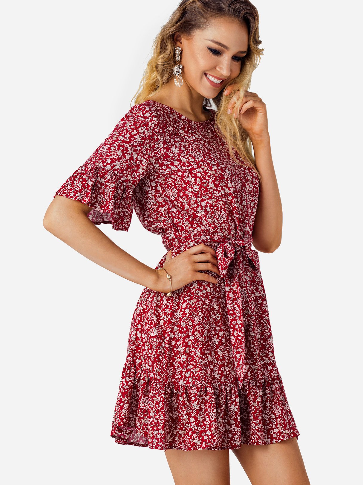 Scoop Neck Half Sleeve Floral Print Self-Tie Ruffle Hem Mini Dresses