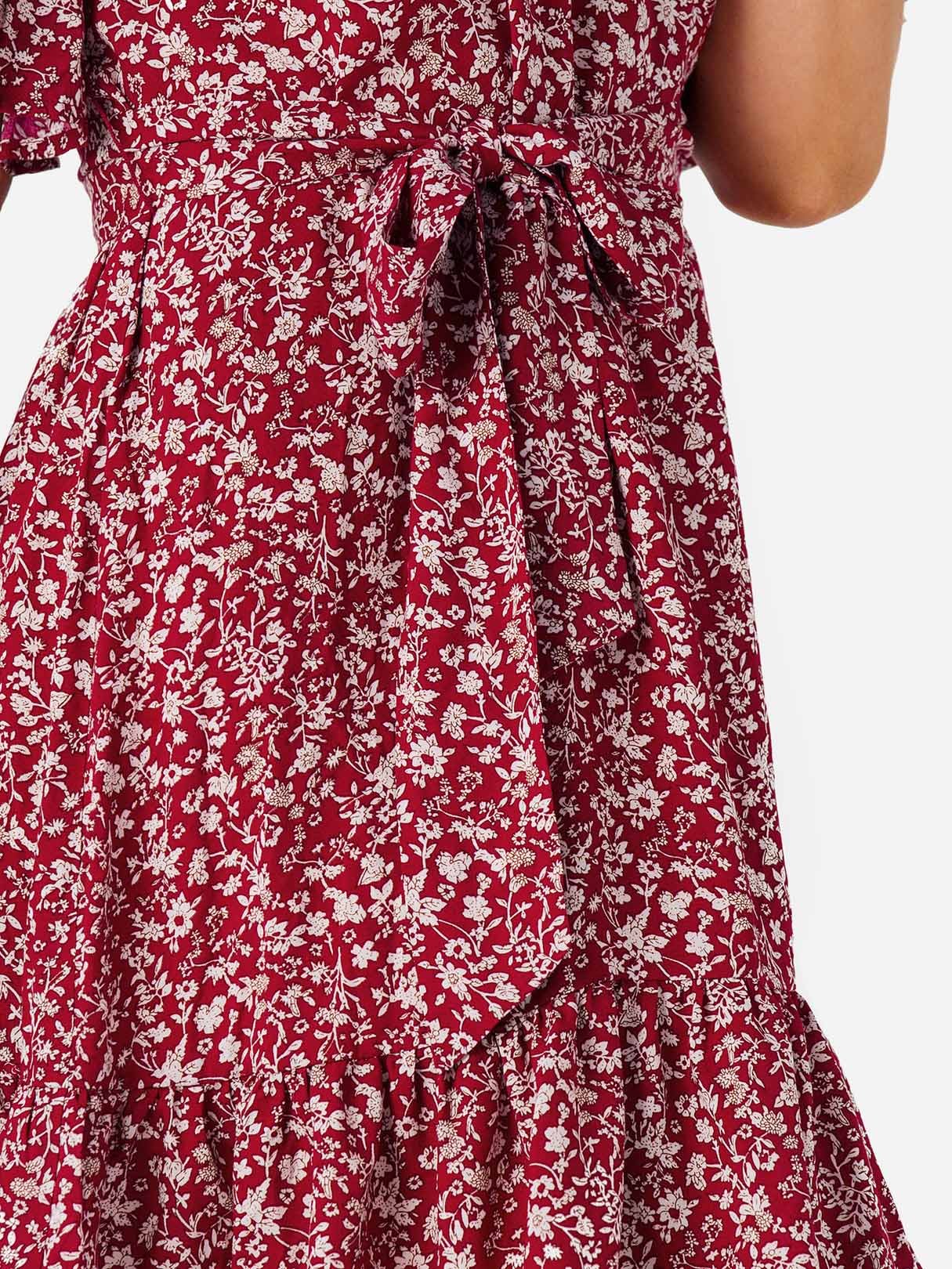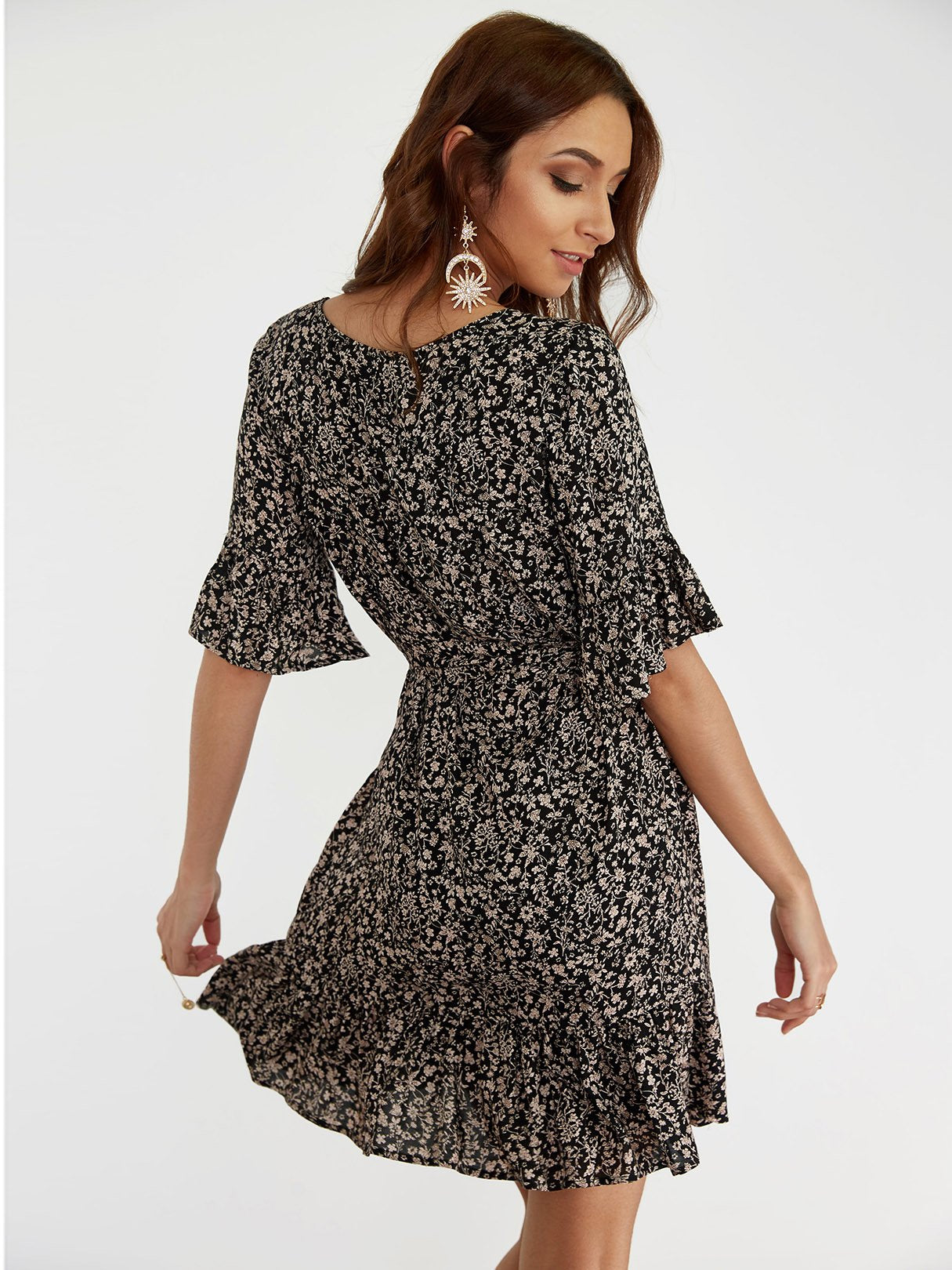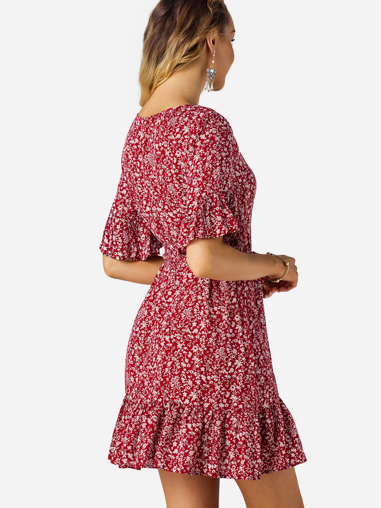 Scoop Neck Half Sleeve Floral Print Self-Tie Ruffle Hem Mini Dresses