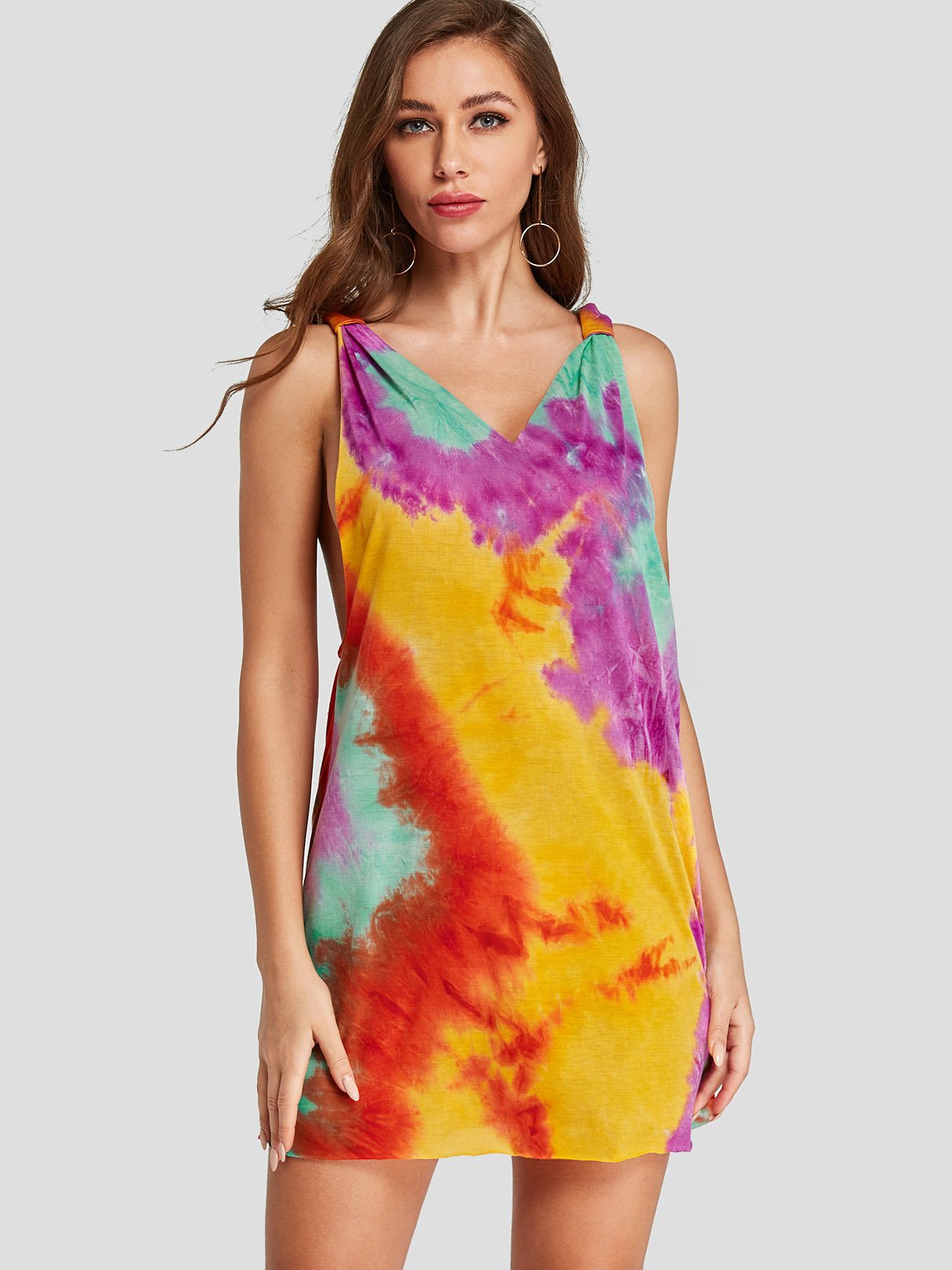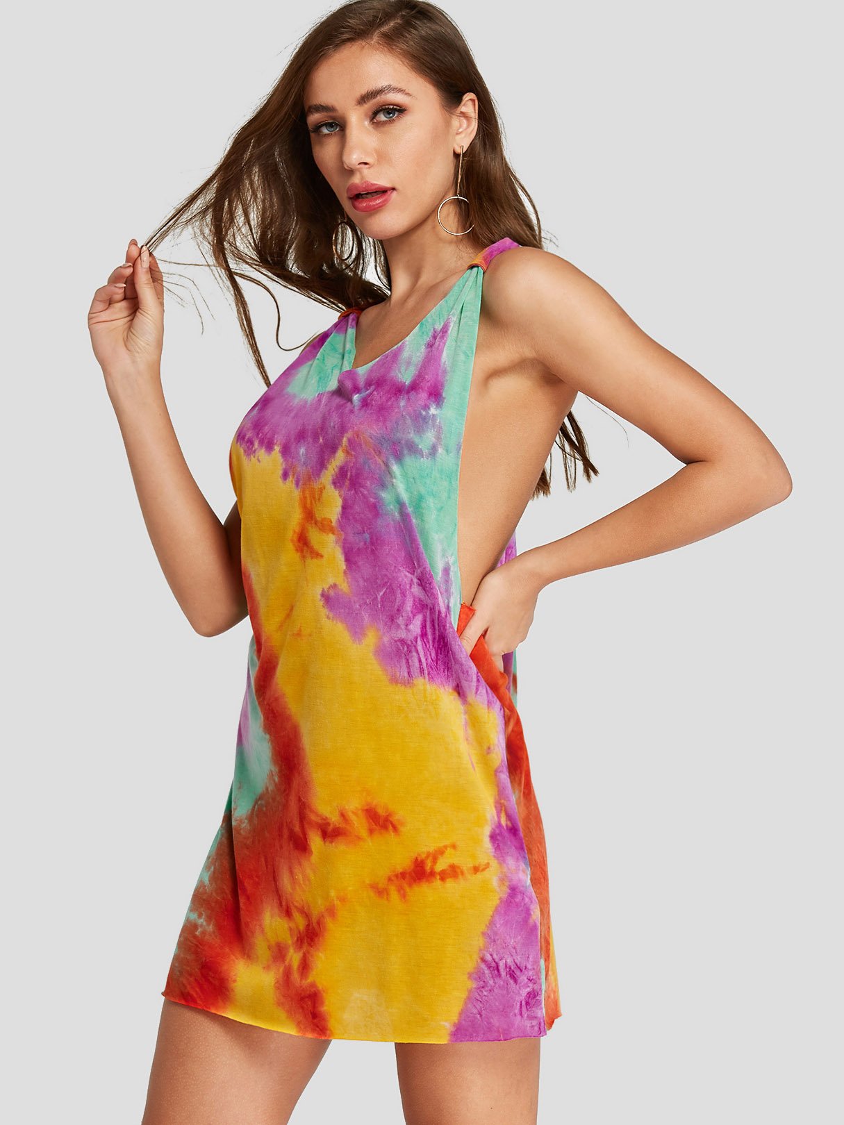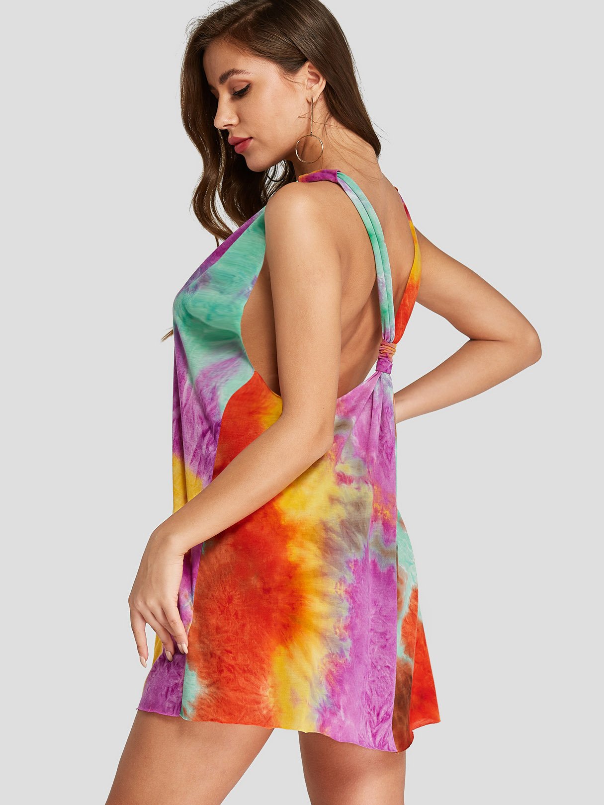 Material:PolyesterNeckline:V-NeckSeason:Spring,SummerSleeves:SleevelessStyle:Sexy StyleDetail:Backless DesignLength:MiniFit:Regular FitOccasion:Vacation