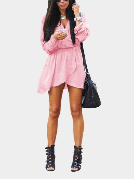 V-Neck Elastic Waist Irregular Hem Mini Dresses with Long Seeves