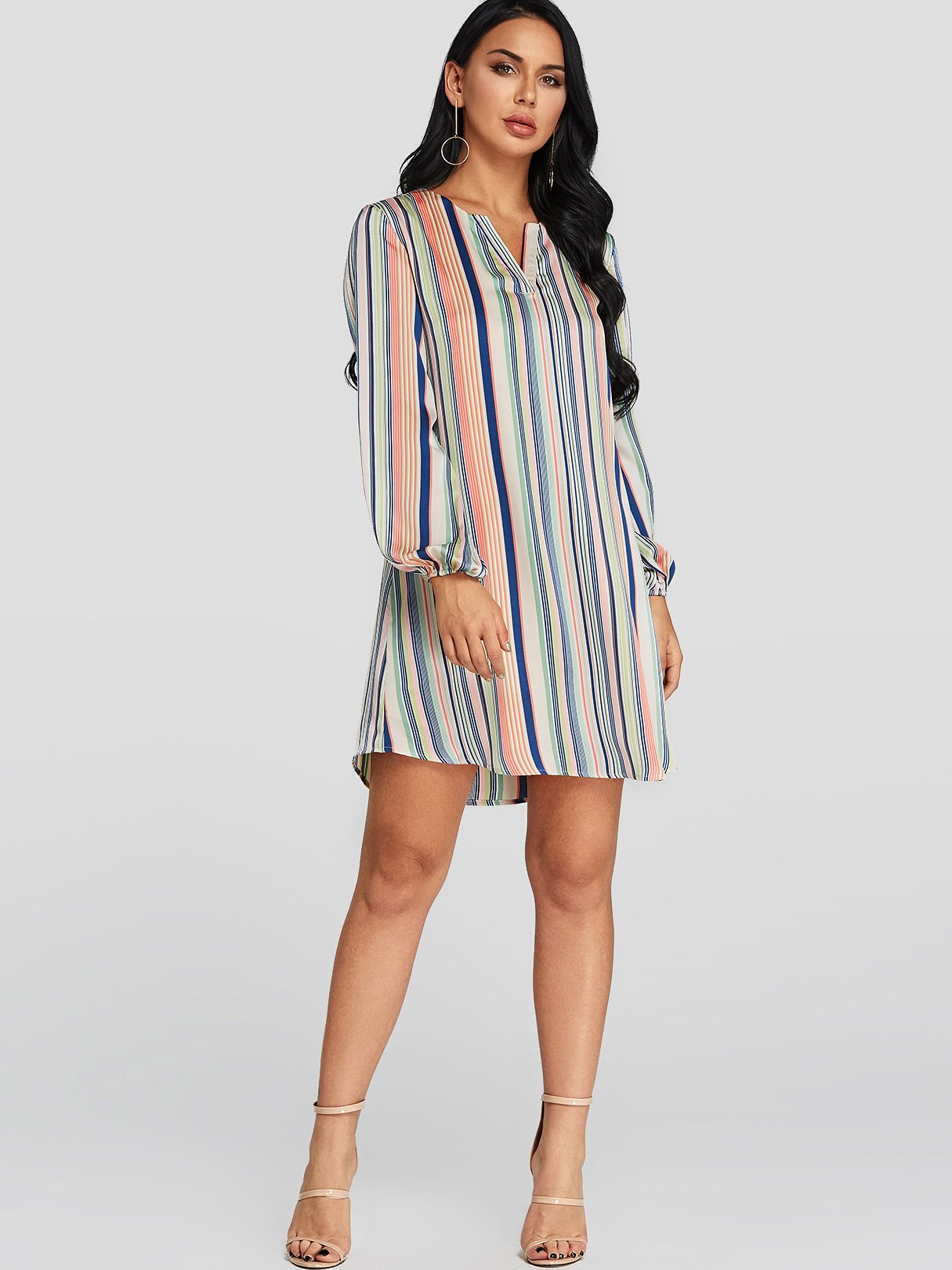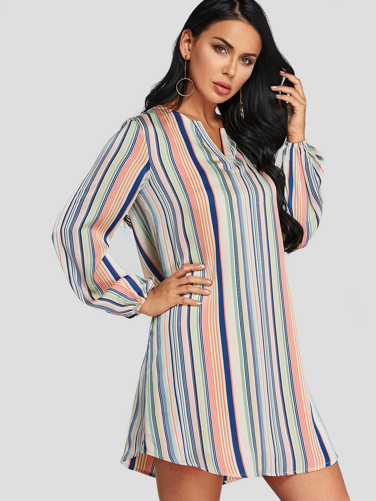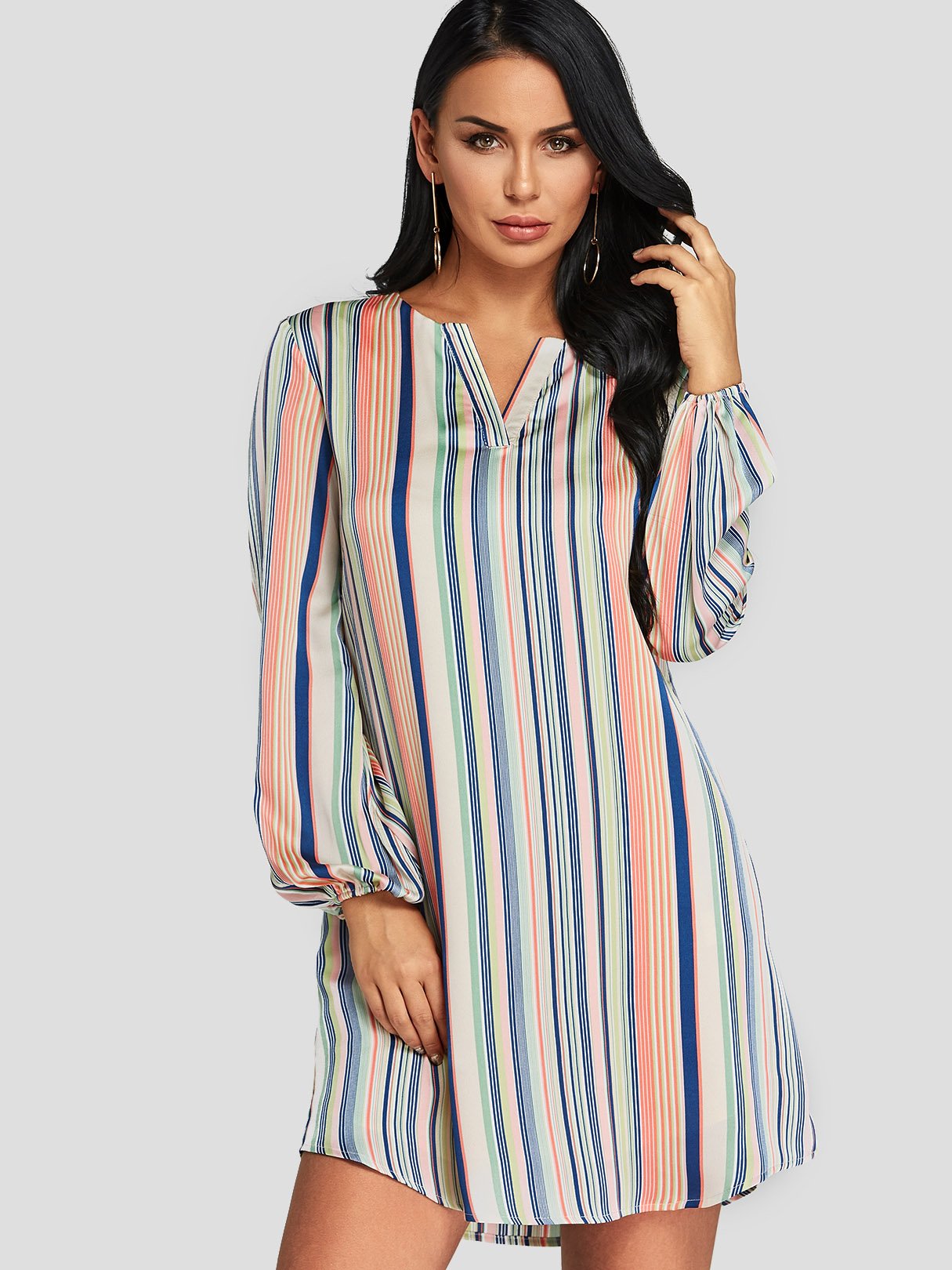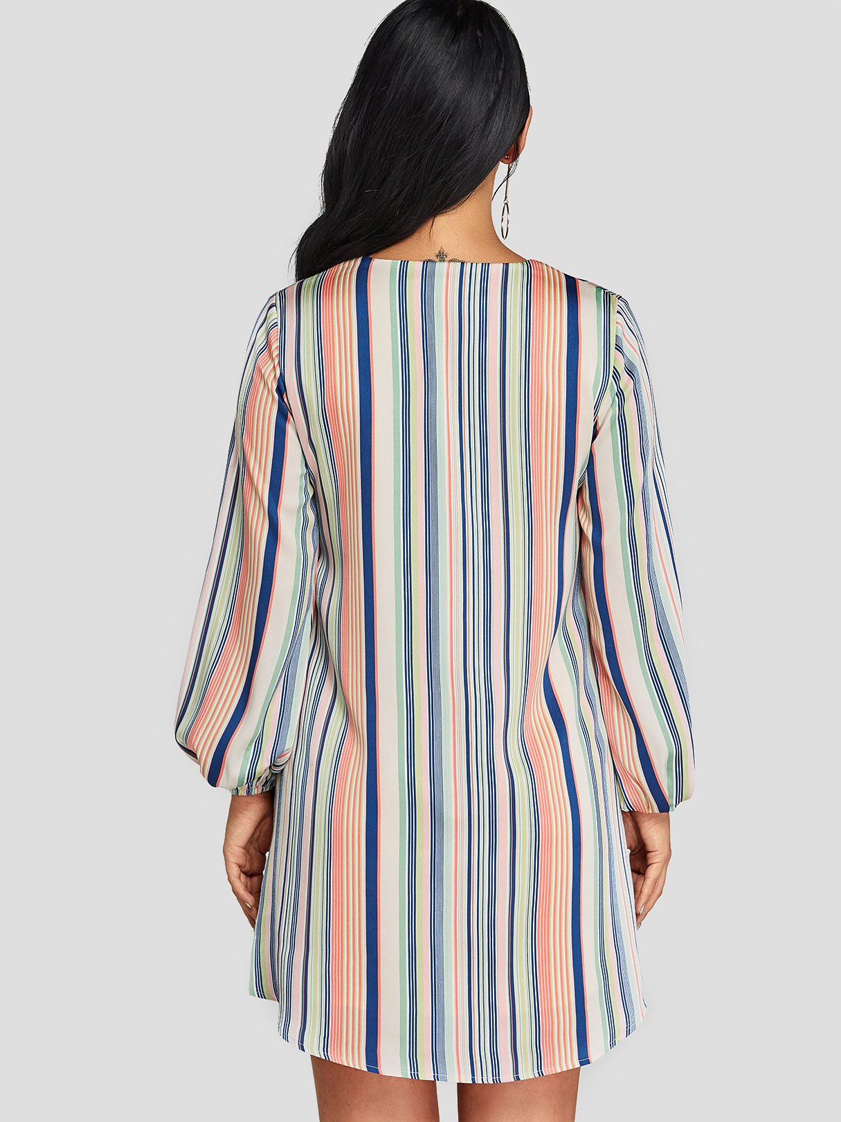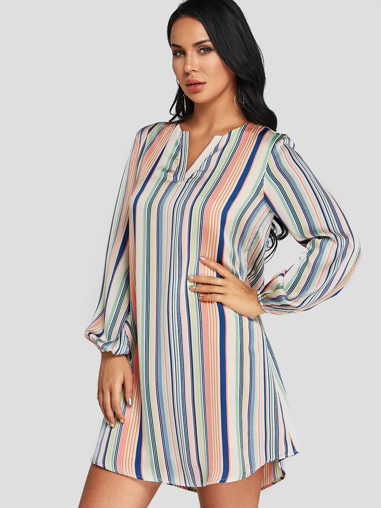 Material:PolyesterNeckline:V-NeckSeason:Spring,SummerSleeves:Long SleevesPattern:StripeStyle:Casual StyleHem Design:Curved HemLength:MiniFit:Loose FitSleeves Type:Elastic Sleeves
