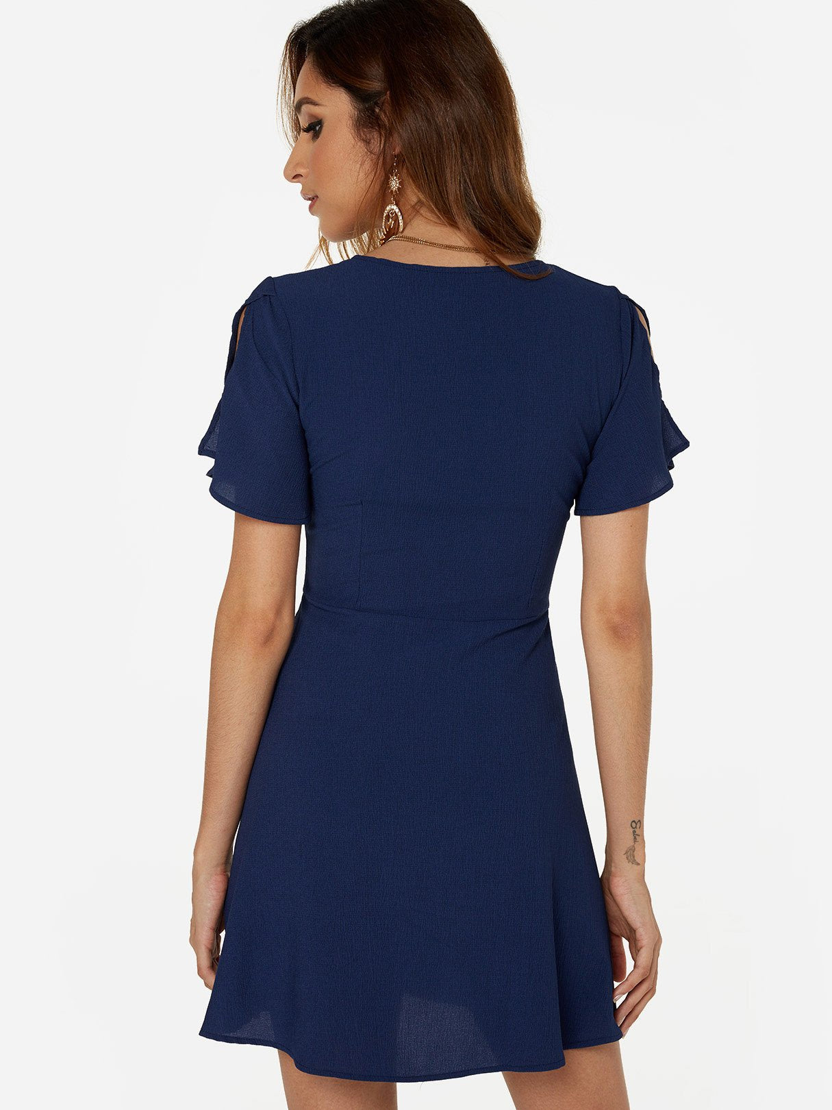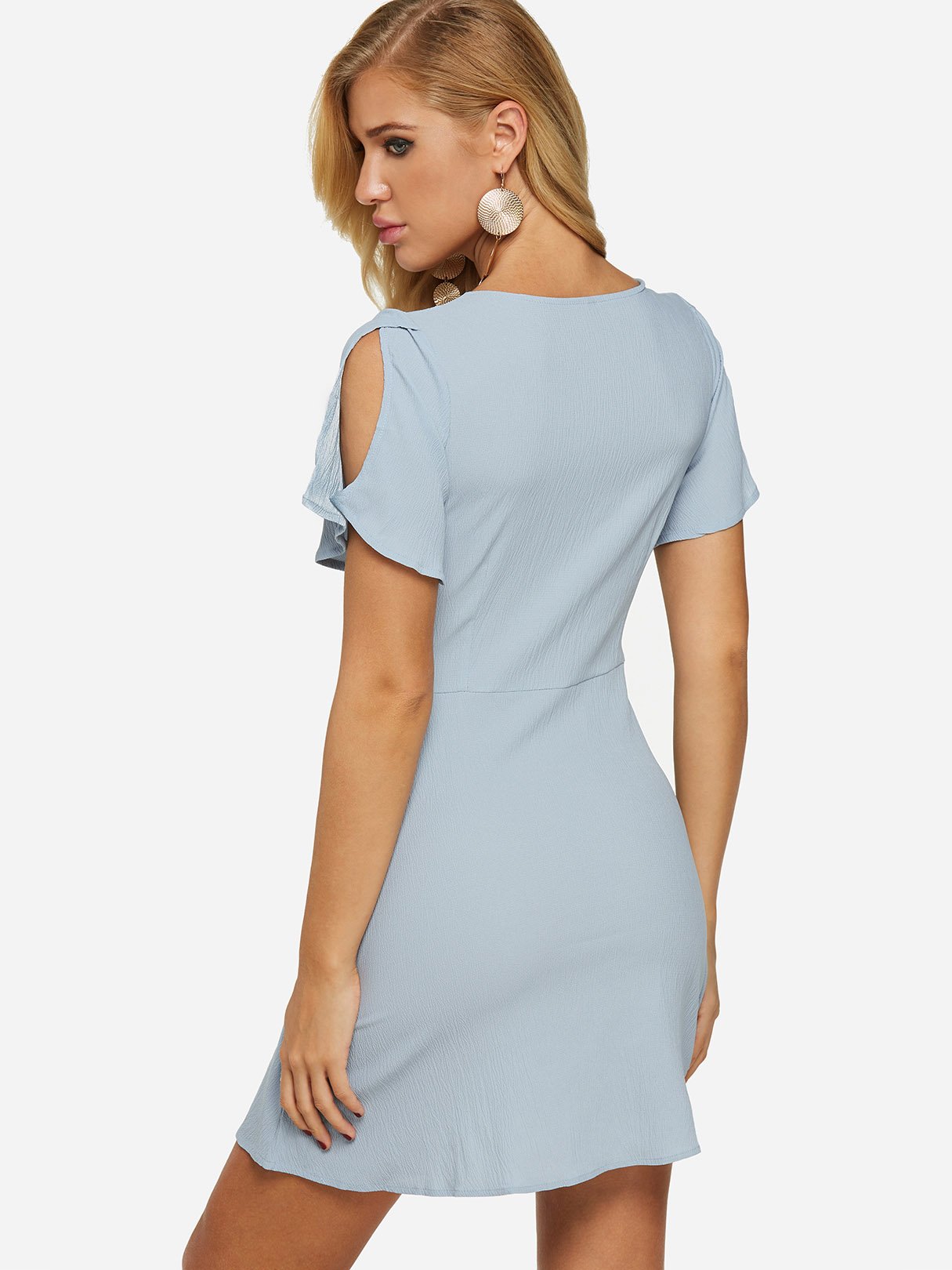 V-Neck Short Sleeve Slit Self-Tie High-Waisted Mini Dress - Blue / S is backordered and will ship as soon as it is back in stock.