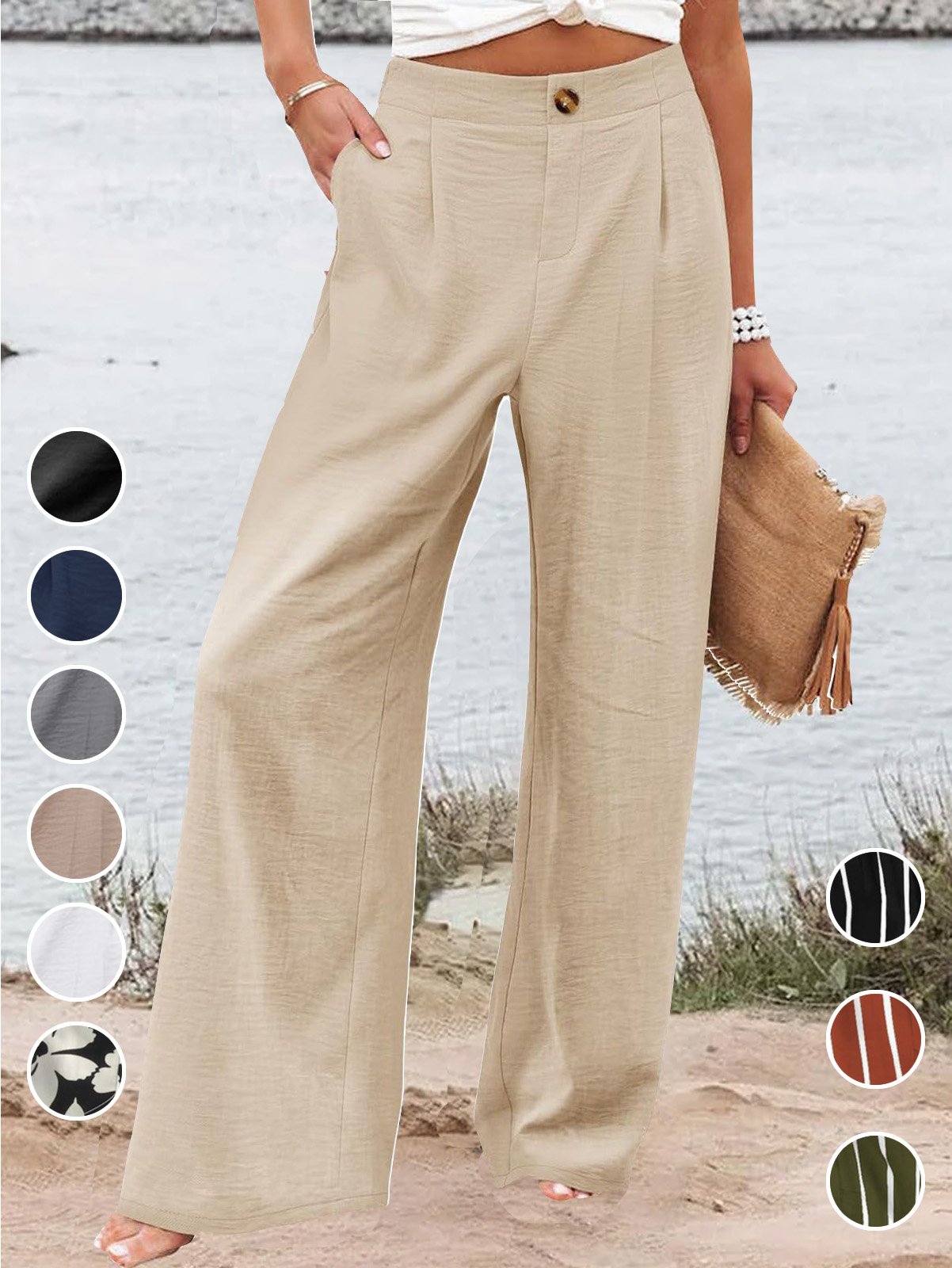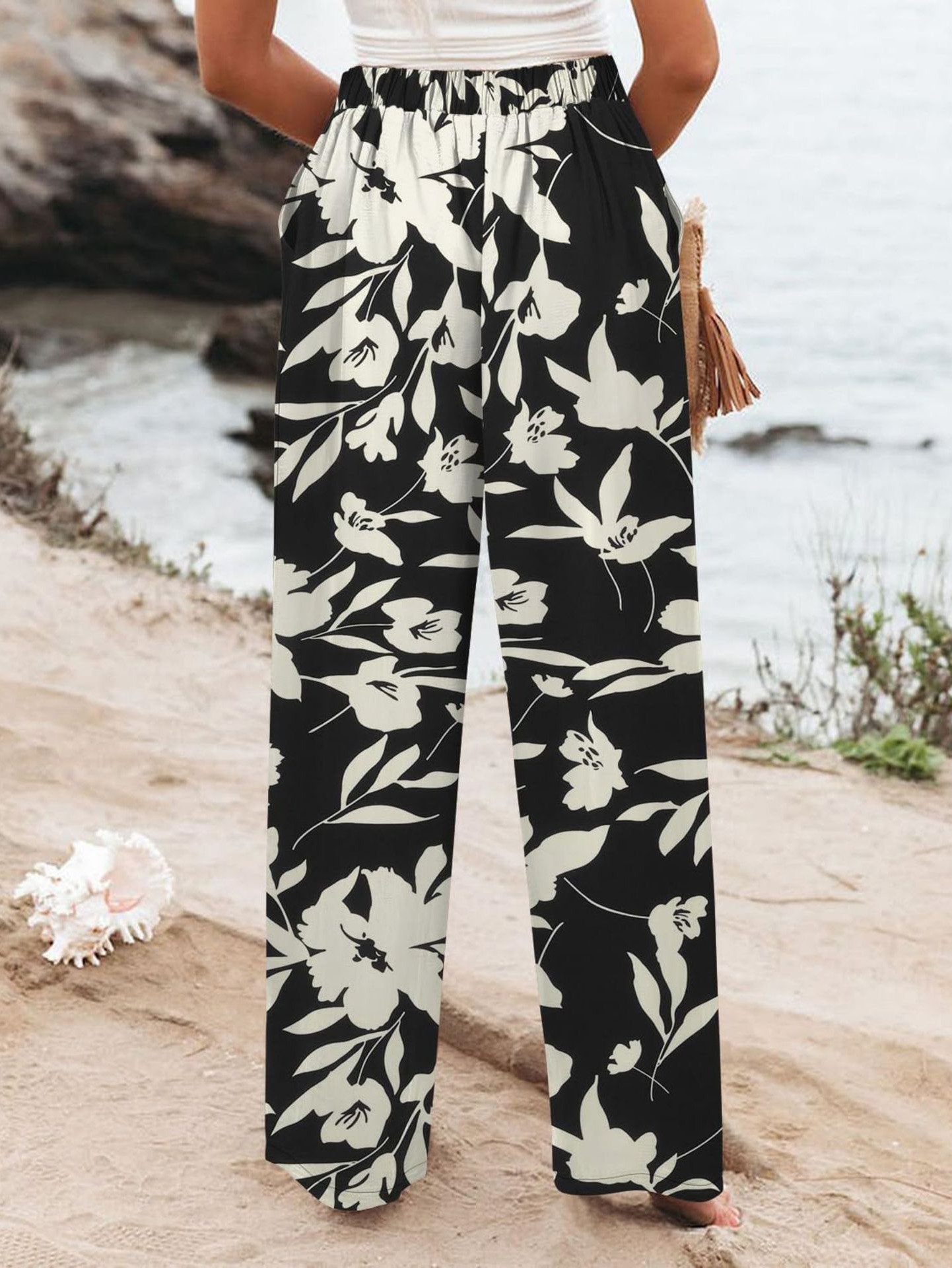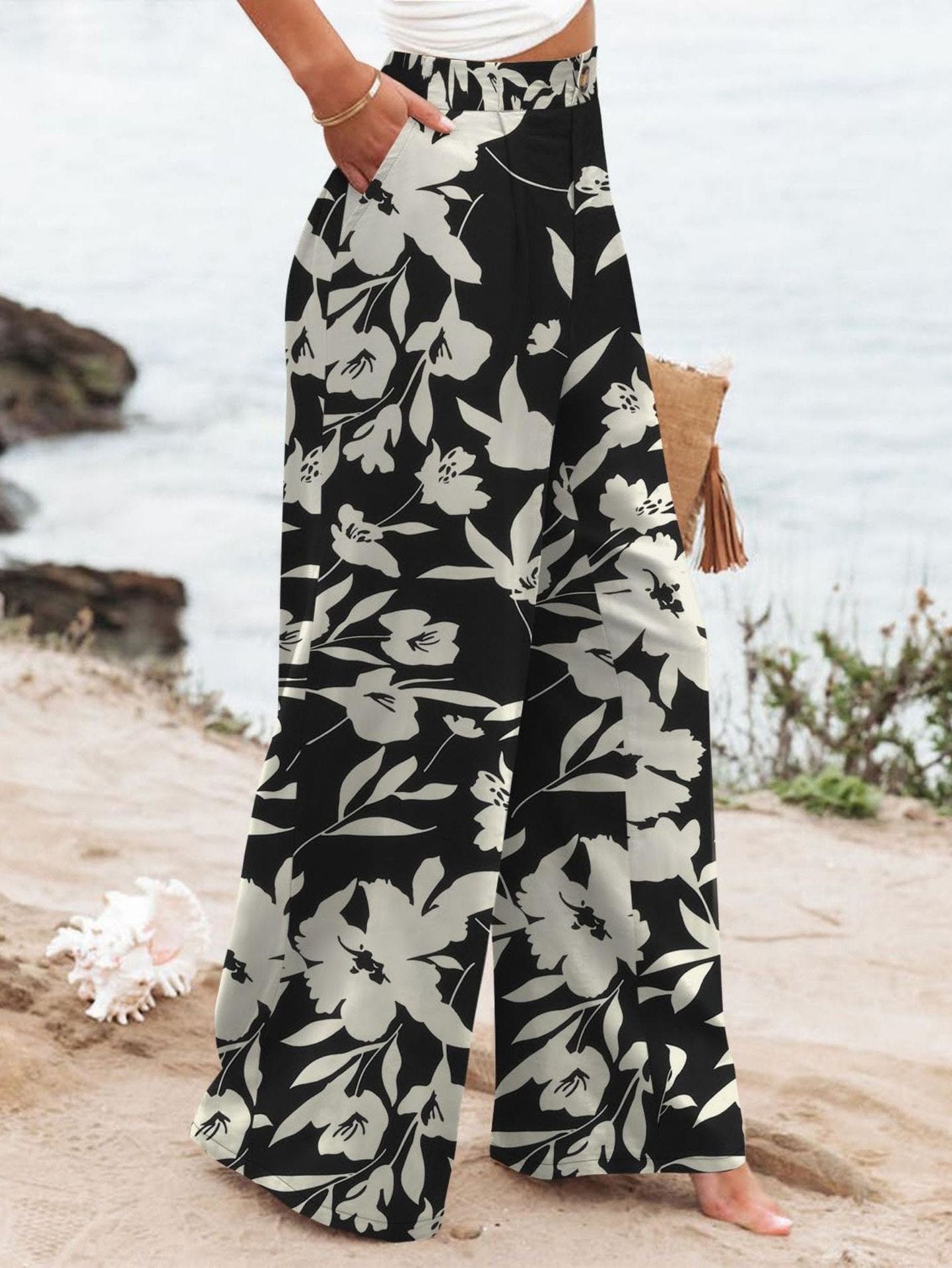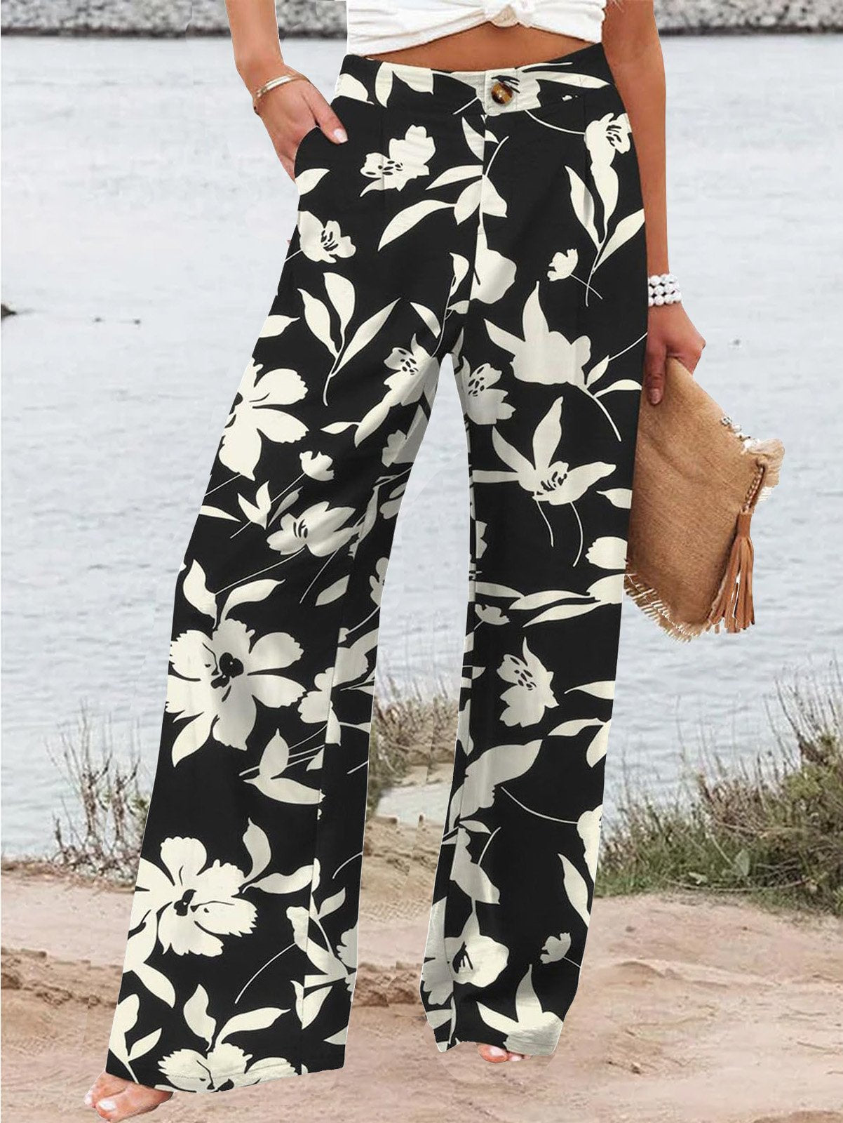 Fashion Floral Buckle Pocket Stitching Loose Long Pants