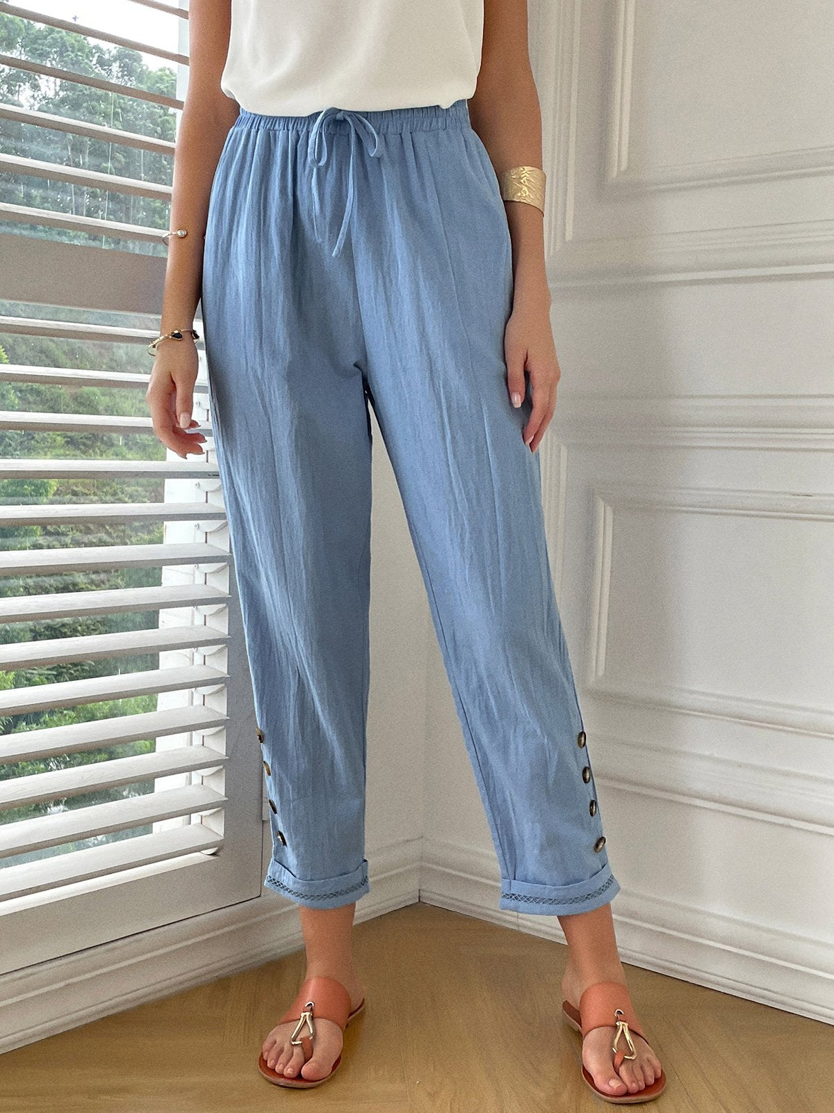 Fashion Plain Buttoned Loose Long Pants