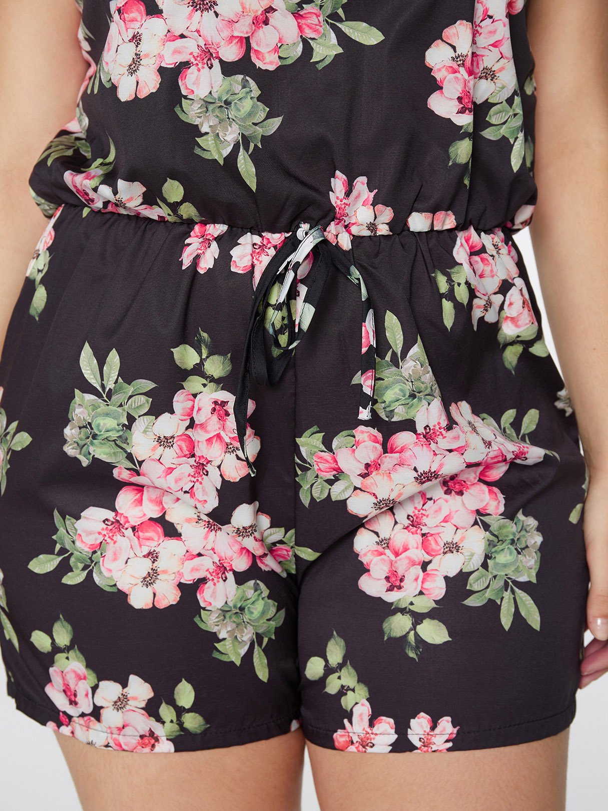 Material:PolyesterNeckline:BateauSeason:Spring,Summer,AutumnSleeves:SleevelessPattern:Floral PrintWaist Design:Drawstring WaistHem Design:Bodycon HemType:JumpsuitsLength:ShortFit:Regular Fit