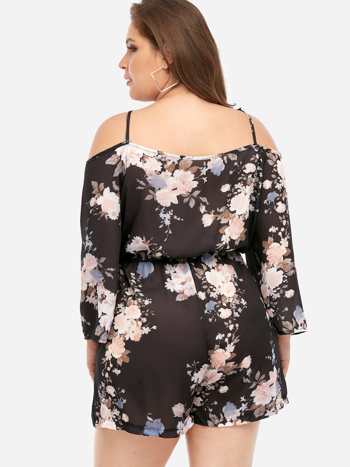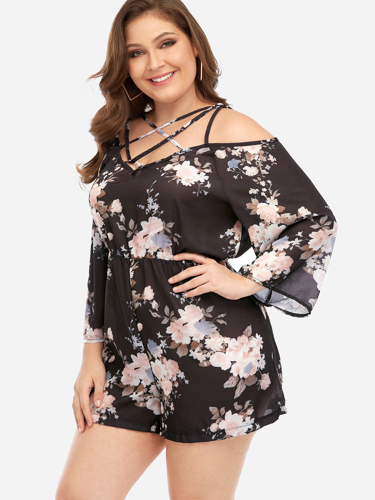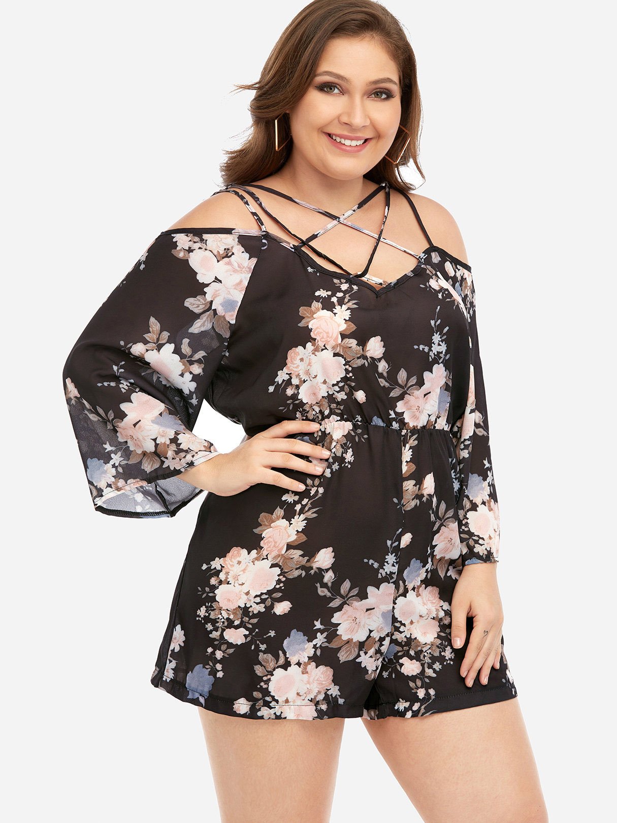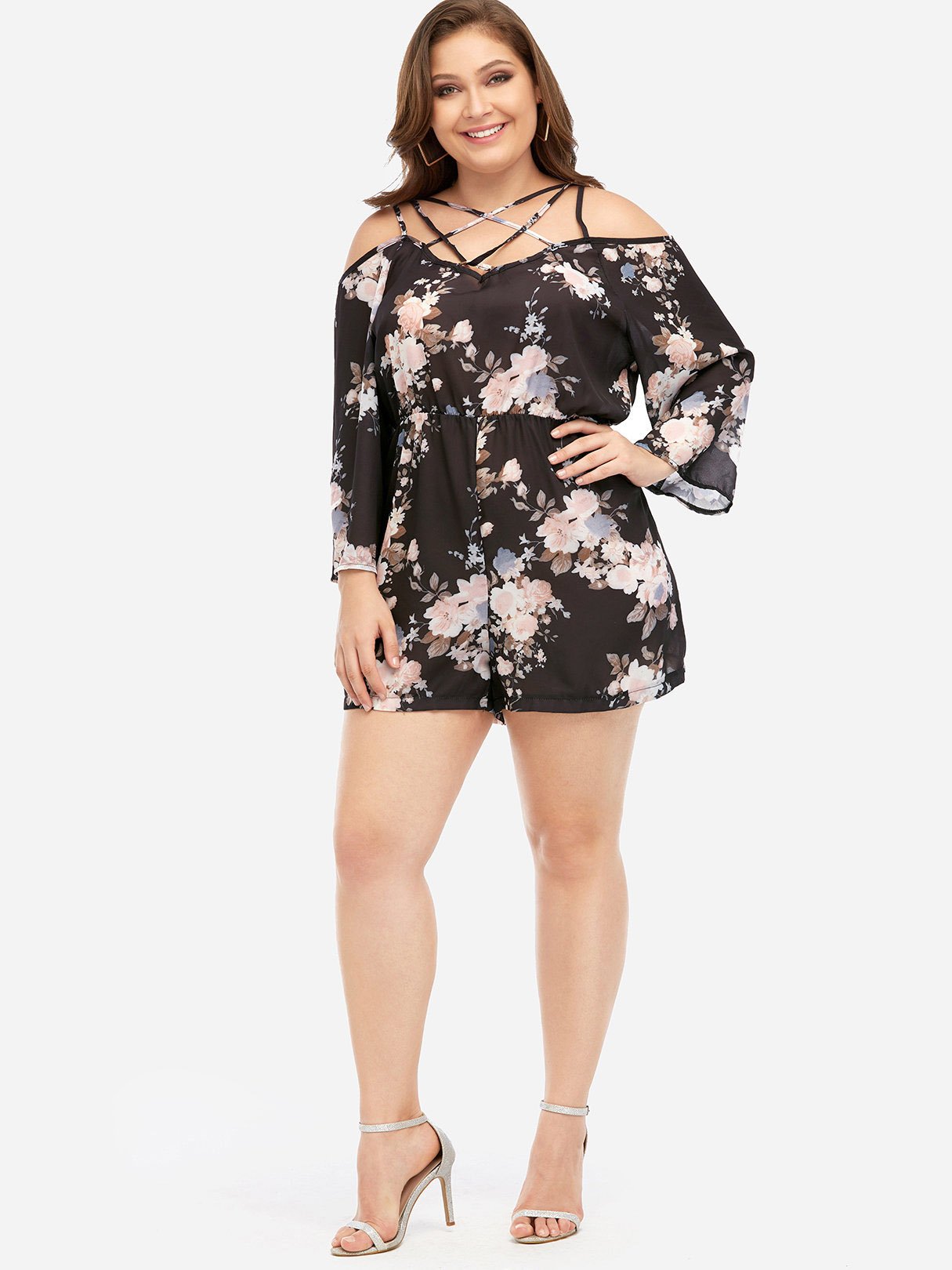Cold Shoulder Floral Print Criss-Cross Long Sleeve Black Plus Size Bottoms - Black / XL is backordered and will ship as soon as it is back in stock.