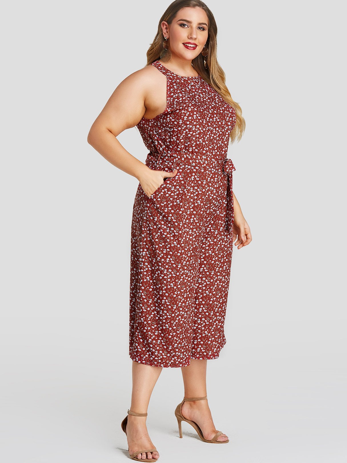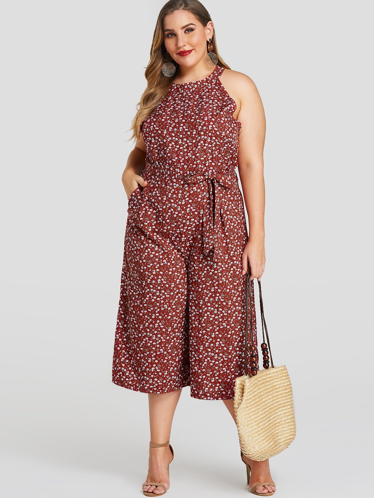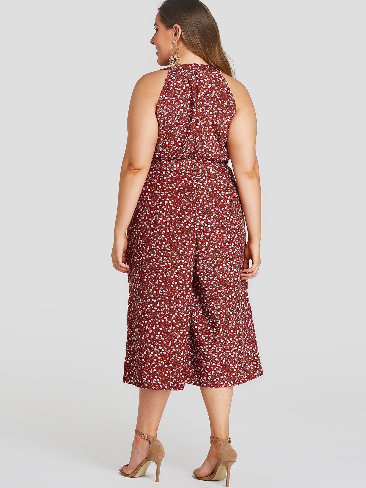 Material:PolyesterNeckline:HalterSeason:Spring,SummerSleeves:SleevelessPattern:CalicoDetail:Wide Leg,Self-Tie DesignWaist Design:High-WaistedType:JumpsuitsFit:Regular FitOccasion:Work,Vacation,Cocktail