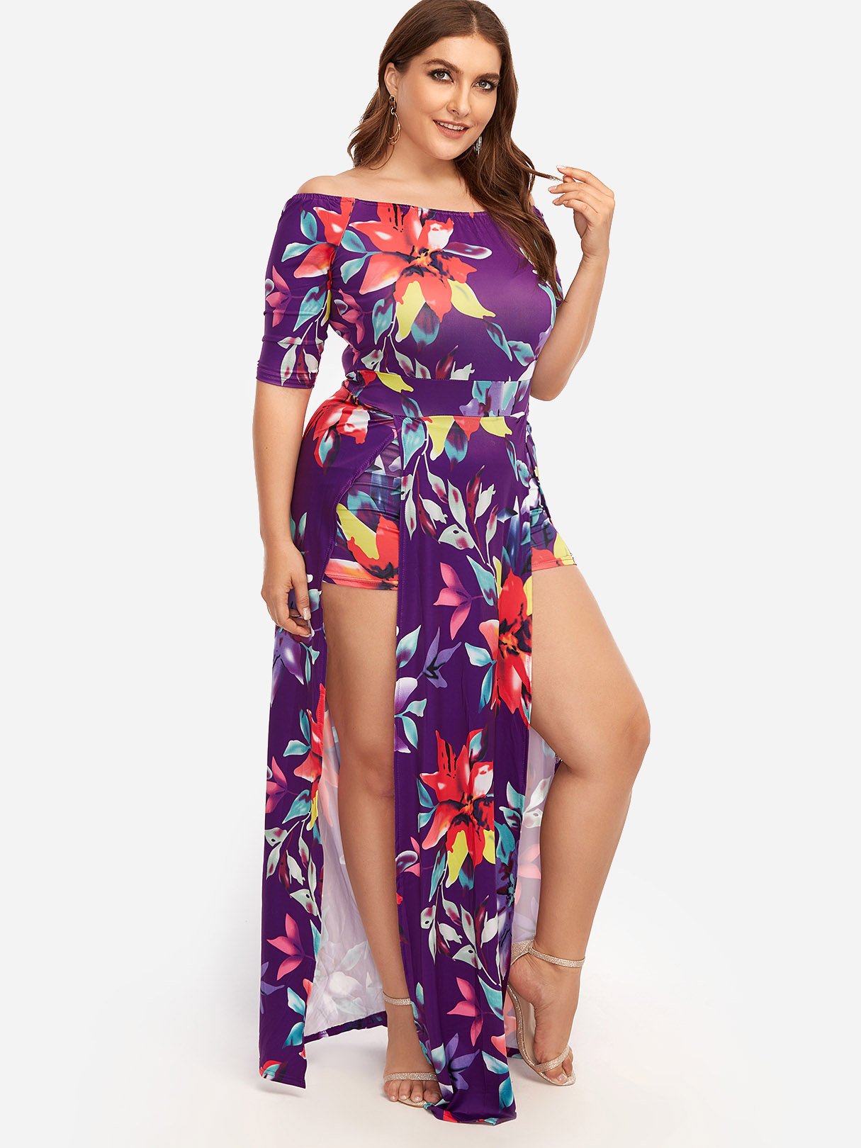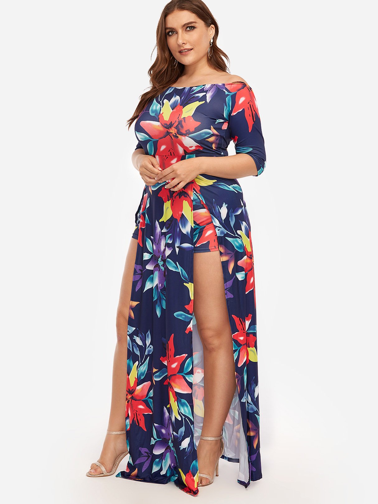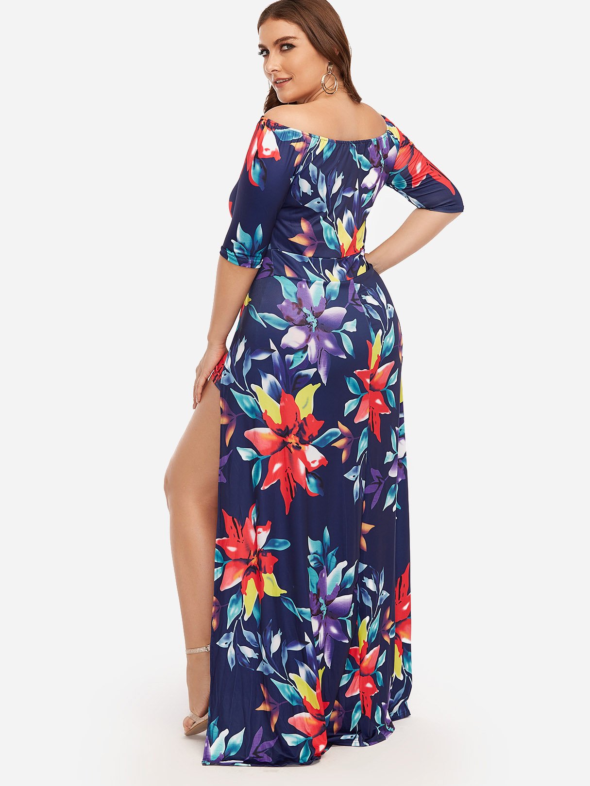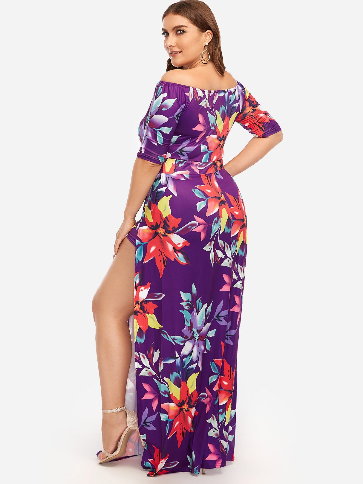 Material:PolyesterNeckline:Off The ShoulderSeason:Spring,Summer,AutumnSleeves:Half SleevesPattern:Fantasy ColourStyle:Sexy StyleDetail:Elastic Strap Back Detail,Slit DesignHem Design:Slit HemLength:LongFit:Regular Fit
