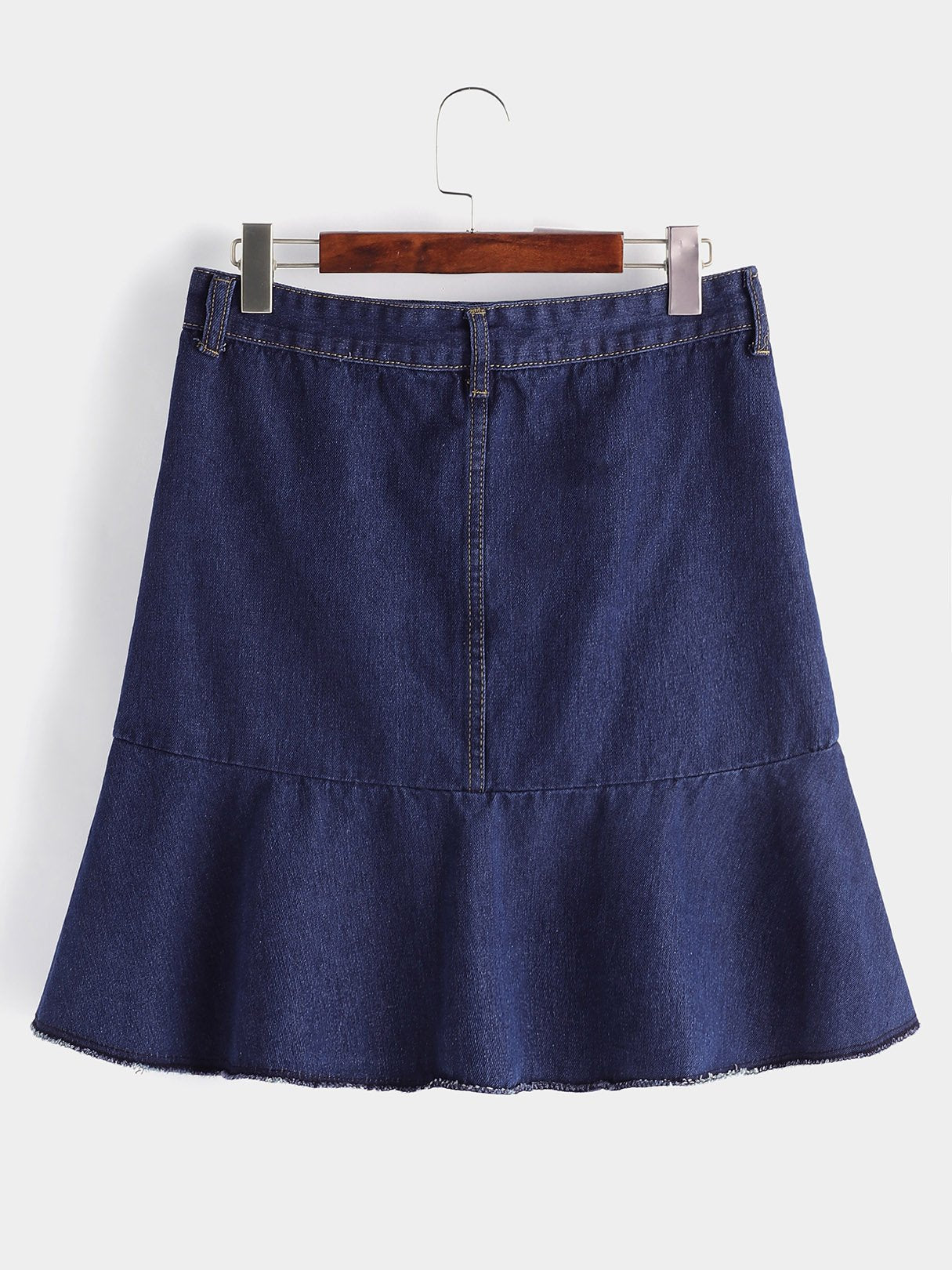 Material:DenimSeason:Spring,Summer,AutumnPattern:PlainButton Design:Zipper DesignHem Design:Flounced HemType:DenimLength:MiniFit:Regular Fit