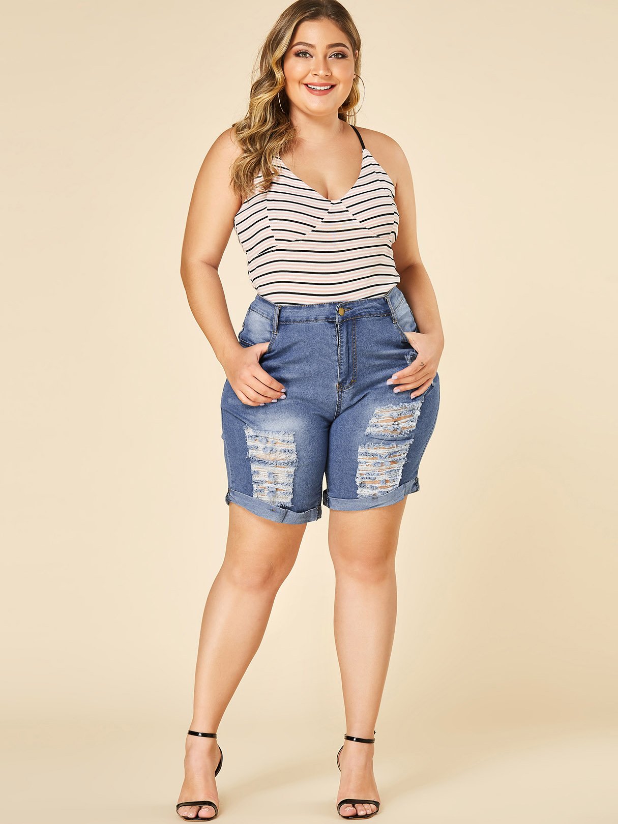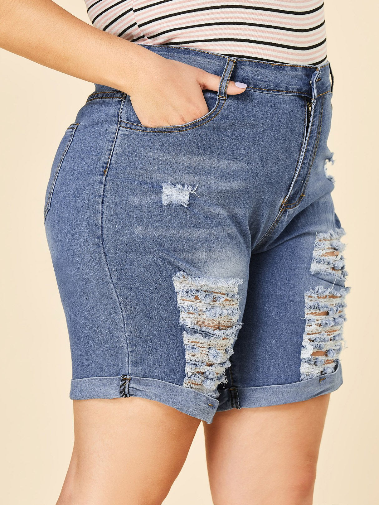 Material:PolyesterSeason:Spring,SummerPattern:PlainStyle:Casual StyleDetail:Random Ripped DetailsWaist Design:Middle-WaistedFit:Regular Fit