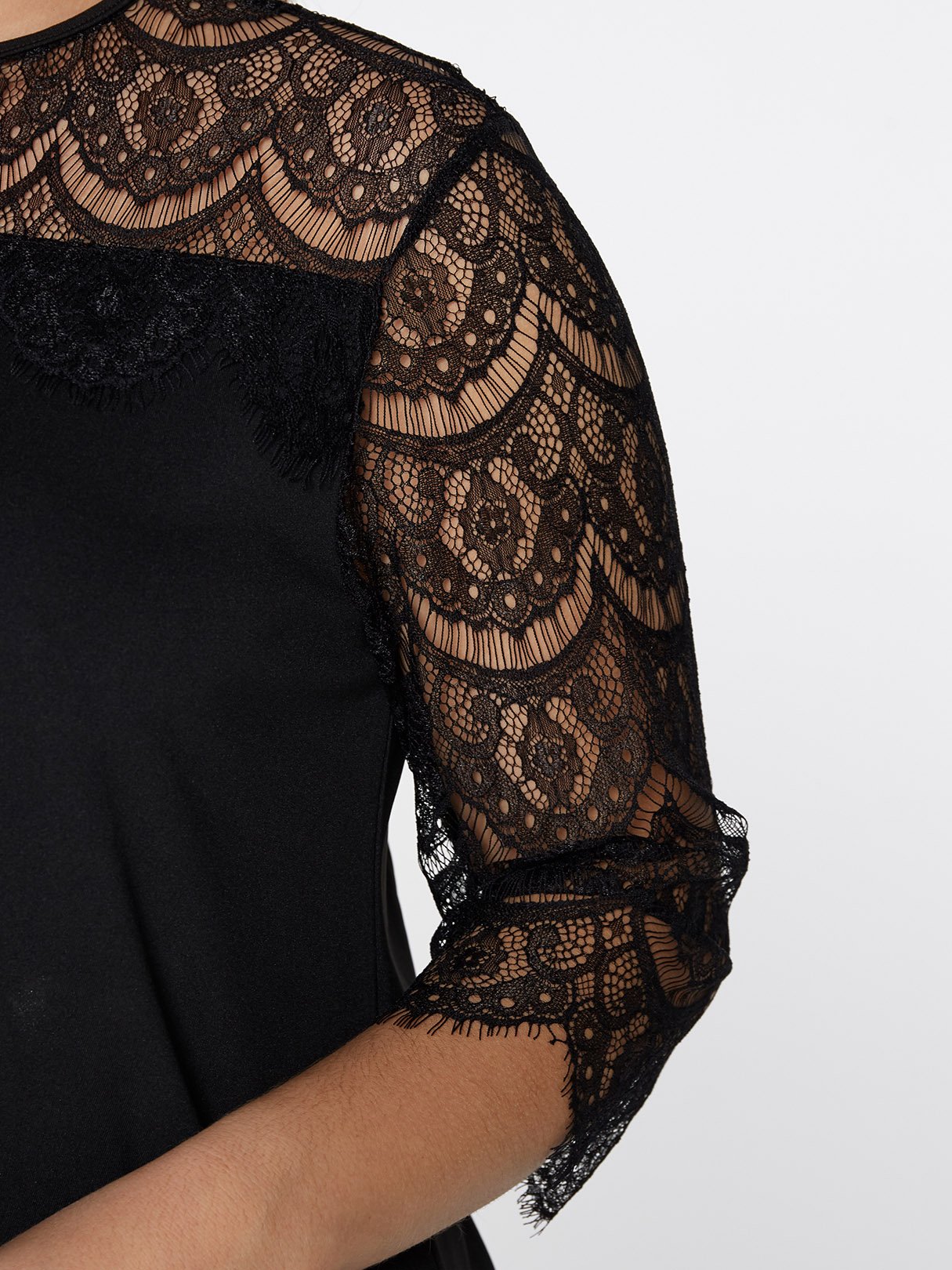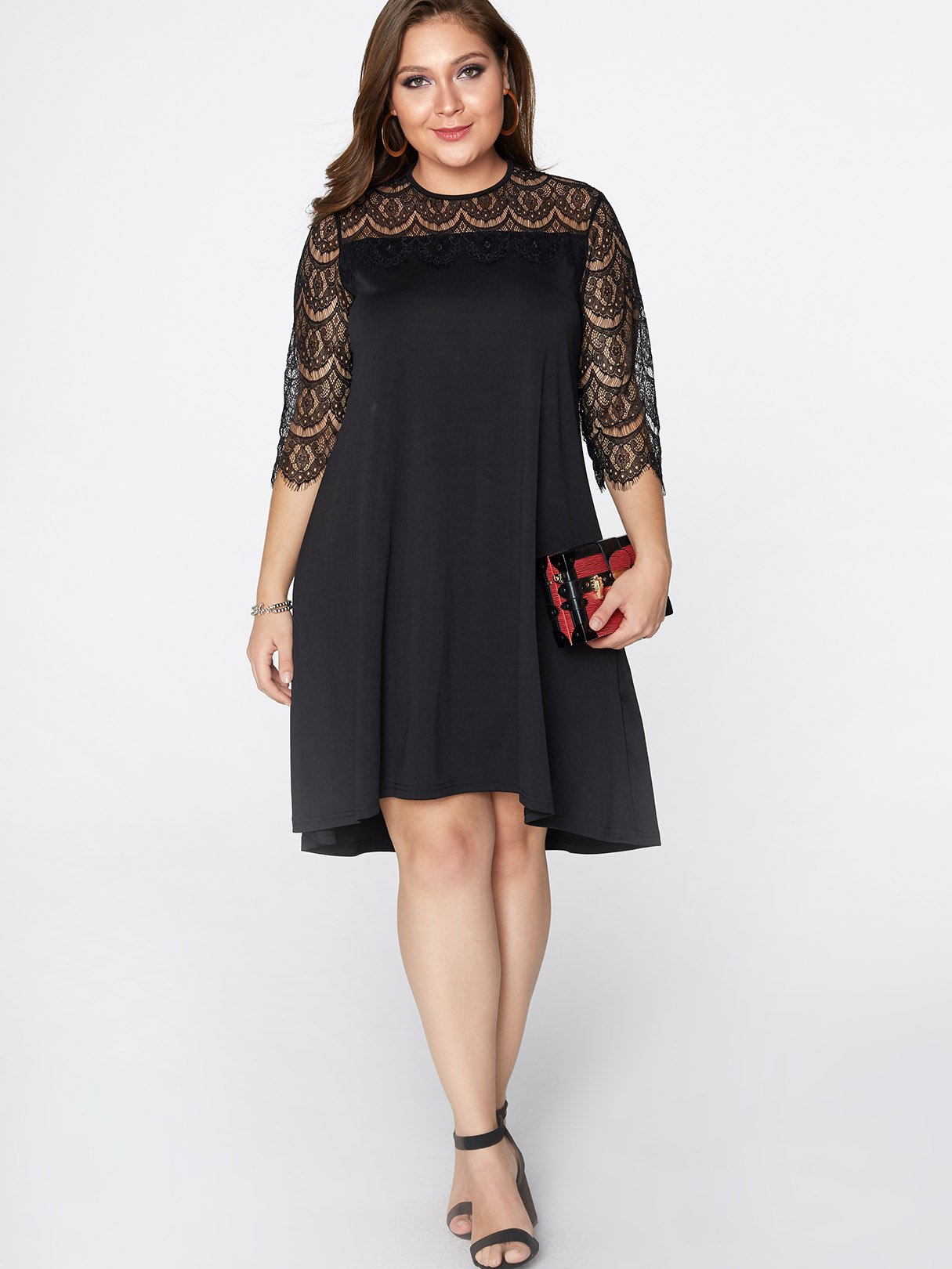 Material:Cotton,PolyesterNeckline:BateauSeason:Spring,Summer,AutumnSleeves:3/4 Length SleevesPattern:PlainStyle:Ladies Style,Little Black DressDetail:Lace,Hollow Design,See Through DesignLength:MidiFit:Regular Fit