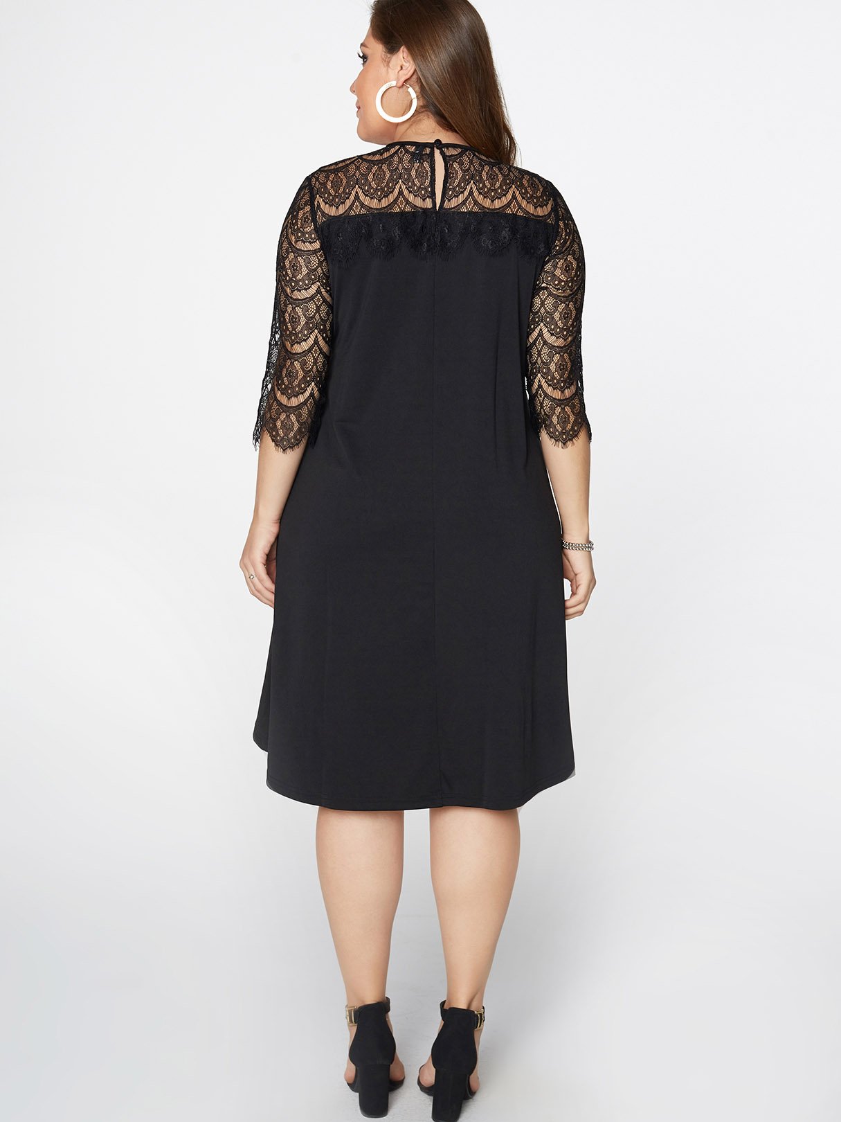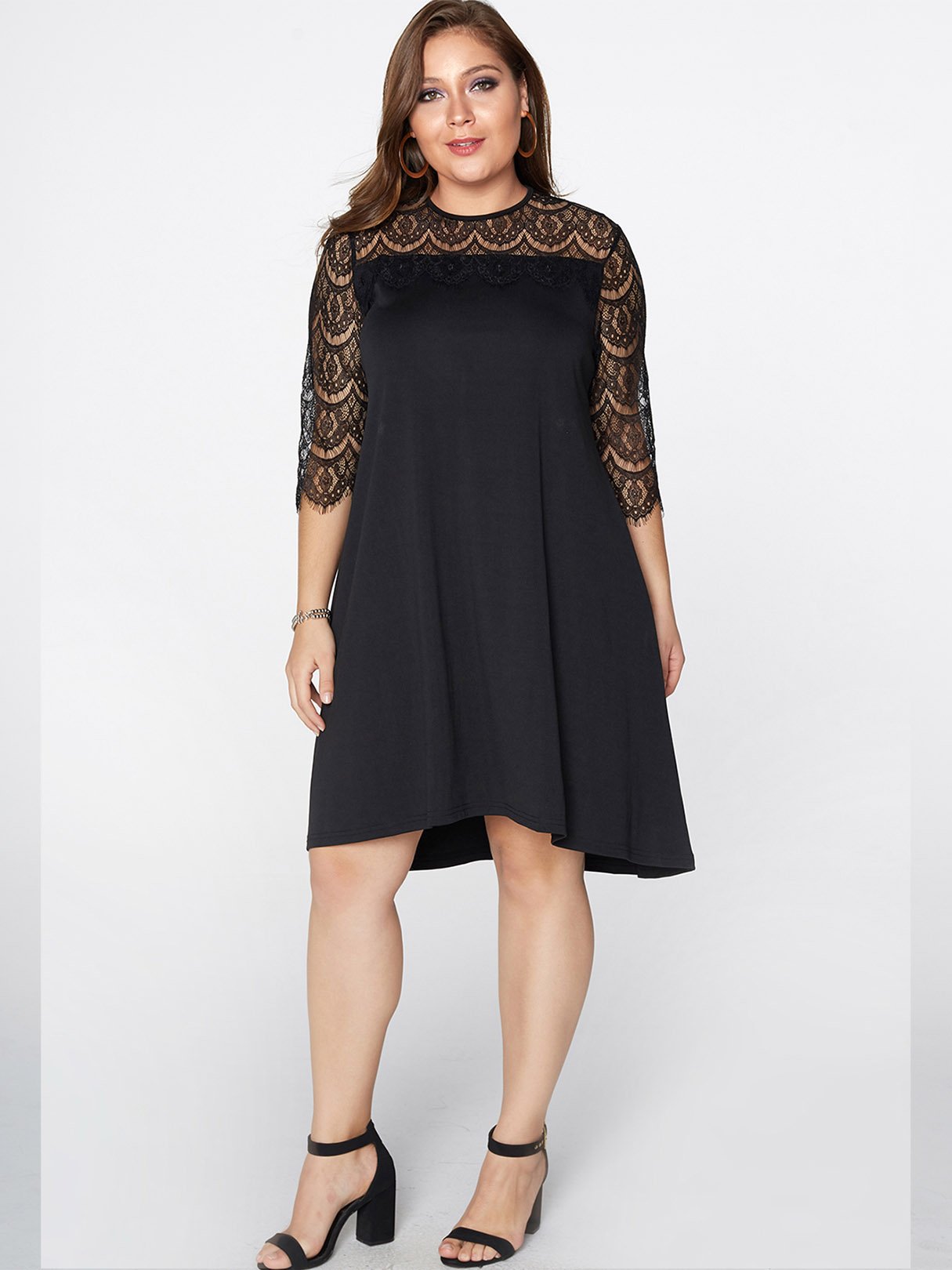 Bateau Plain Lace Hollow See Through 3/4 Sleeve Black Plus Size Dresses - Black / XL is backordered and will ship as soon as it is back in stock.