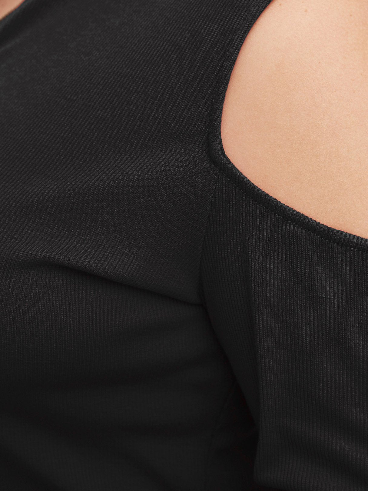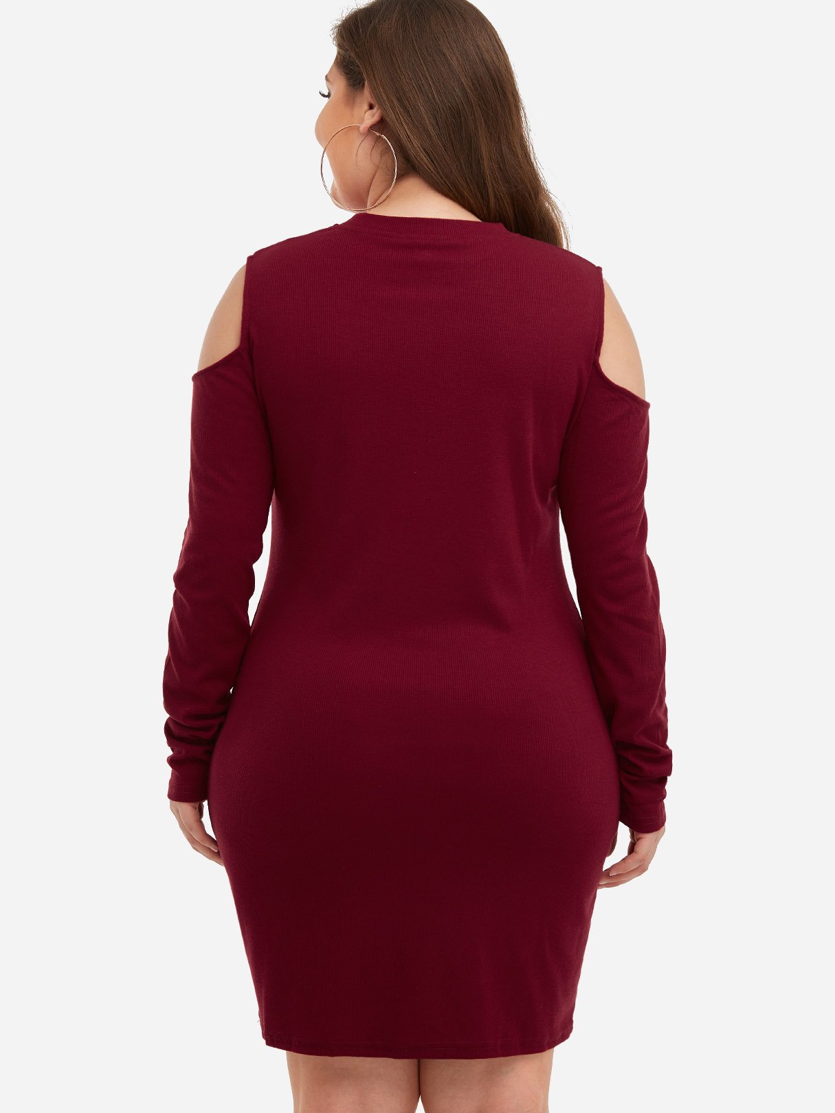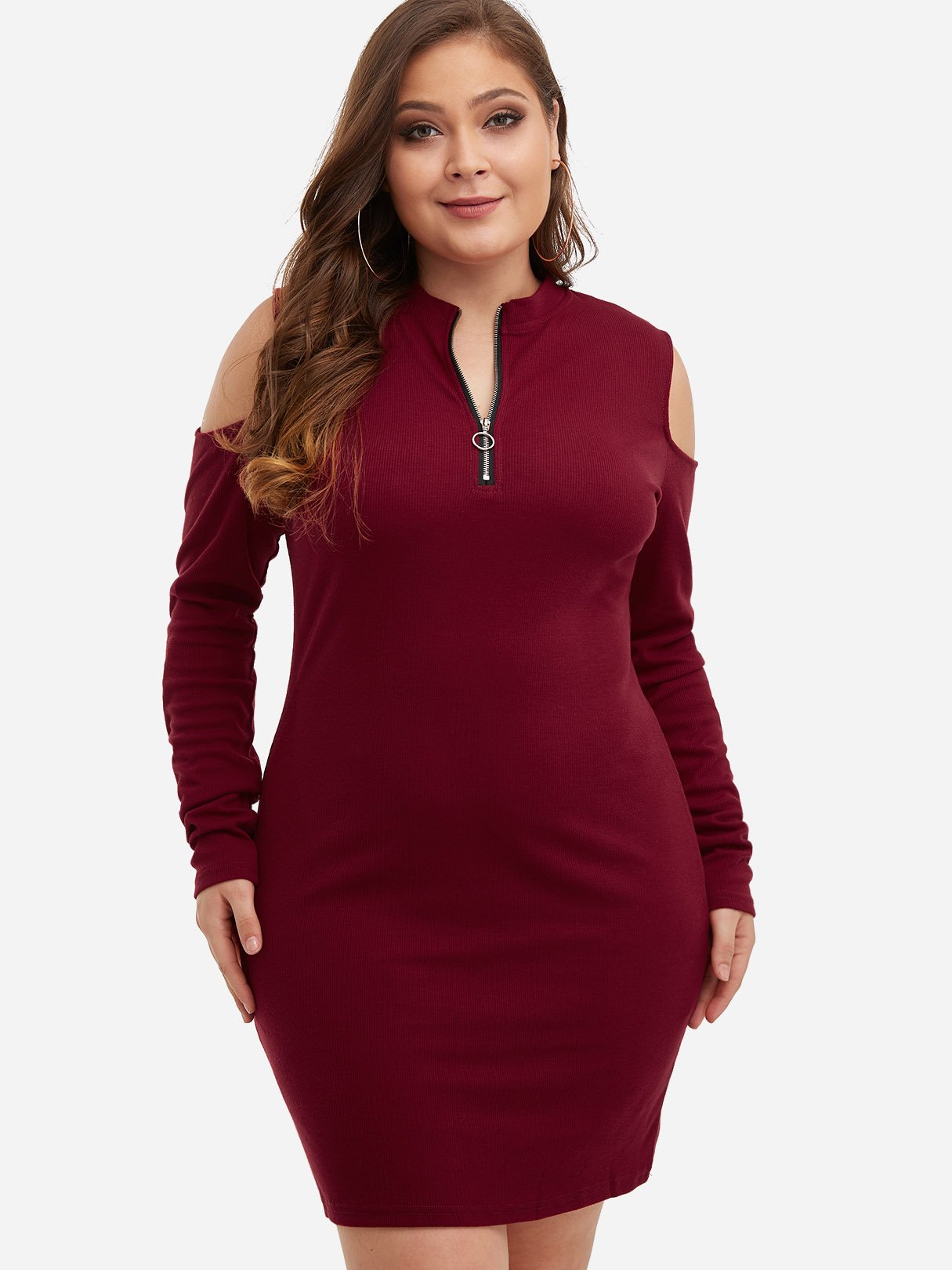 Crew Neck Cold Shoulder Plain Zip Front Long Sleeve Plus Size Dress
