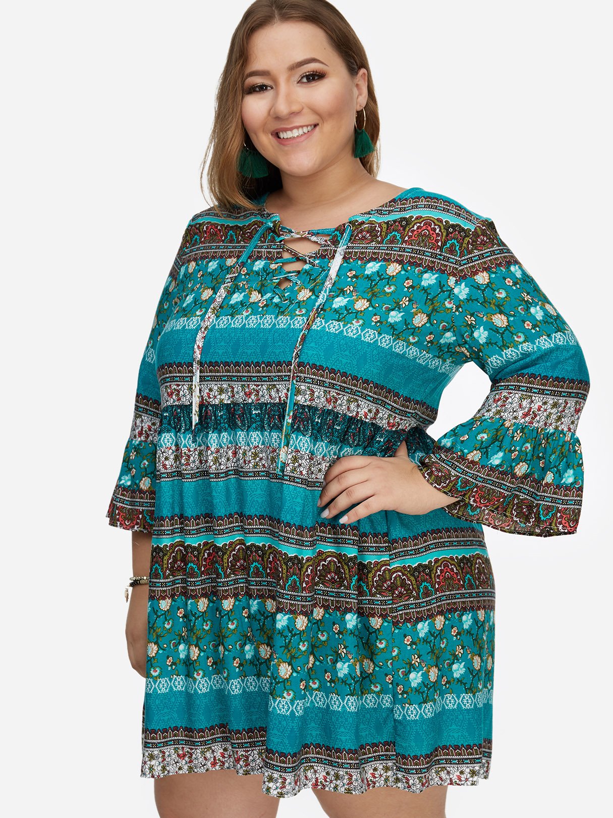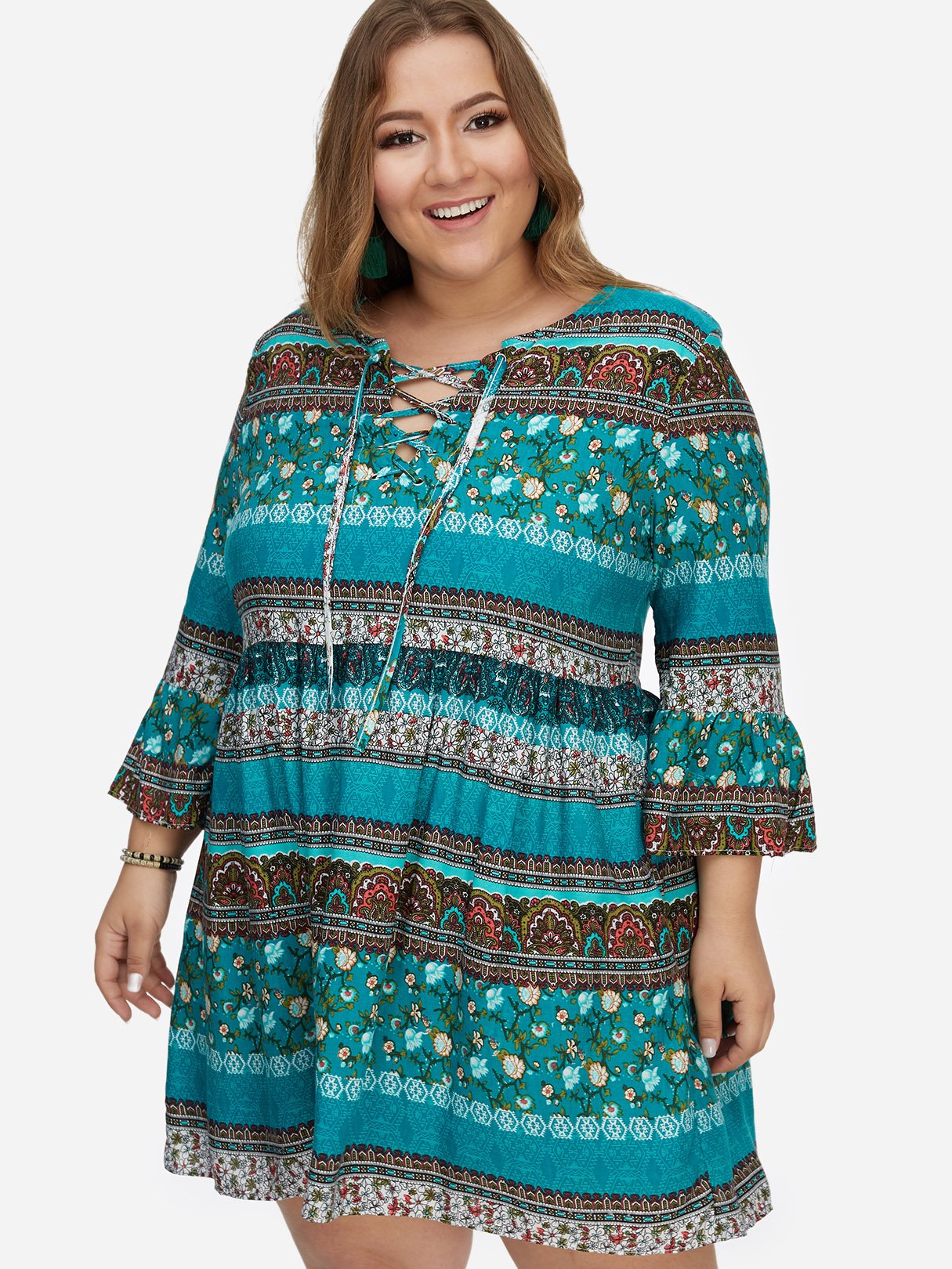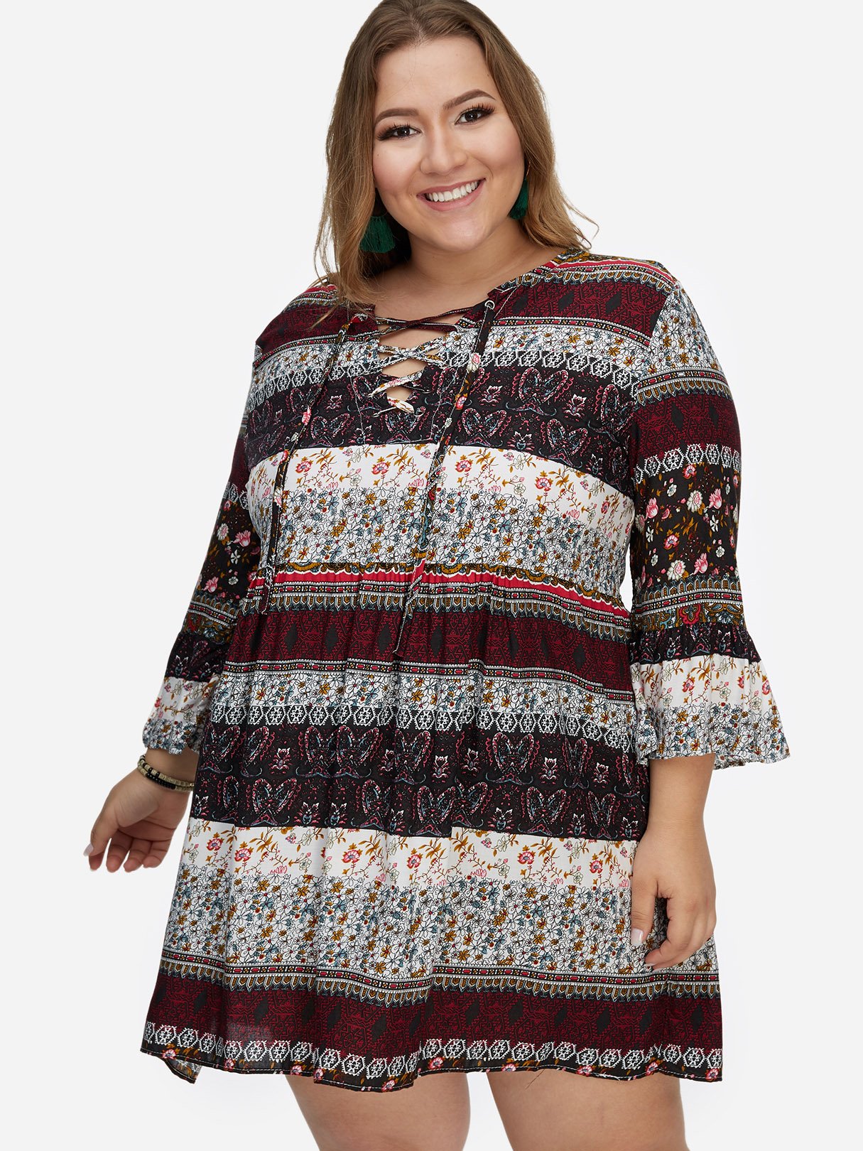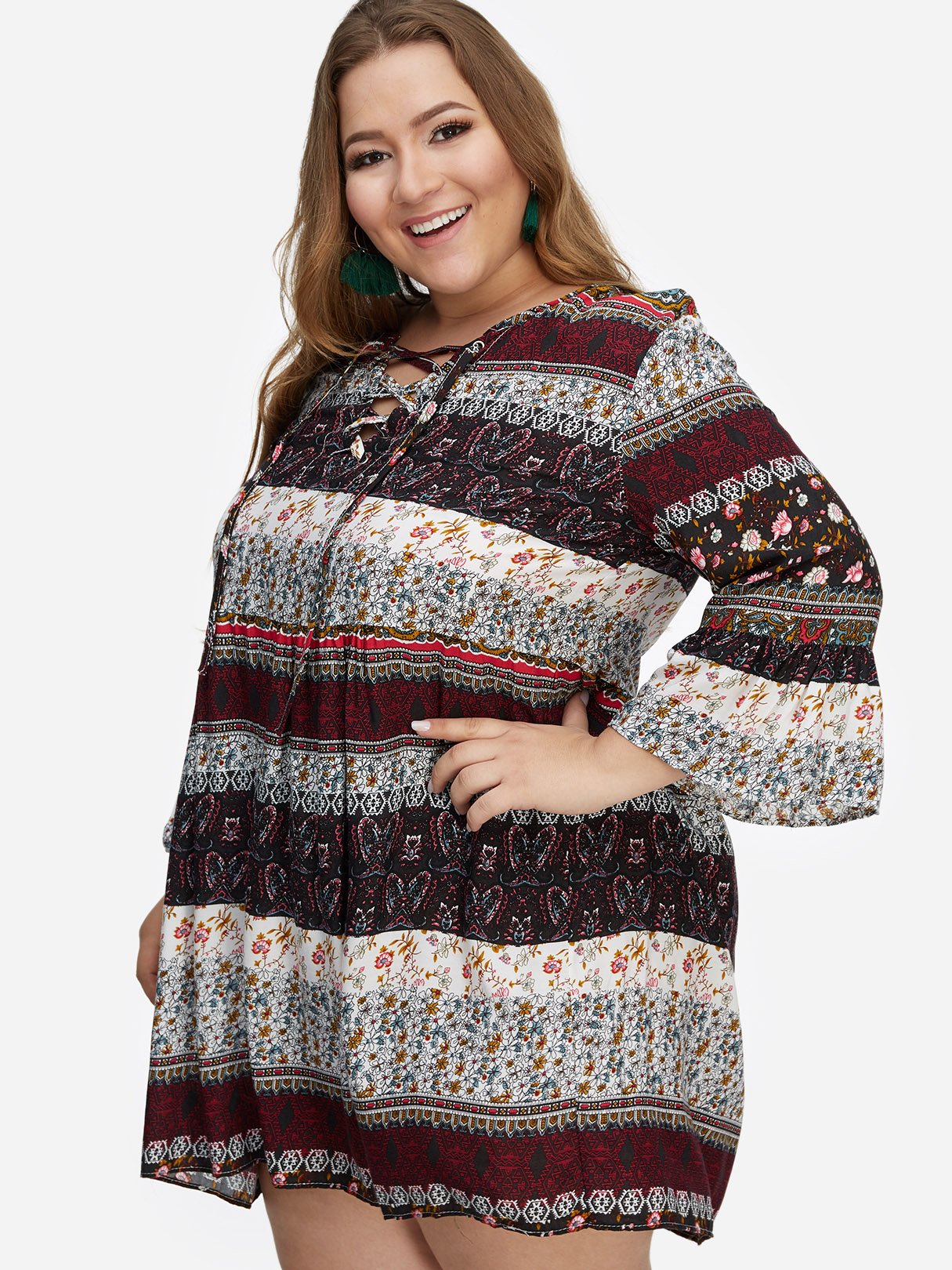 Round Neck Floral Print Calico Hollow Lace-Up Pleated Criss-Cross Long Sleeve Flounced Hem Plus Size Mini Dress