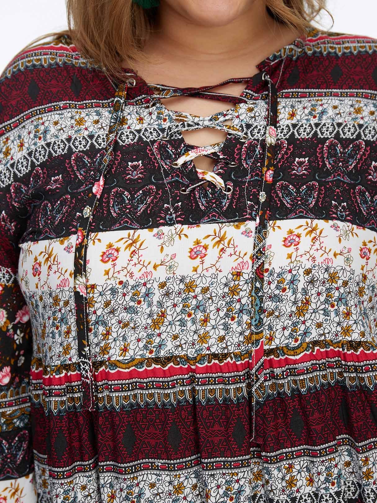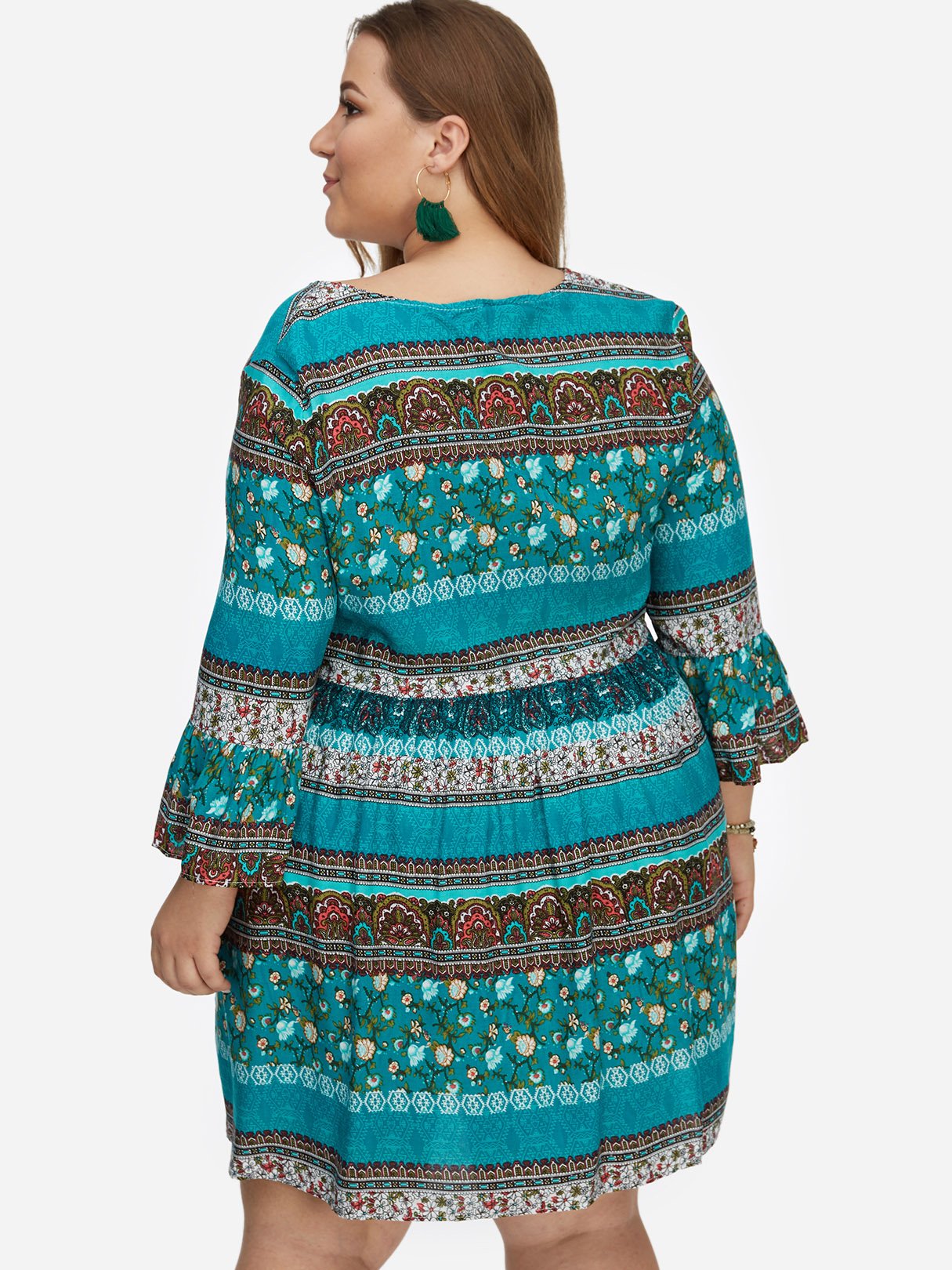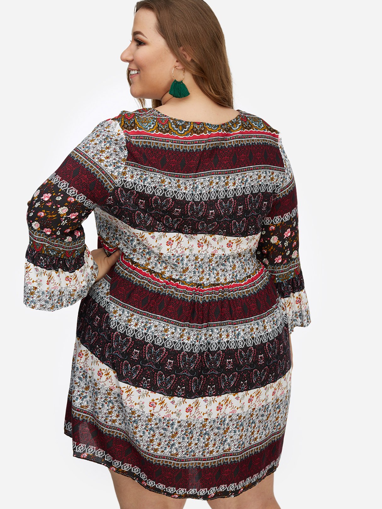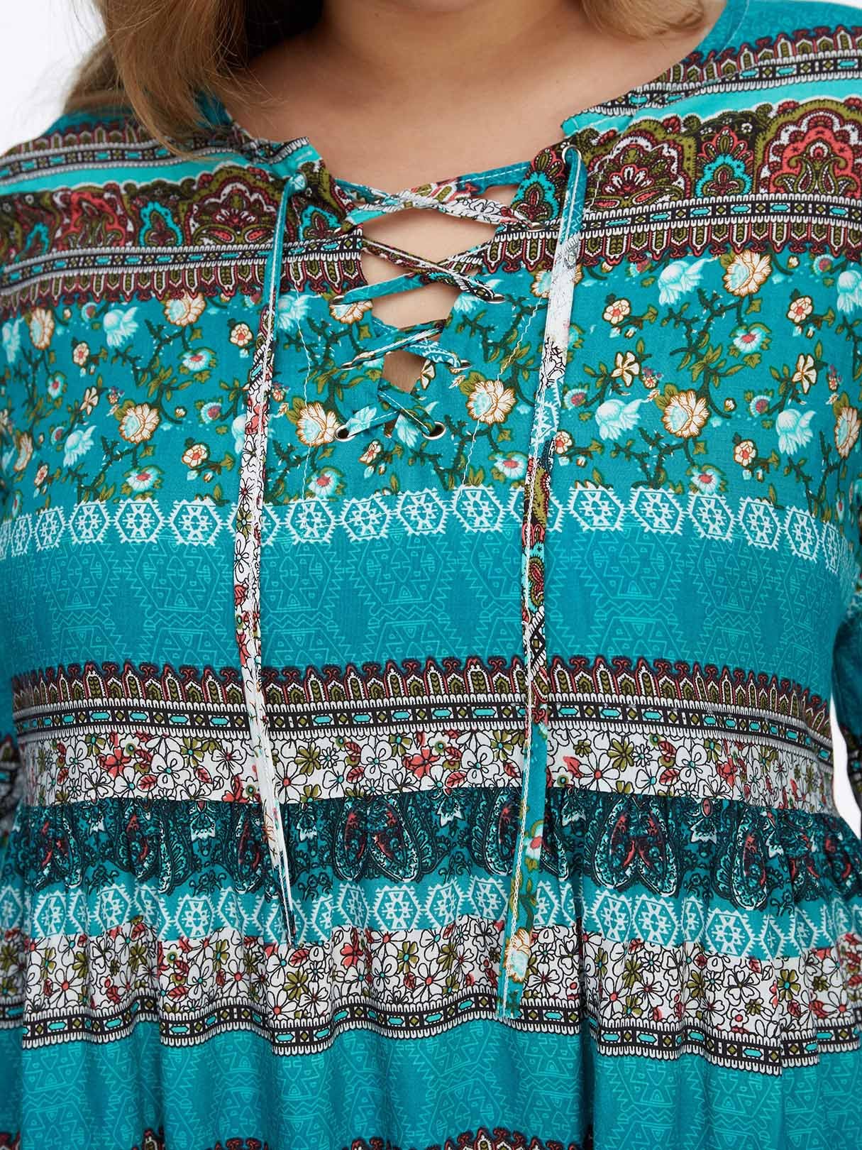 Round Neck Floral Print Calico Hollow Lace-Up Pleated Criss-Cross Long Sleeve Flounced Hem Plus Size Mini Dress