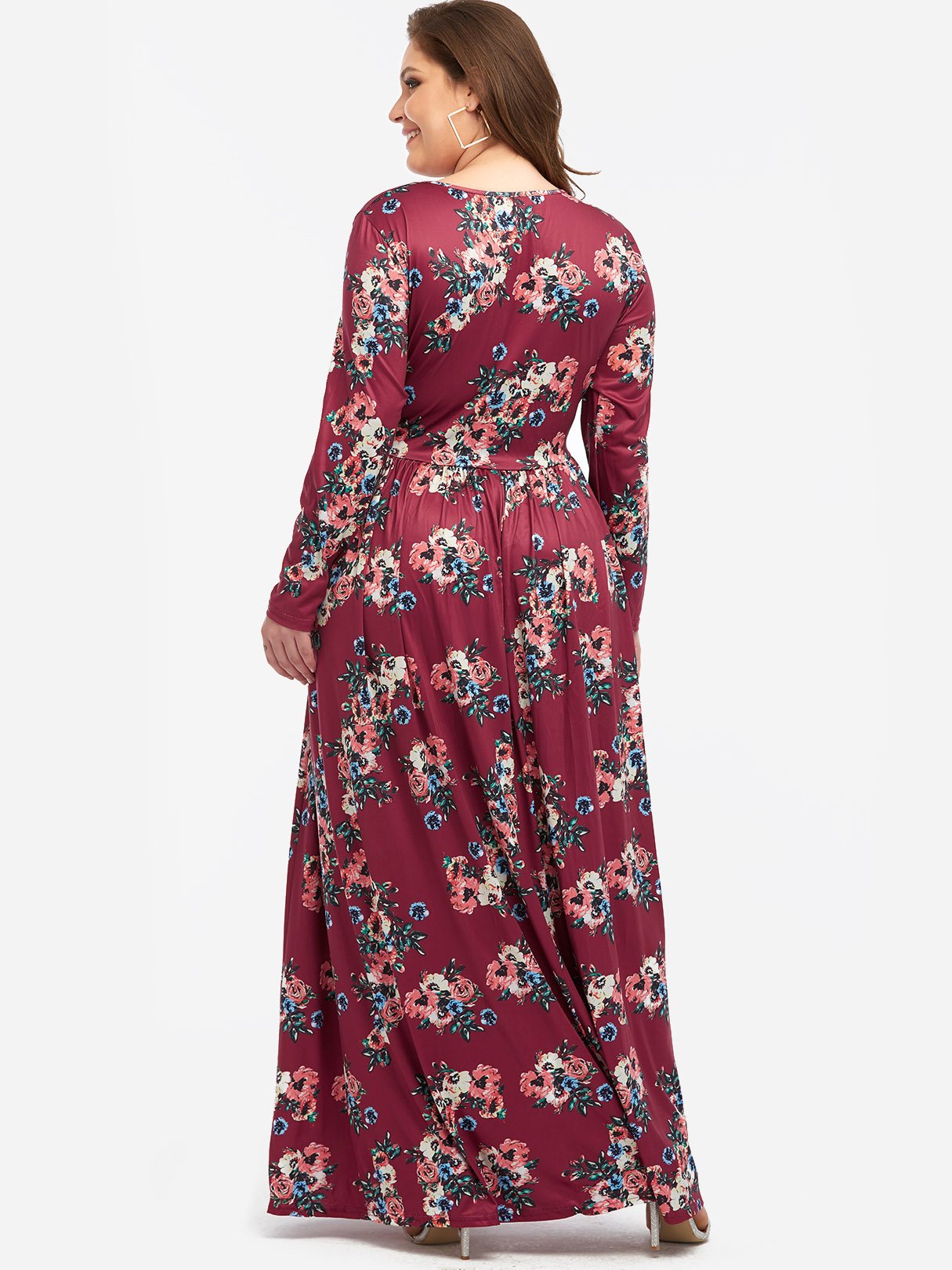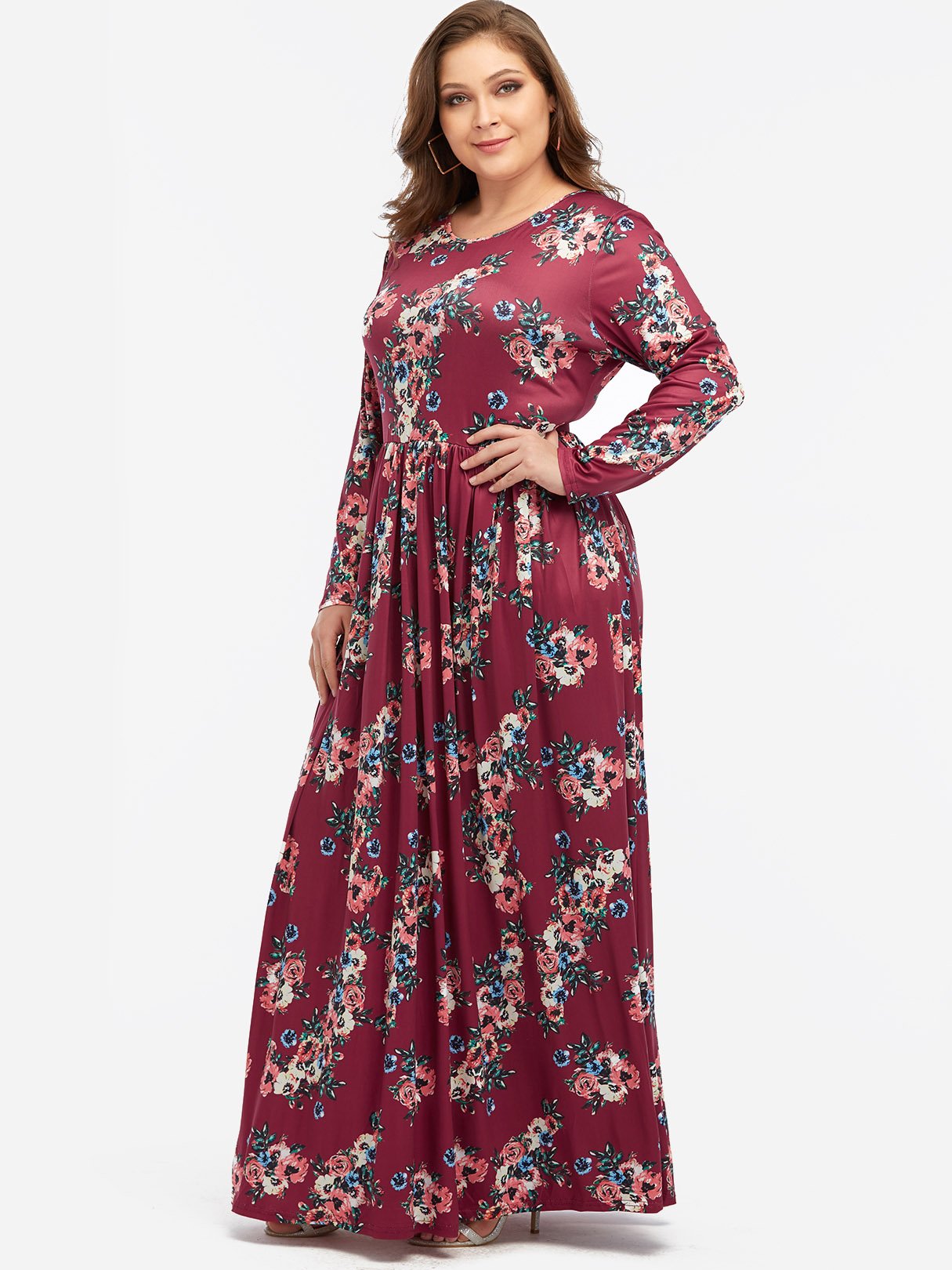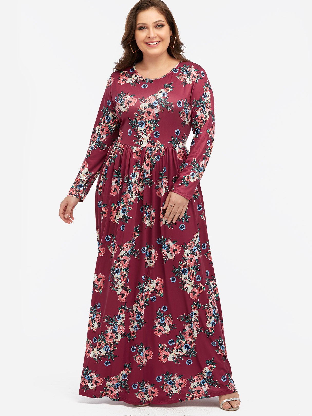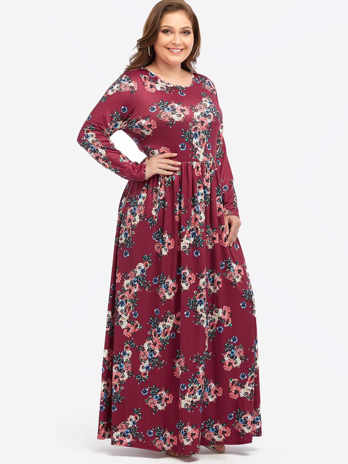 Round Neck Floral Print Long Sleeve Plus Size Maxi Dresses - Burgundy / XL is backordered and will ship as soon as it is back in stock.