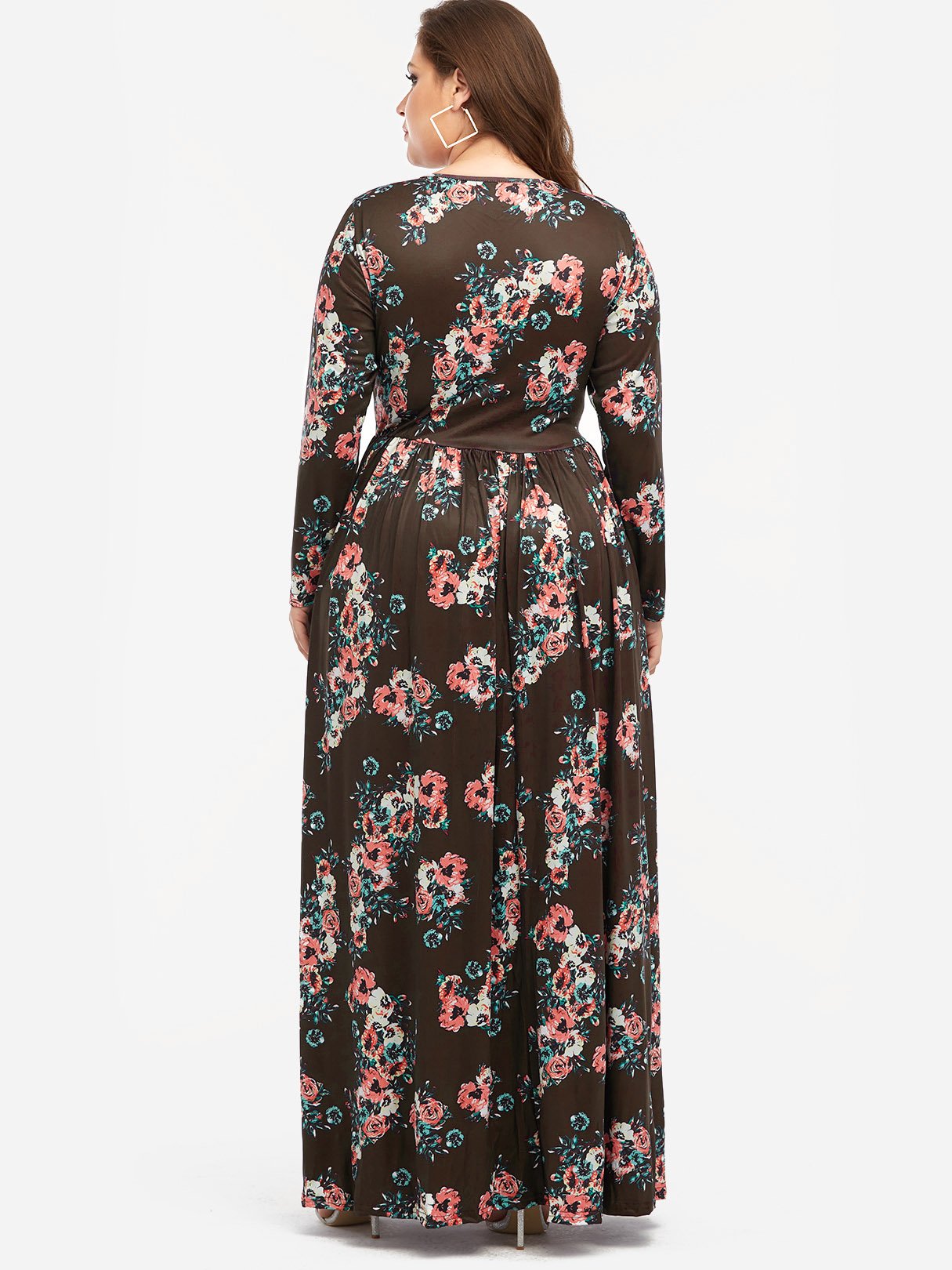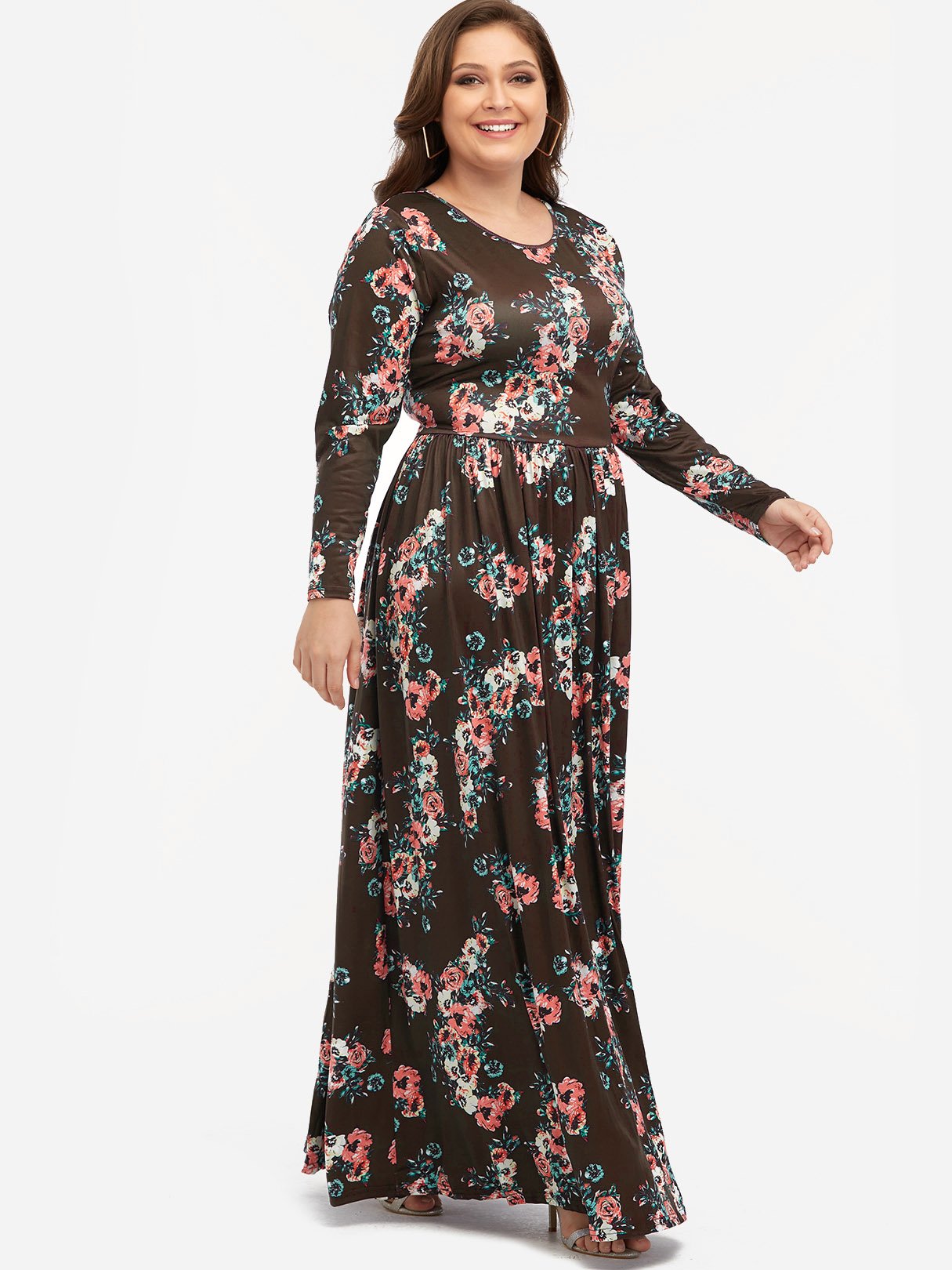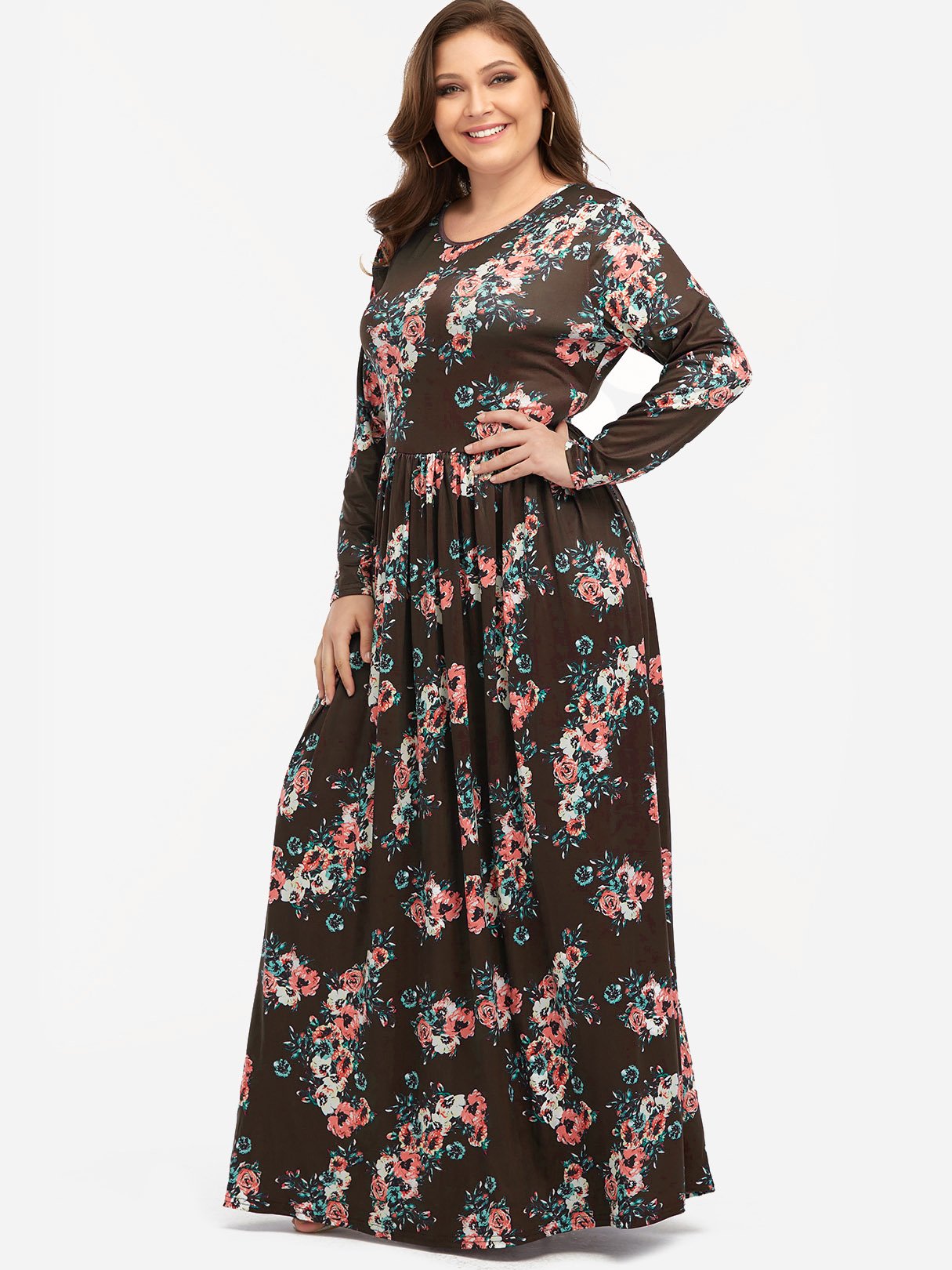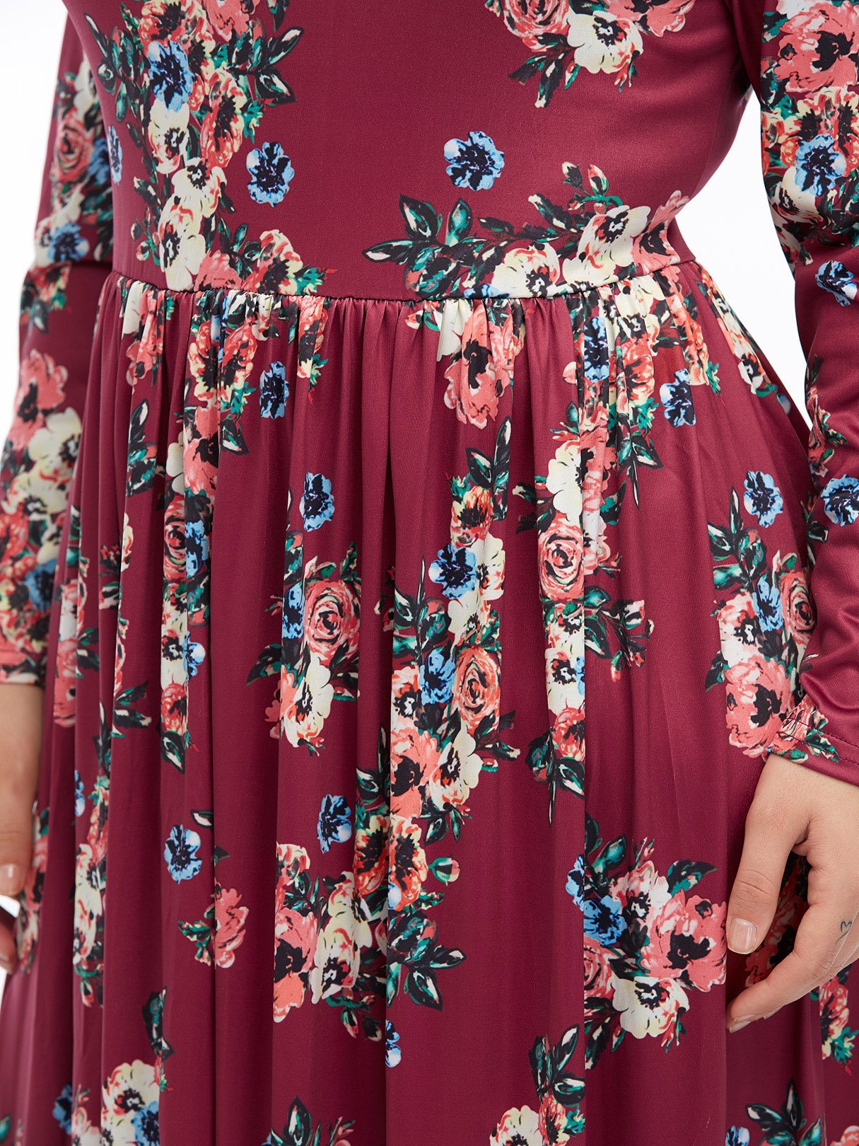 Round Neck Floral Print Long Sleeve Plus Size Maxi Dresses - Burgundy / XL is backordered and will ship as soon as it is back in stock.