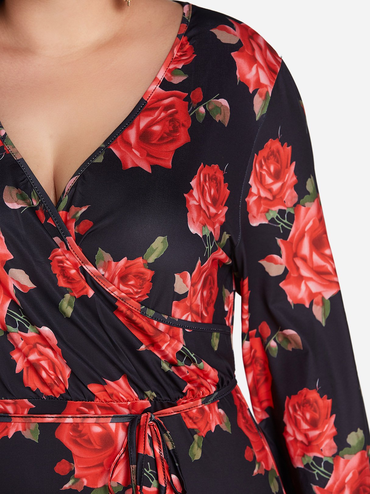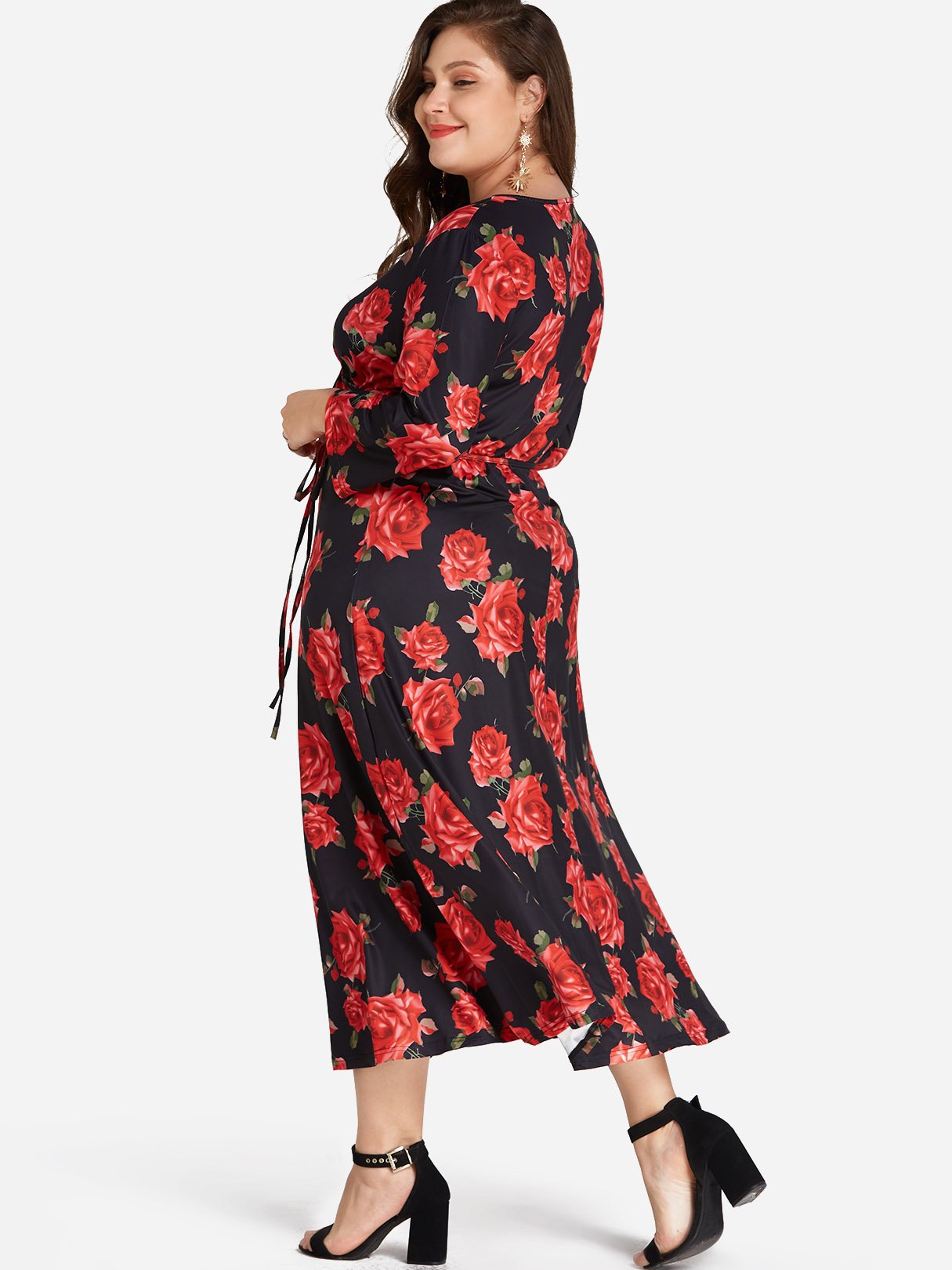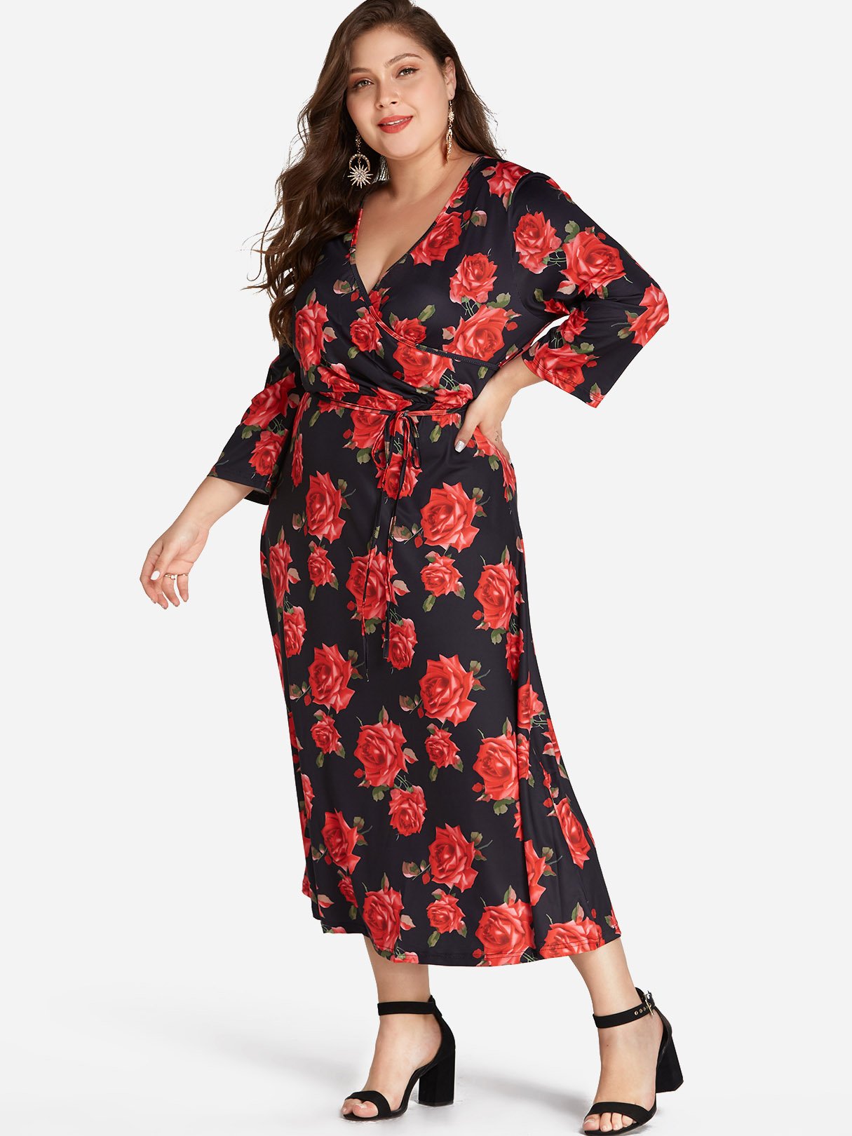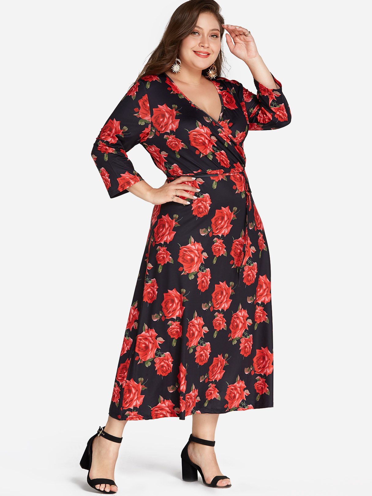 V-Neck Floral Print Self-Tie Wrap 3/4 Sleeve Rose Plus Size Dress - Rose / L is backordered and will ship as soon as it is back in stock.