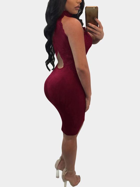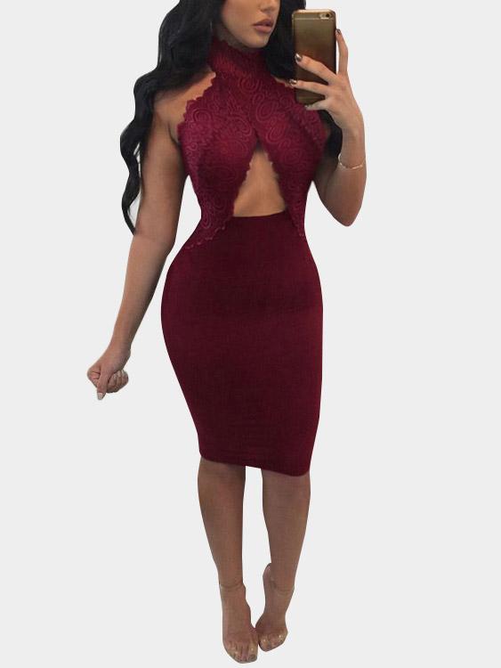 Burgundy Halter Sleeveless Lace Cut Out Bodycon Hem Sexy Dresses