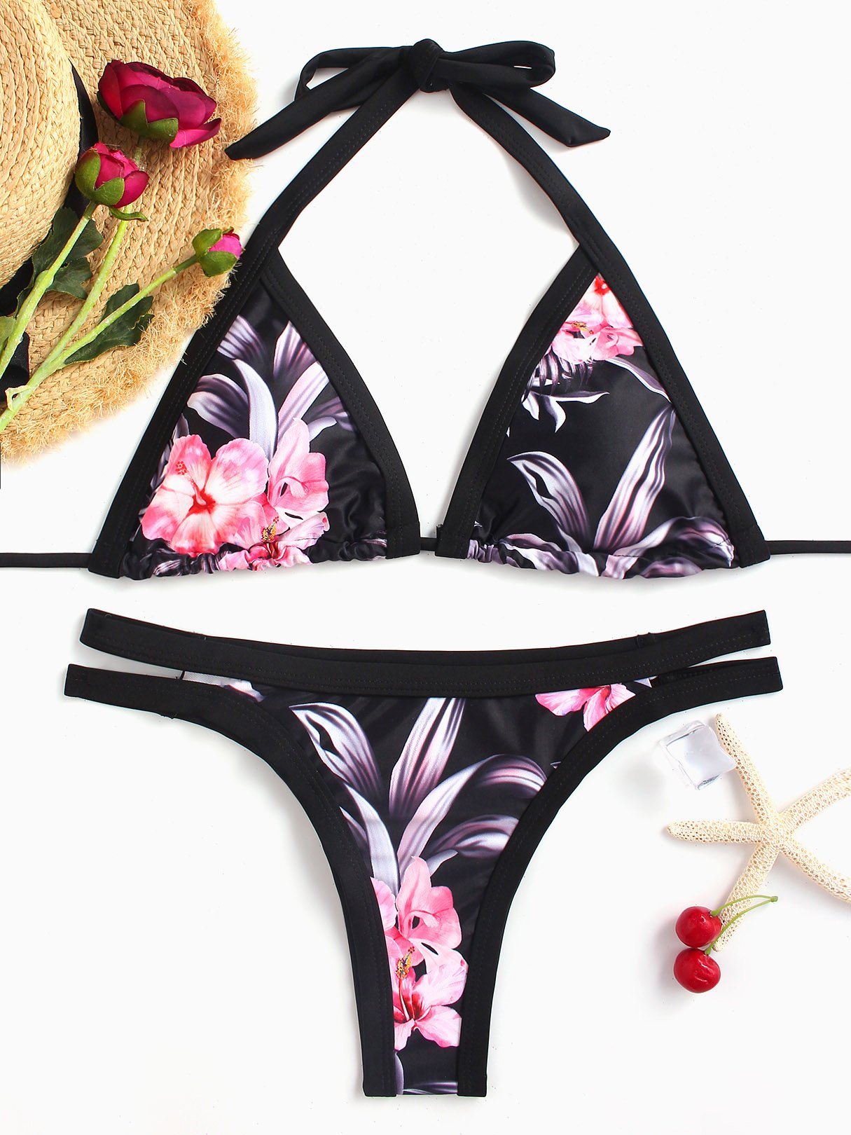 Black V-Neck Sleeveless Floral Print Lace-Up High-Waisted Bikinis