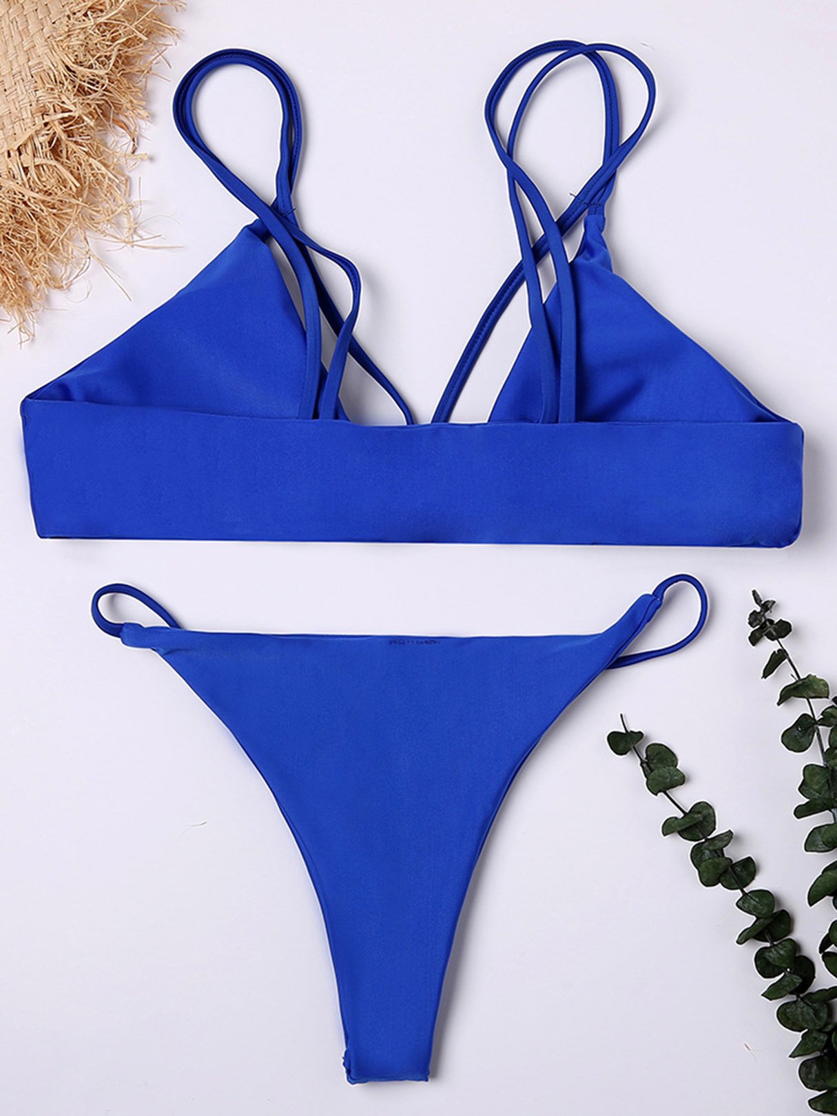 Blue V-Neck Sleeveless Plain Bodycon Two Piece Bikini