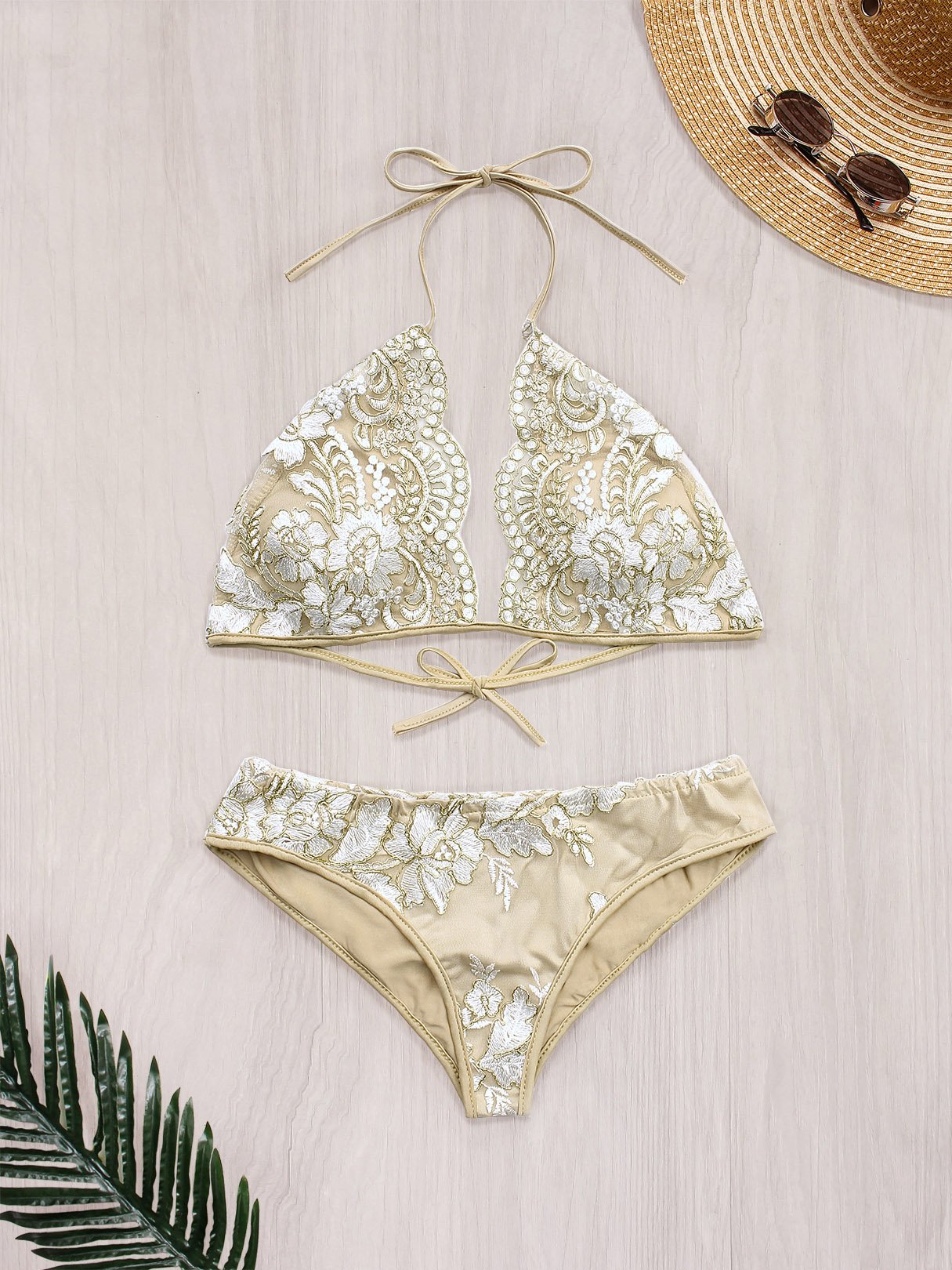 Gold V-Neck Sleeveless Two Piece Bikinis