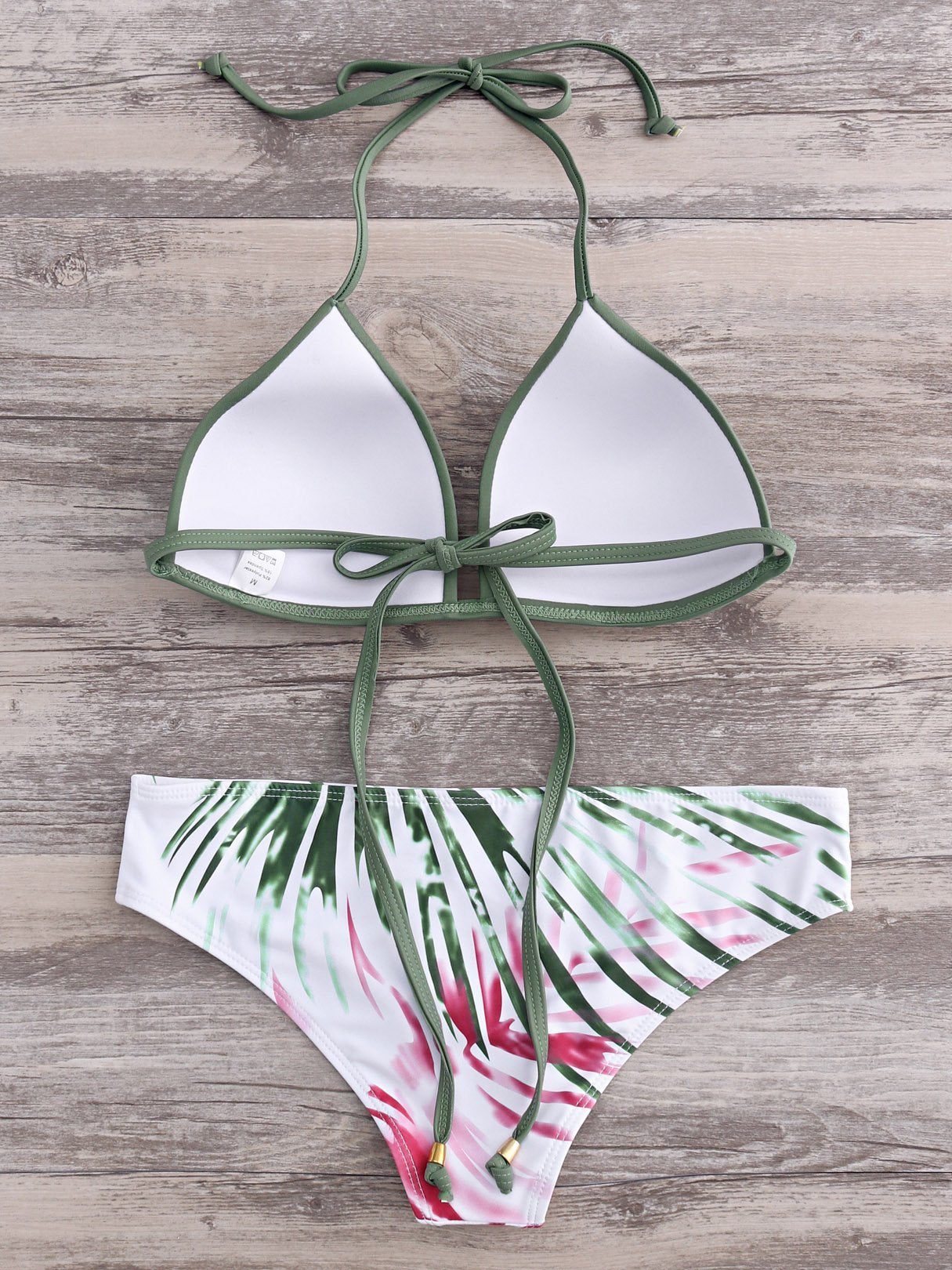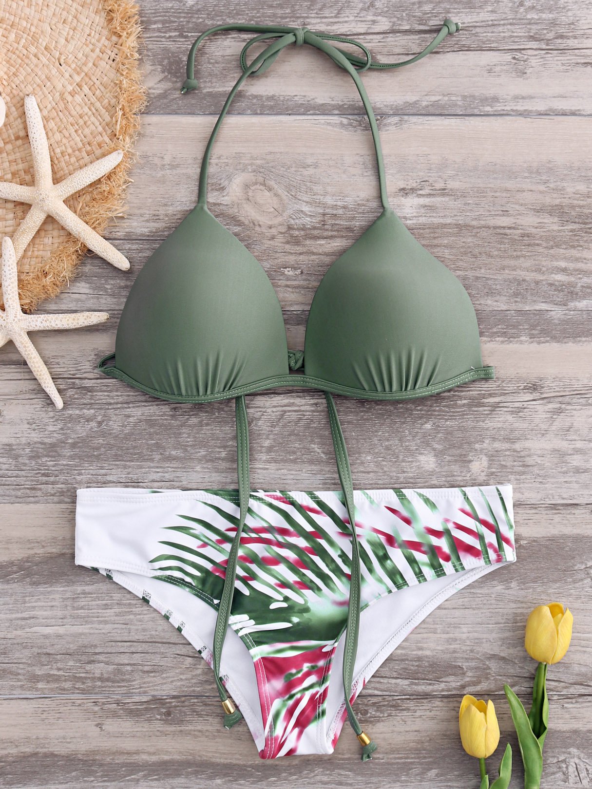 Halter Floral Print Tie-Up Sleeveless Army Green Bikini Set