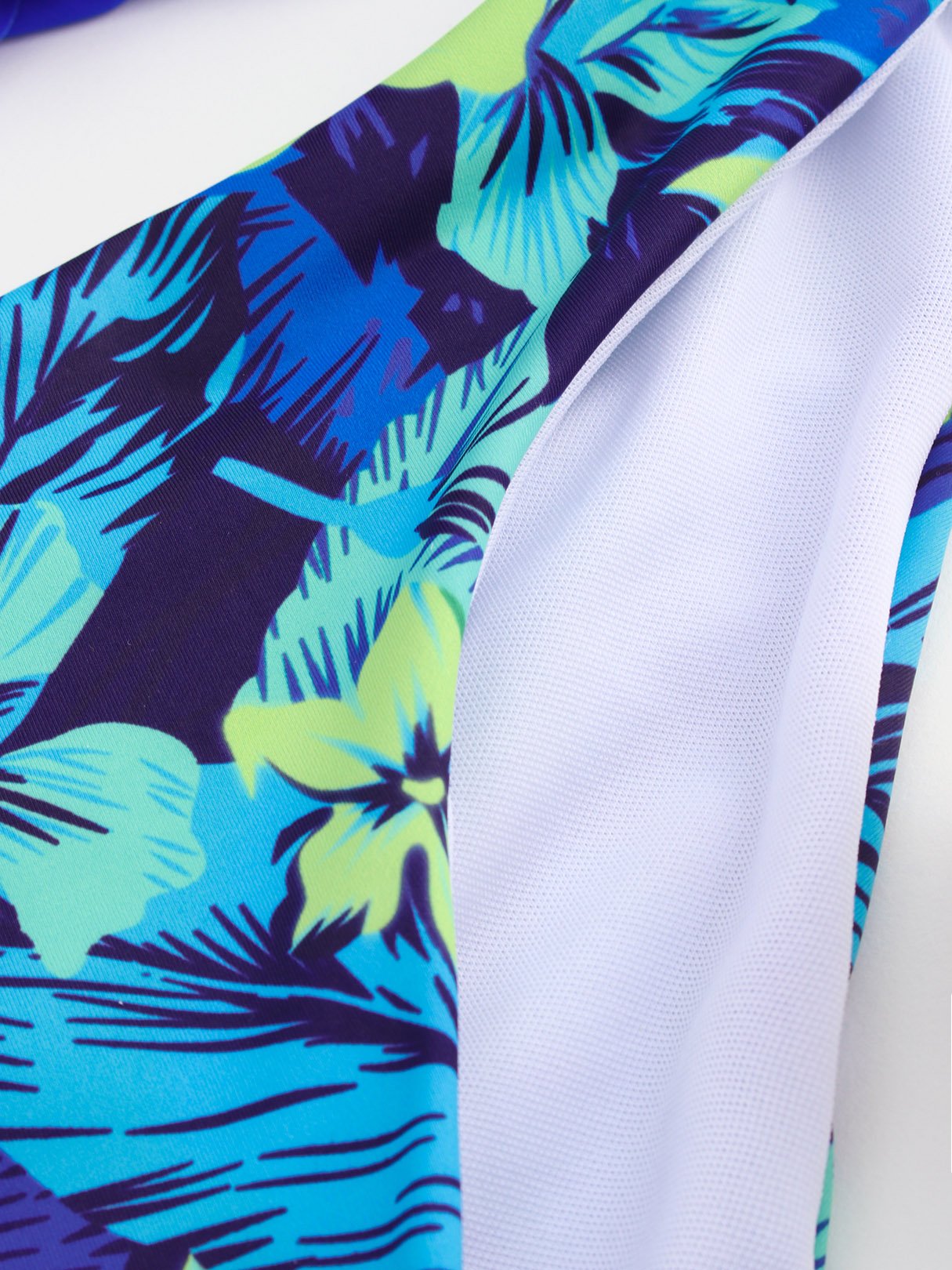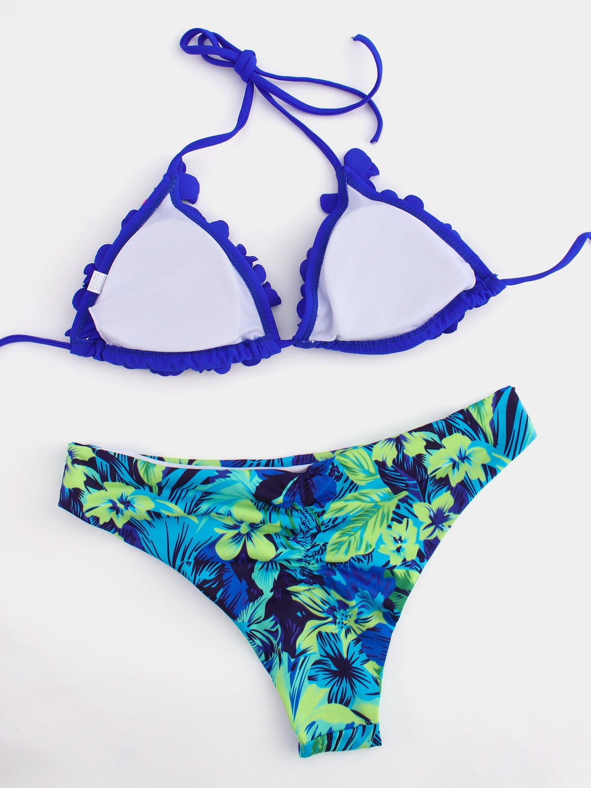Halter Sleeveless Floral Print Backless Self-Tie Bikinis Set