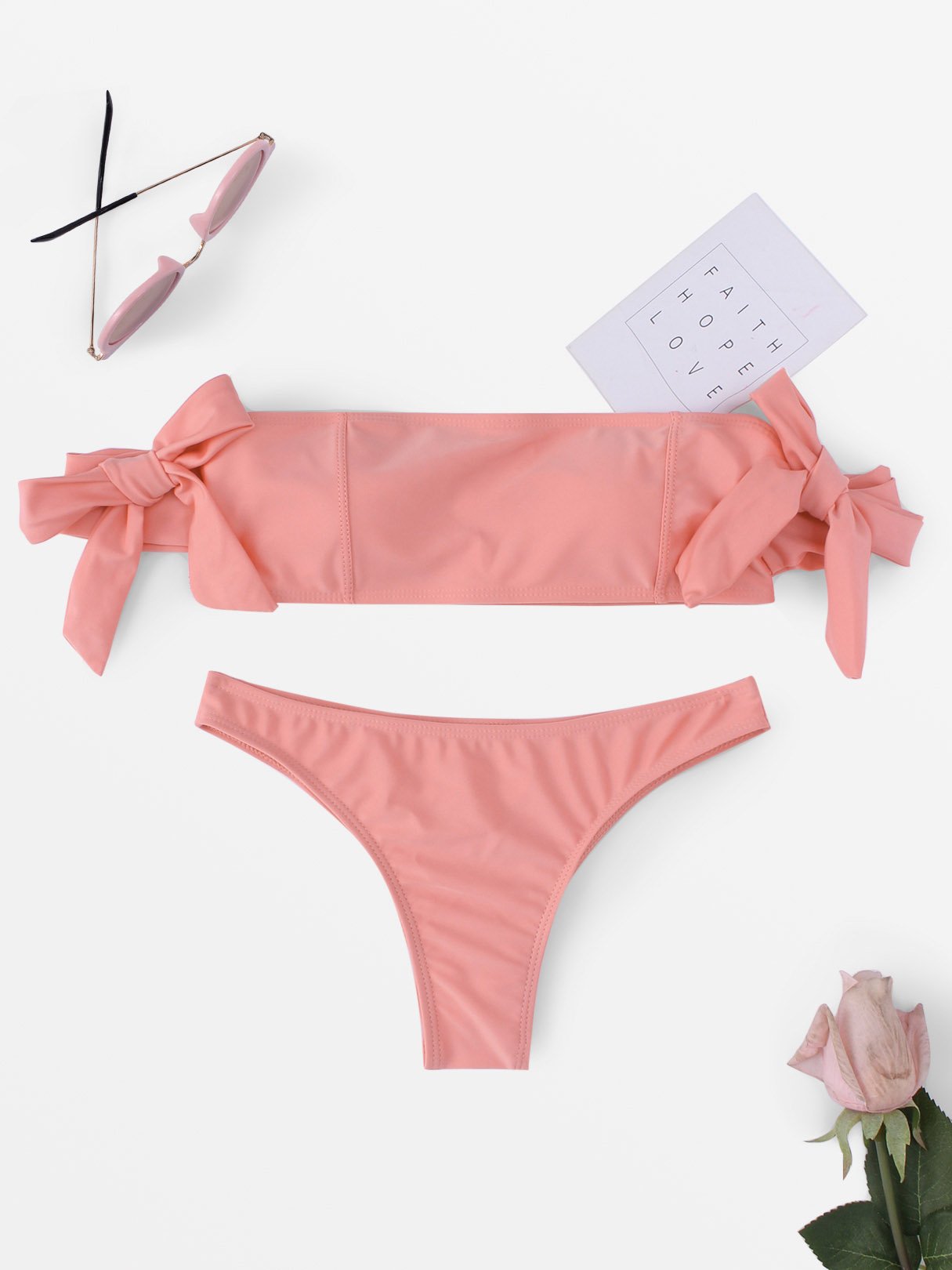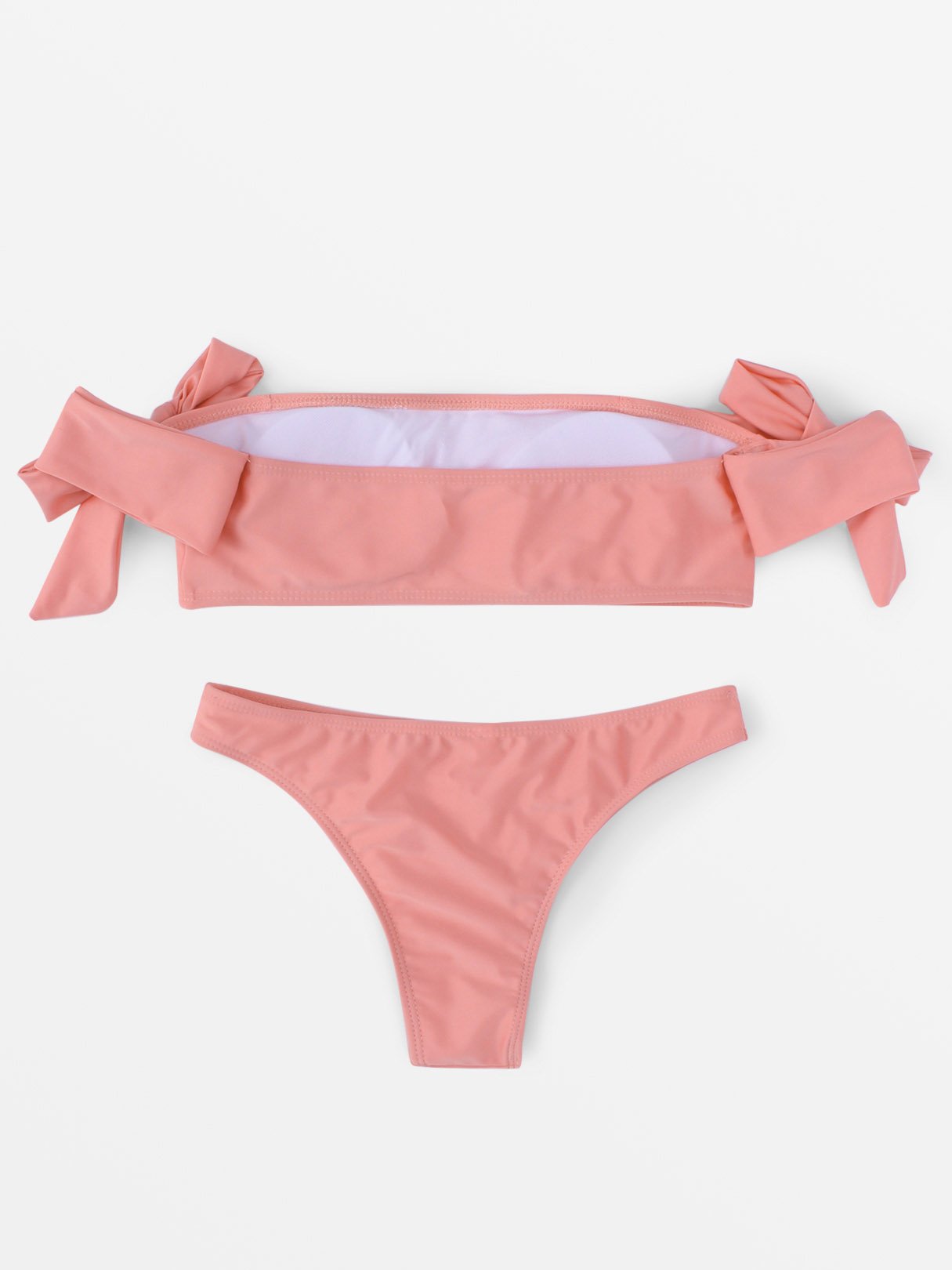 Pink Off The Shoulder Sleeveless Plain Bowknot Two Piece Bikinis