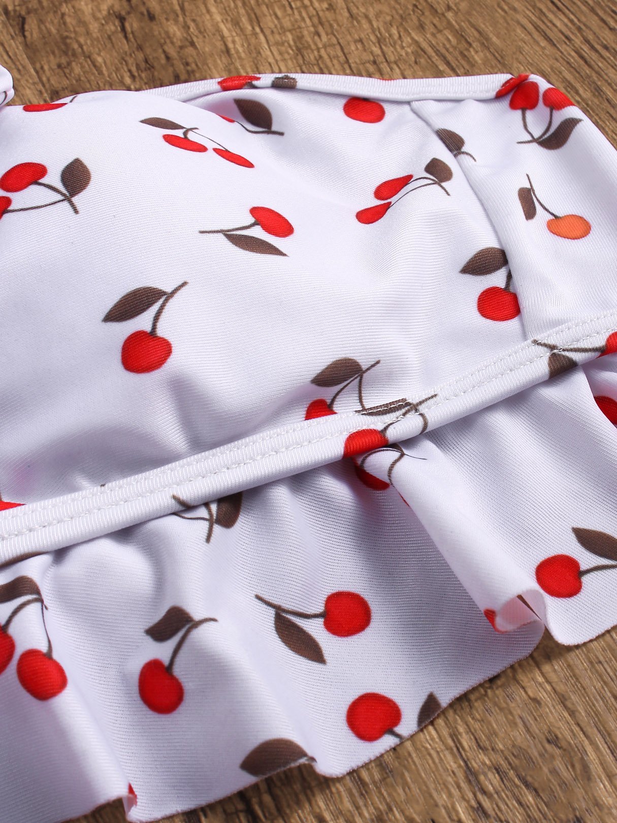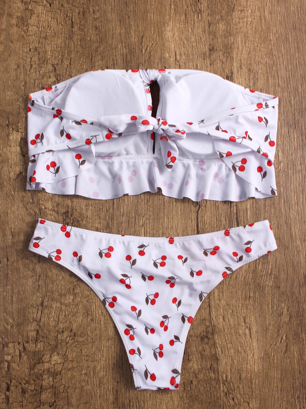 White Strapless Off The Shoulder Printed Tie-Up Ruffle Hem Bikinis