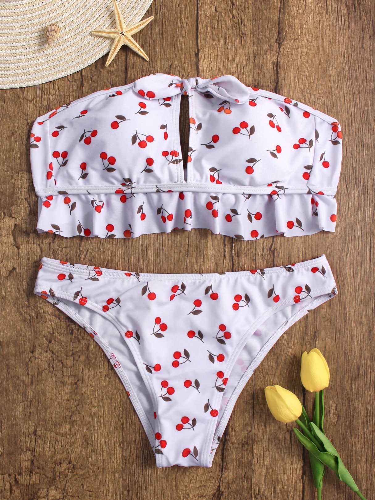 White Strapless Off The Shoulder Sleeveless Printed Tie-Up Ruffle Hem Bikinis