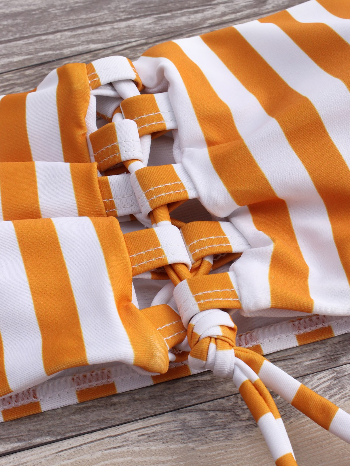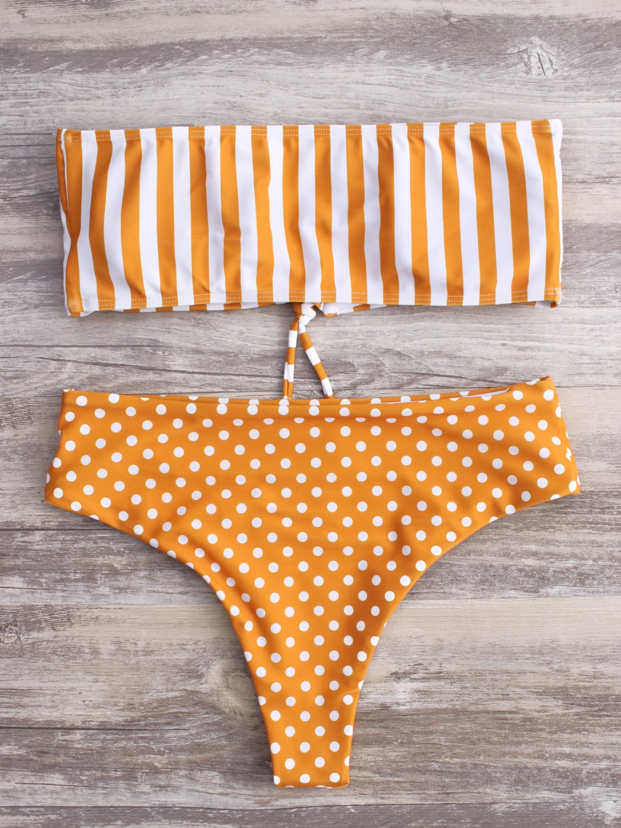 Yellow Bateau Sleeveless Stripe Polka Dot Backless Lace-Up Two Piece Bikinis