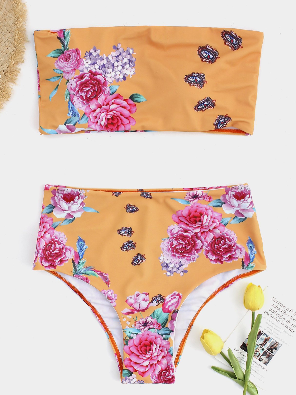Yellow Off The Shoulder Sleeveless Floral Print High Waist Two Piece Bikinis