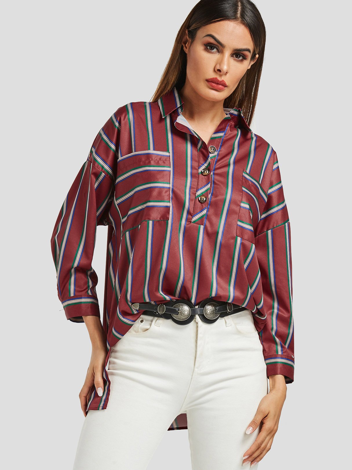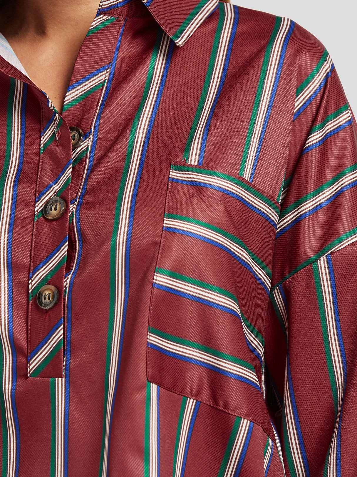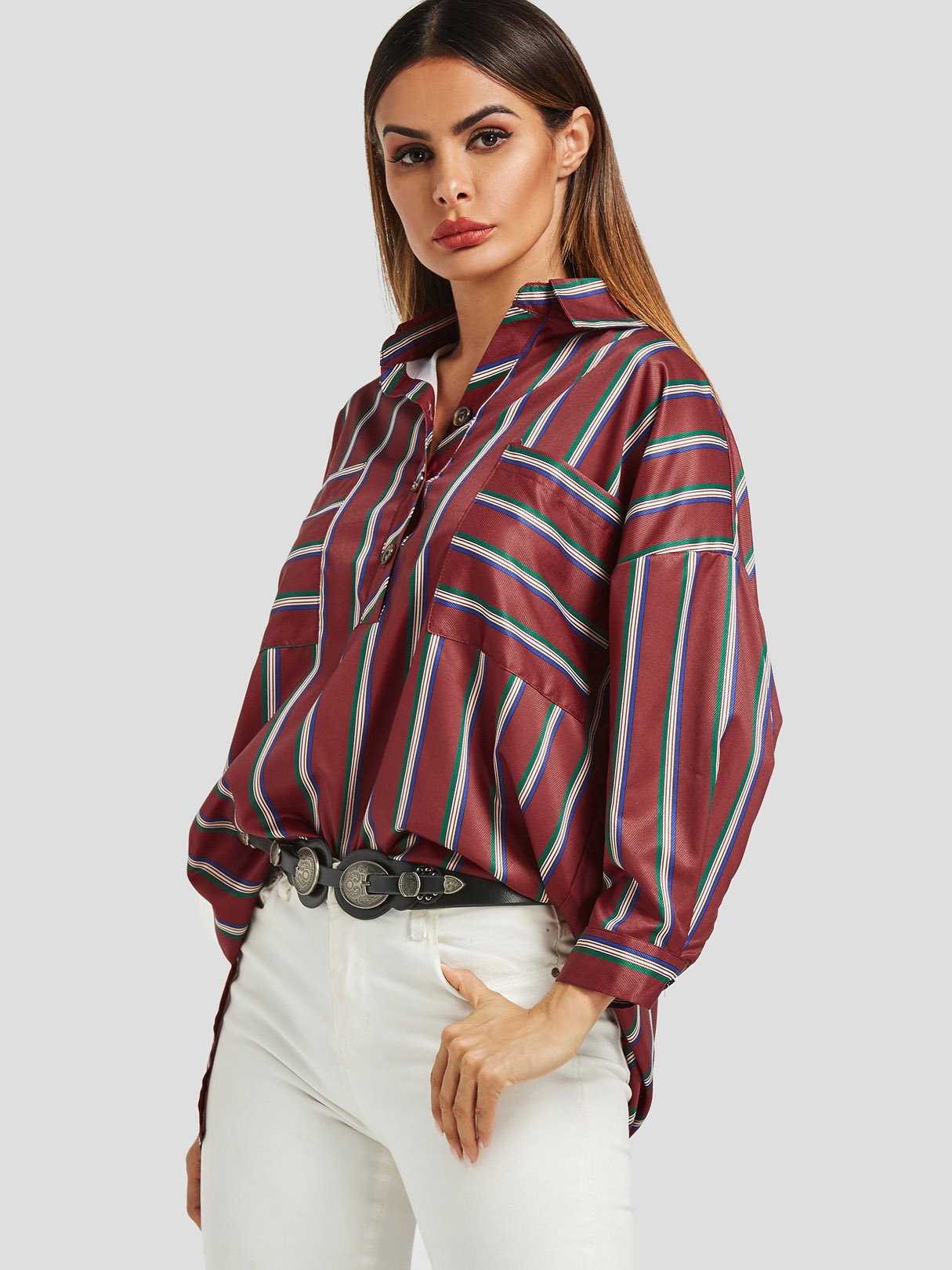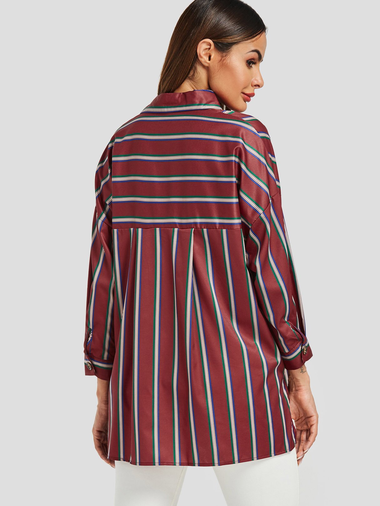 Classic Collar Stripe Long Sleeve Burgundy Blouses