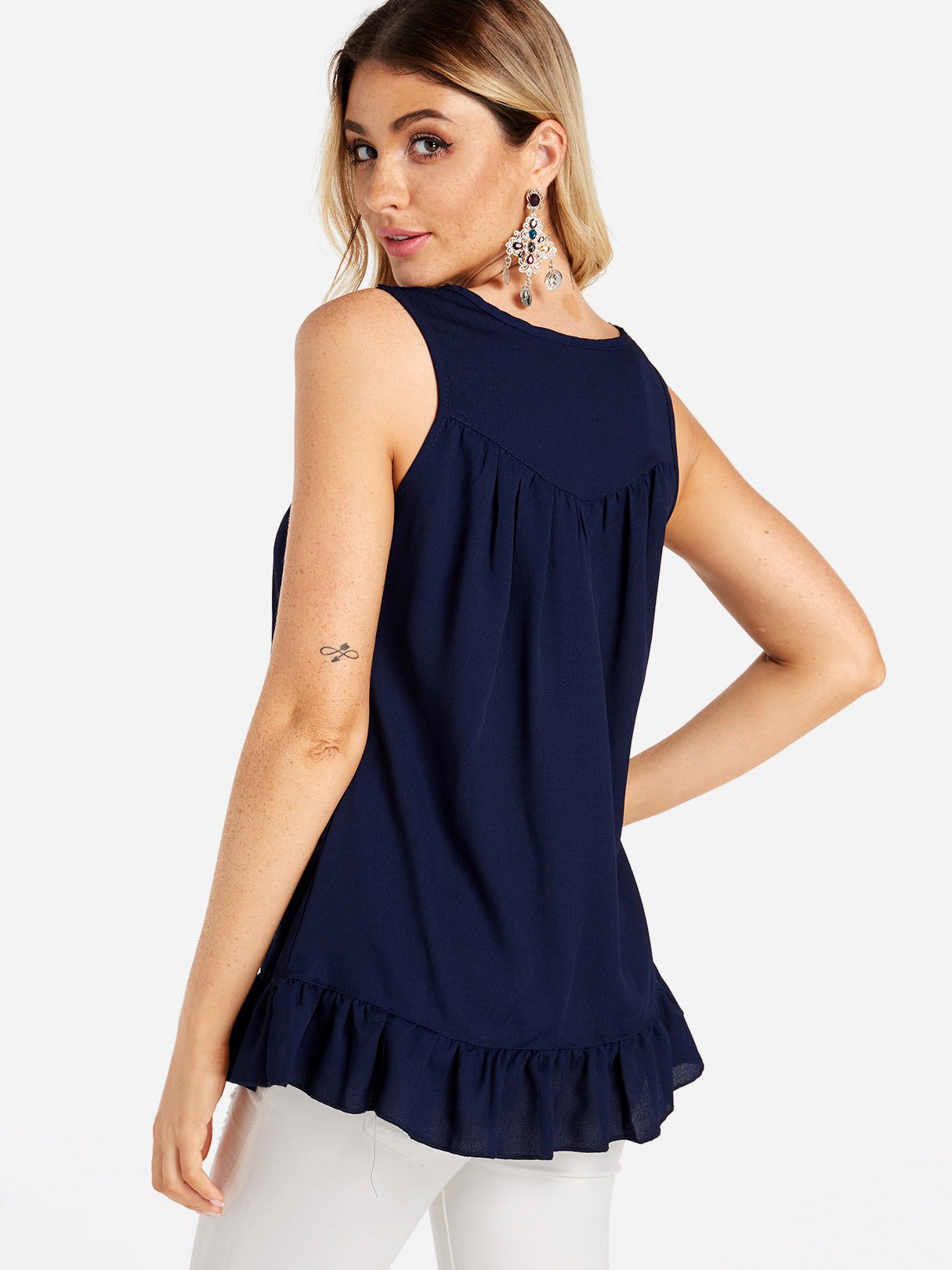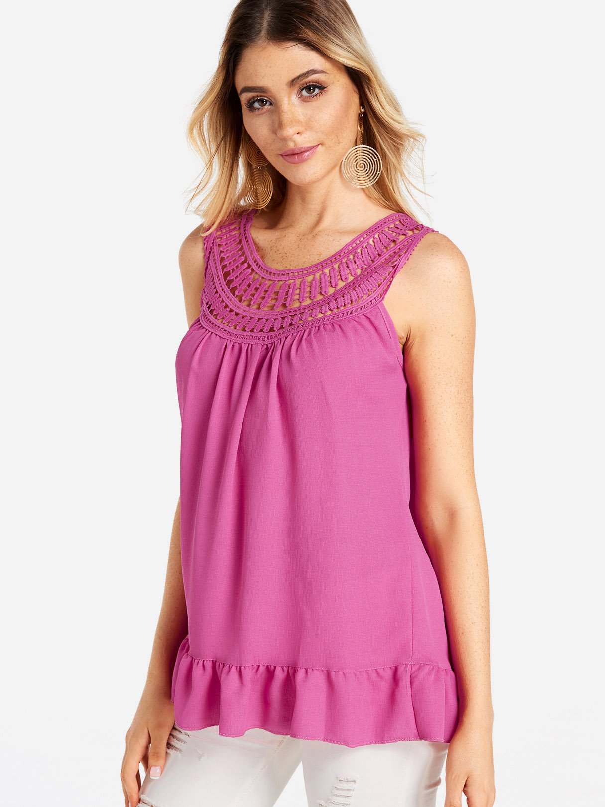 Crew Neck Plain Hollow Sleeveless Ruffle Hem Camis