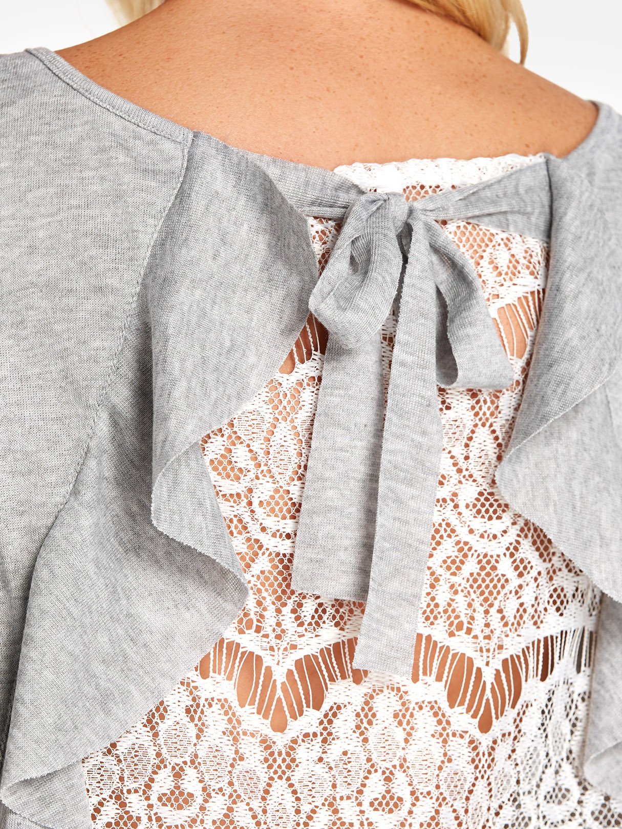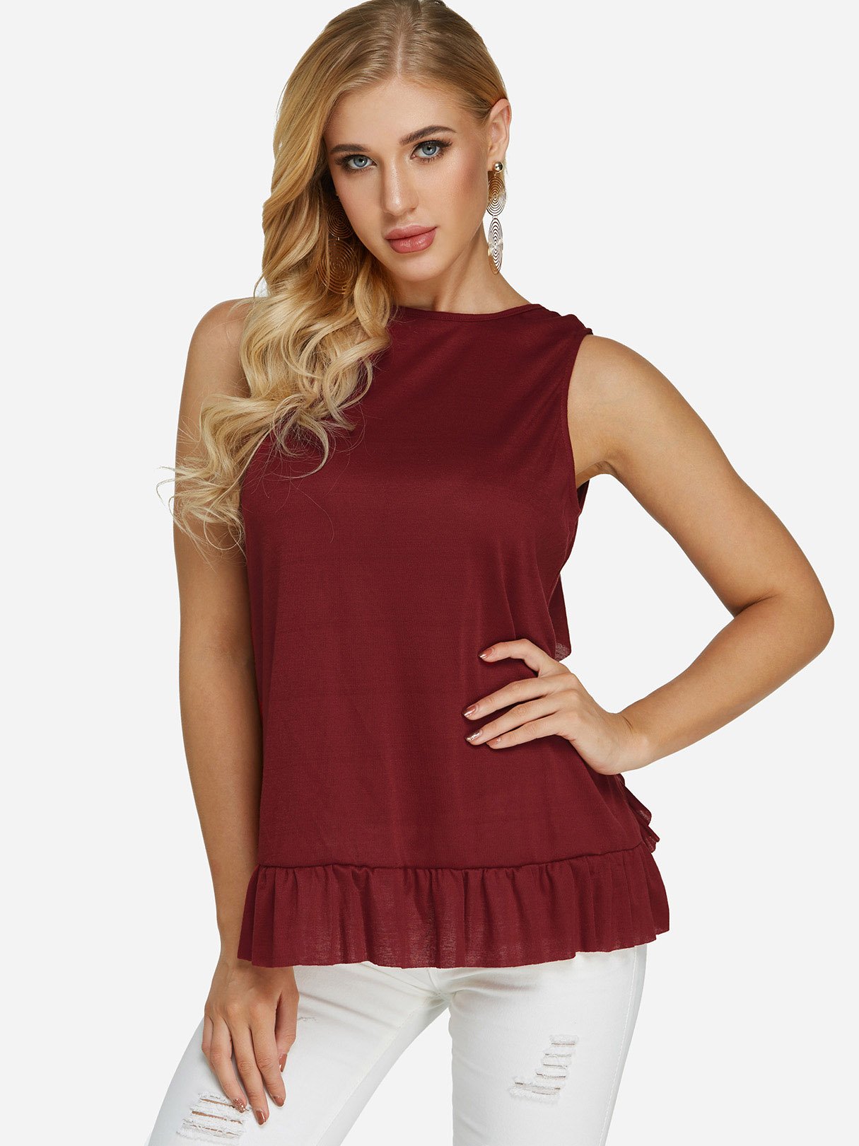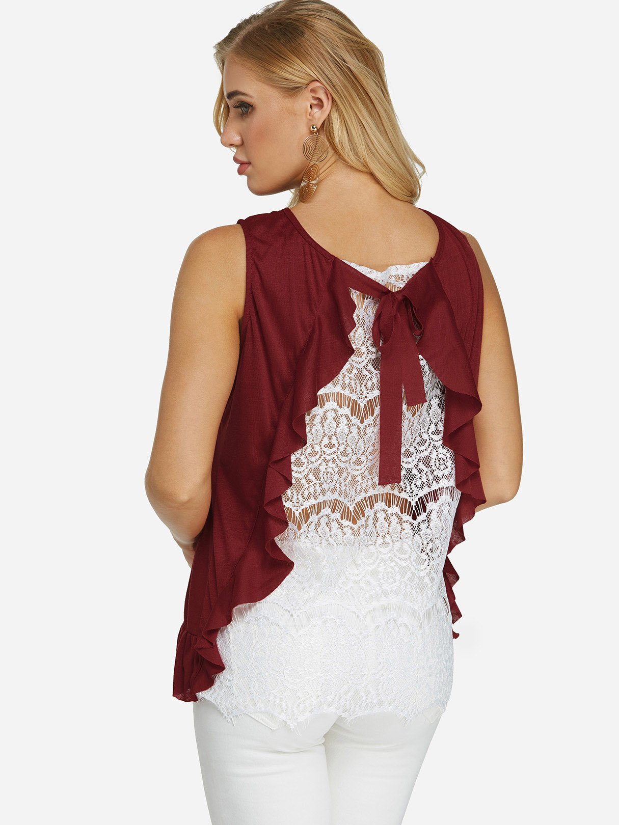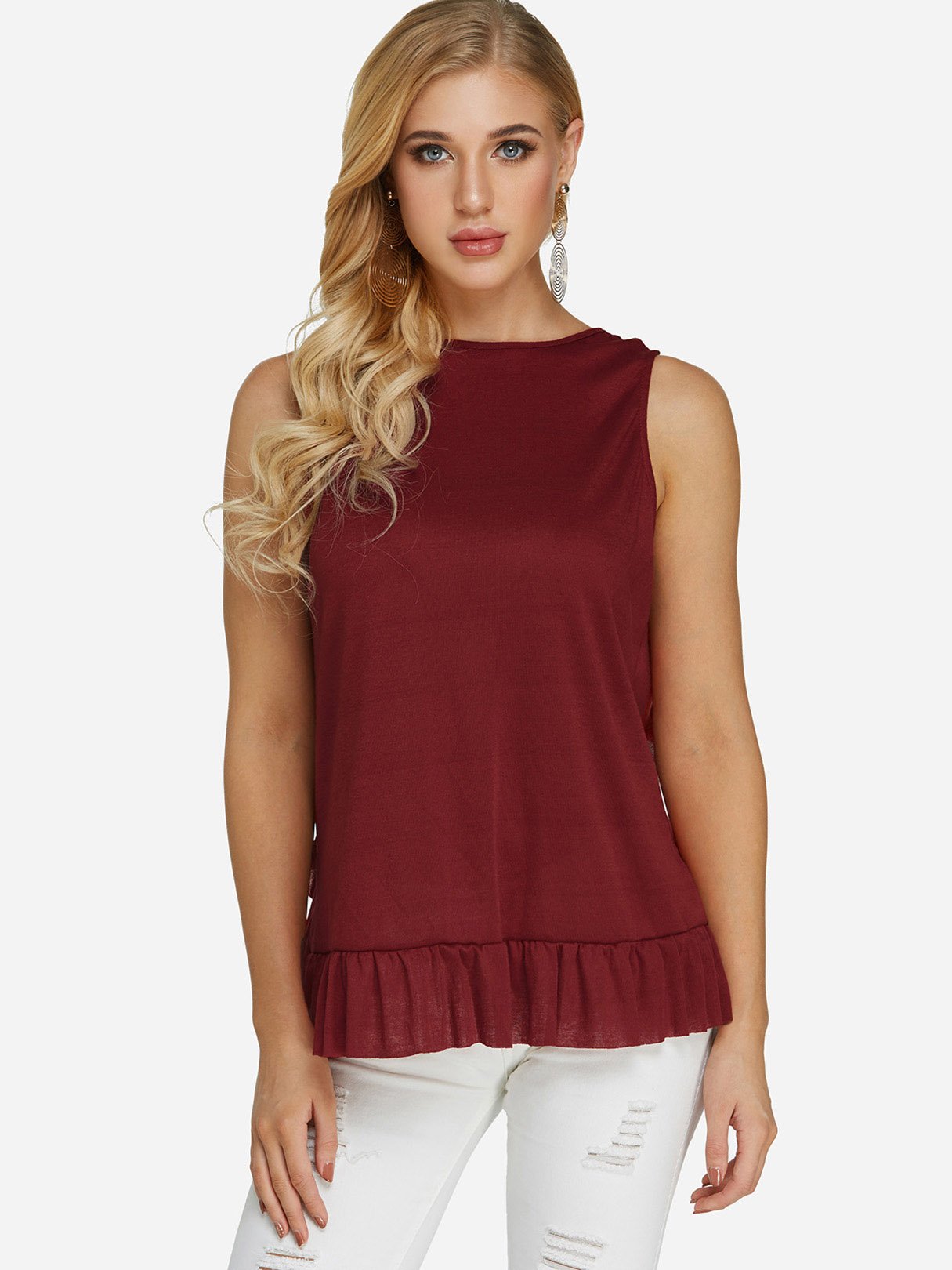 Crew Neck Plain Lace Sleeveless Ruffle Hem Tank Top
