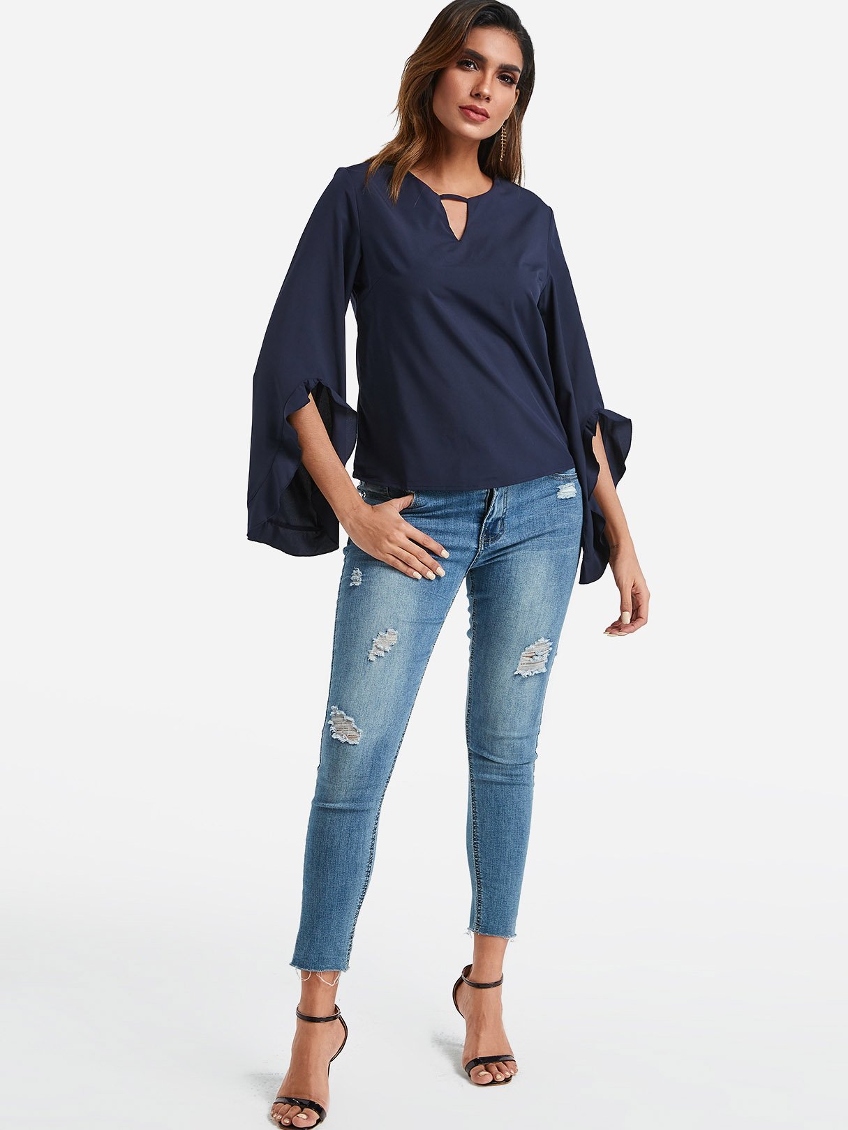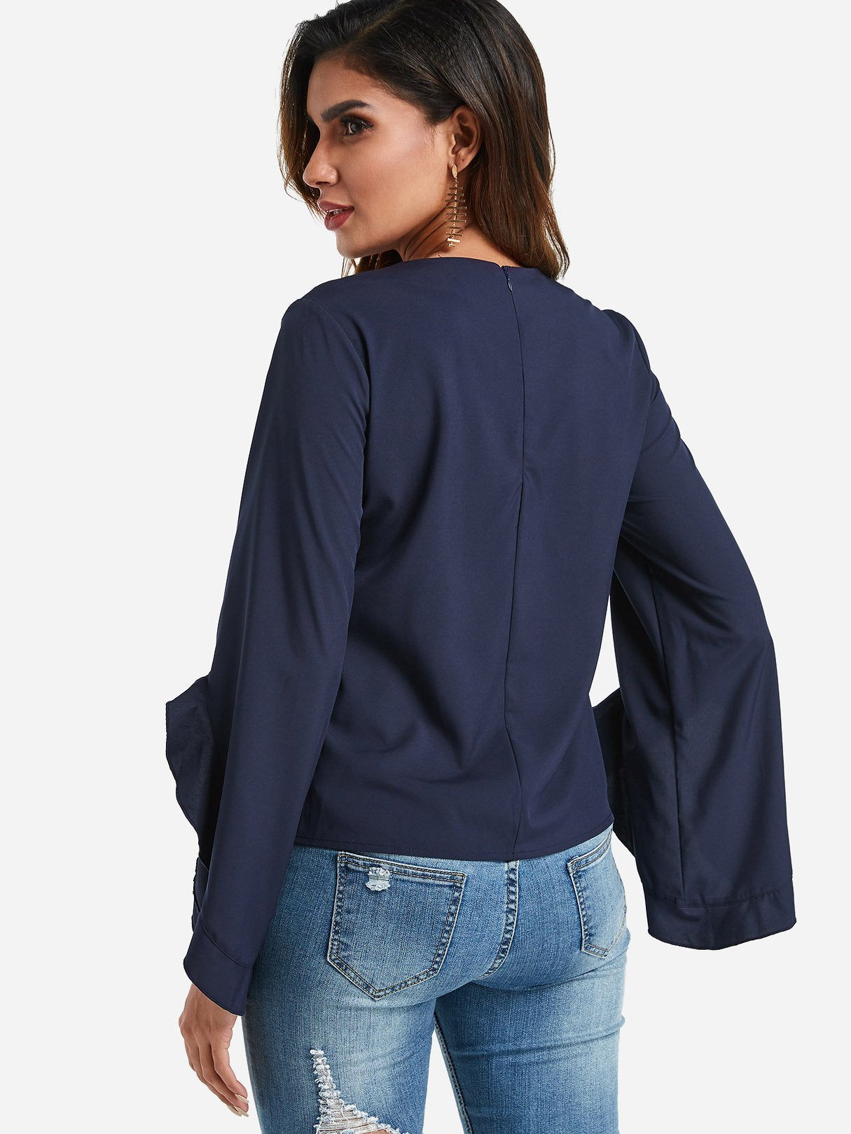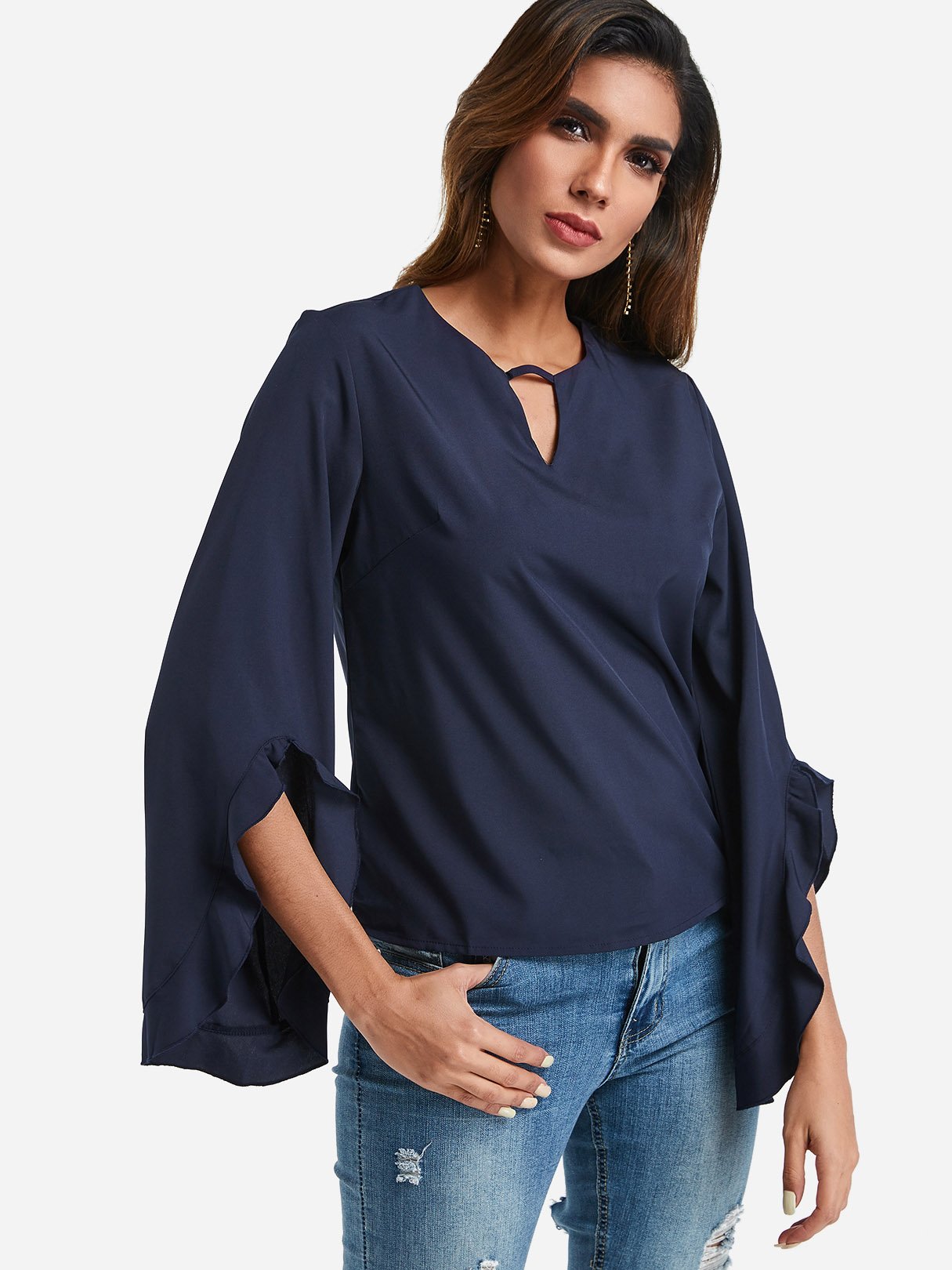 Crew Neck Plain Zip Back Cut Out Long Sleeve Navy Blouses