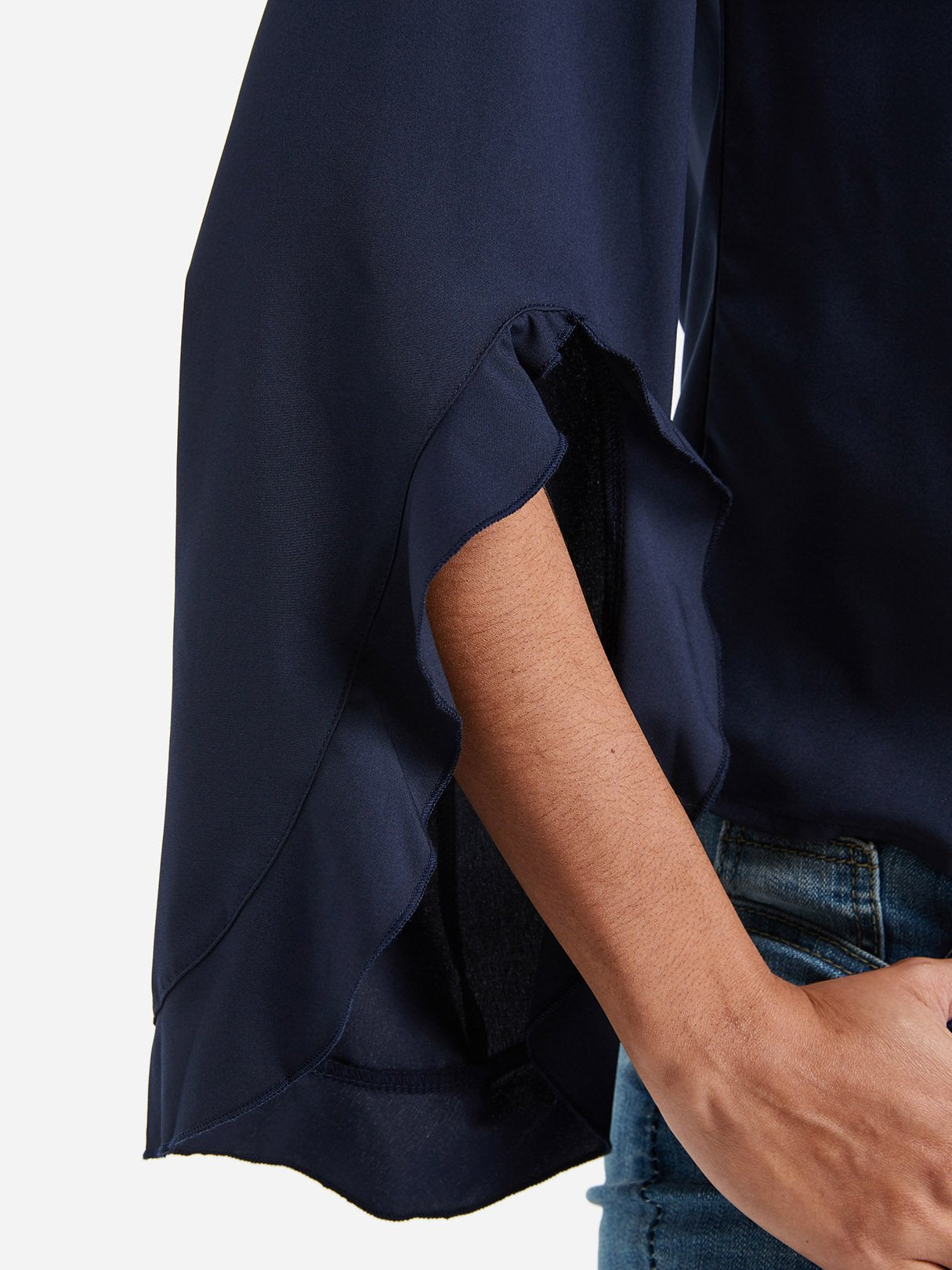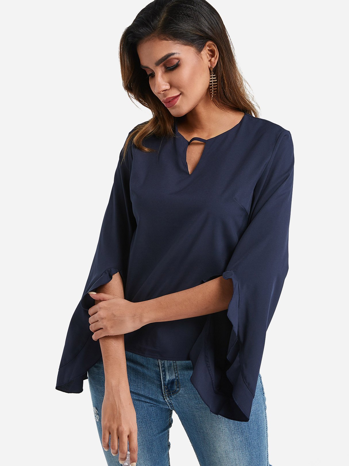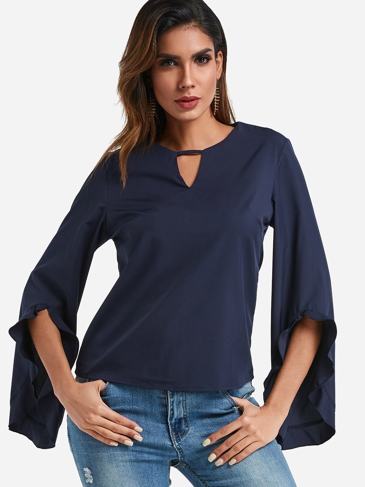 Crew Neck Plain Zip Back Cut Out Long Sleeve Navy Blouses