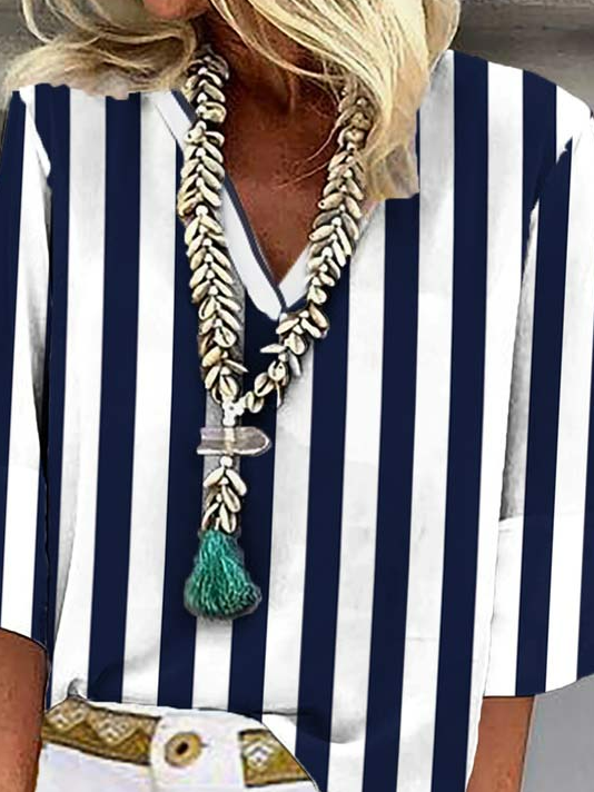Fashion 3/4 Sleeve V Neck Striped Loose Regular Blouse - Stripe-Blue / S is backordered and will ship as soon as it is back in stock.