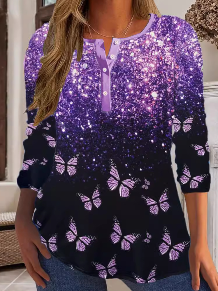 Fashion Crew Neck Long Sleeve Butterfly Loose Mid-Long Blouses - Purple / S is backordered and will ship as soon as it is back in stock.