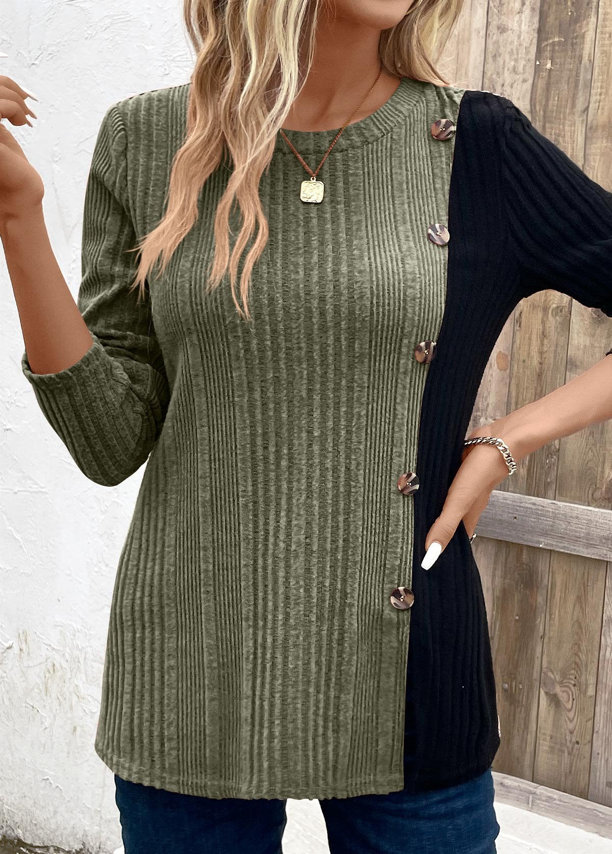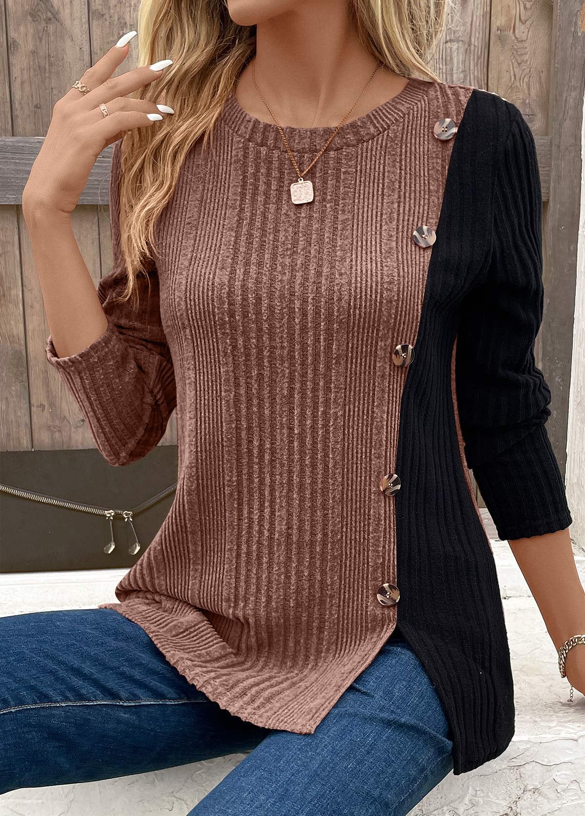 Fashion Crew Neck Long Sleeve Color Block Loose Regular Blouses - Deep Brown / S is backordered and will ship as soon as it is back in stock.