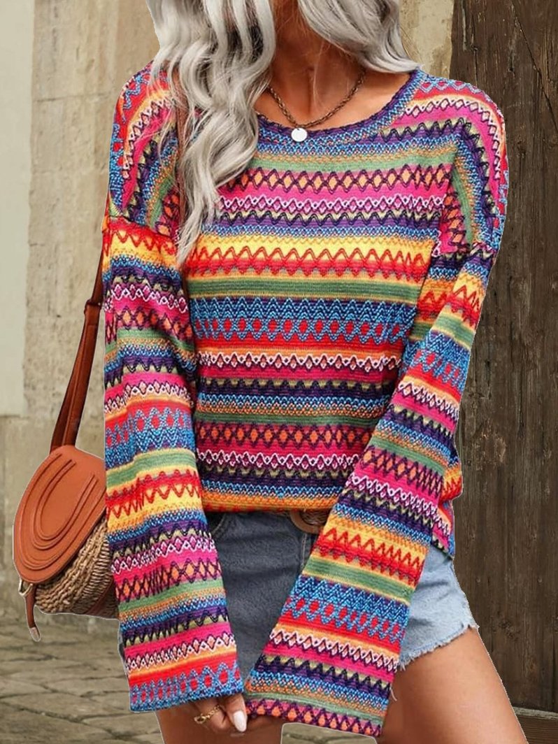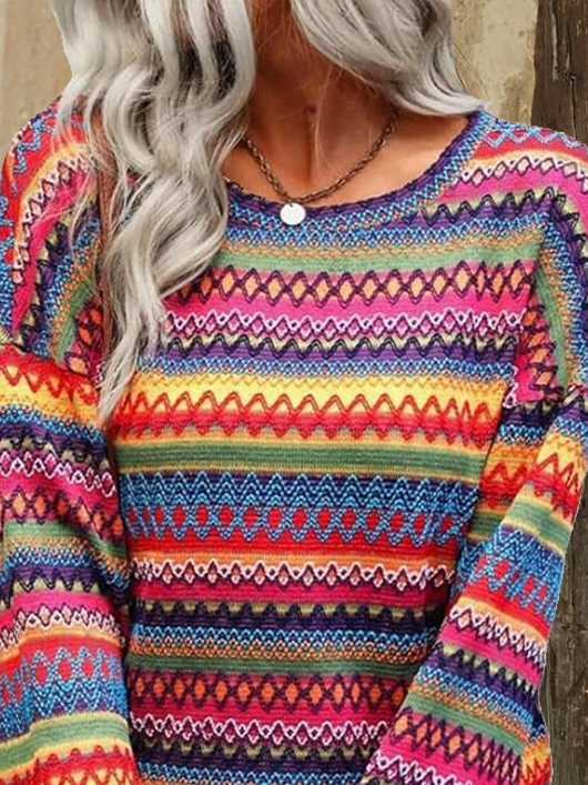 Fashion Crew Neck Long Sleeve Multicolor Block Jacquard Loose Regular Blouses - Multicolor / S is backordered and will ship as soon as it is back in stock.