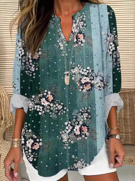 Fashion Long Sleeve Notched Floral Loose Regular Blouse - Red / S is backordered and will ship as soon as it is back in stock.