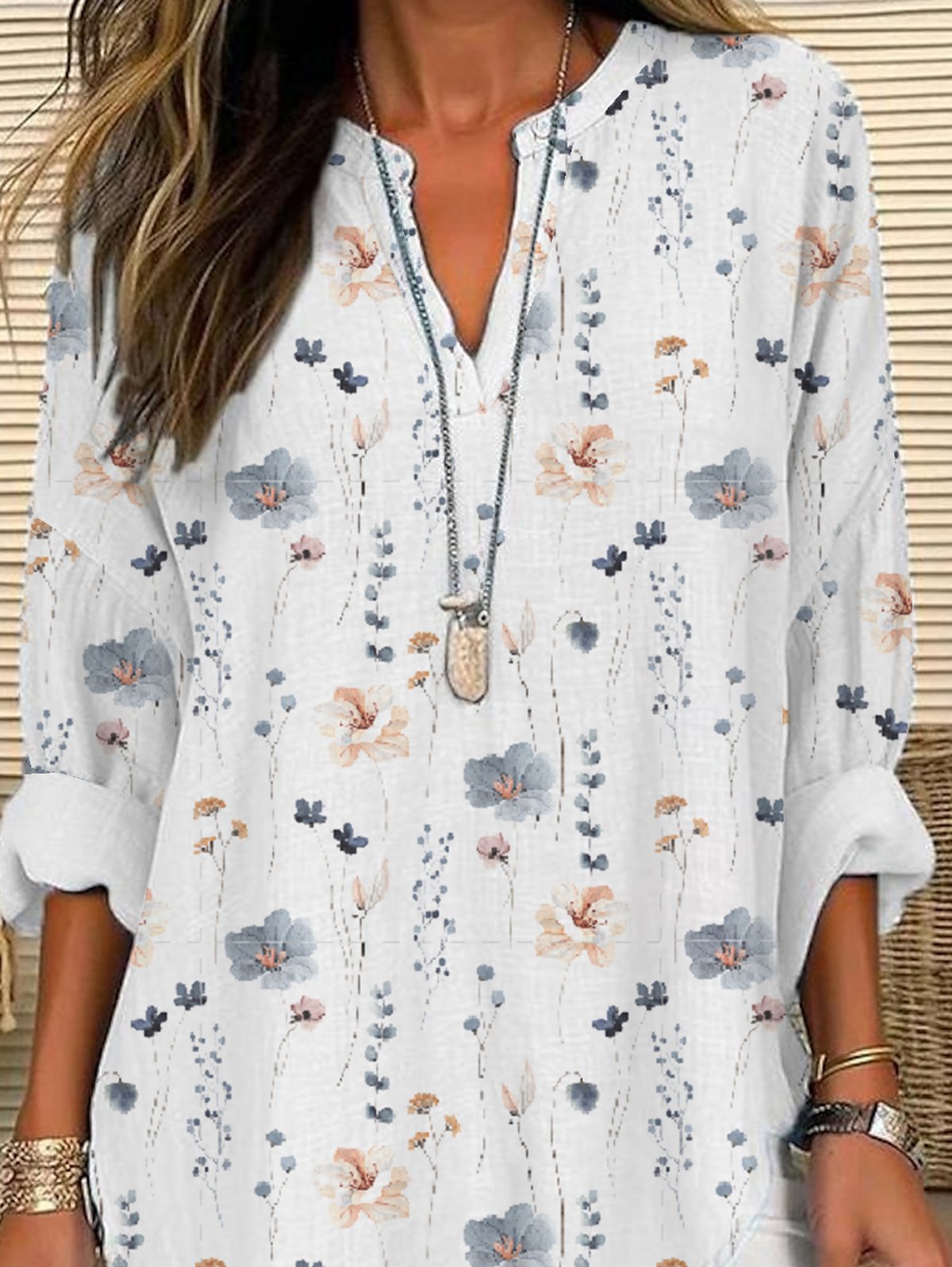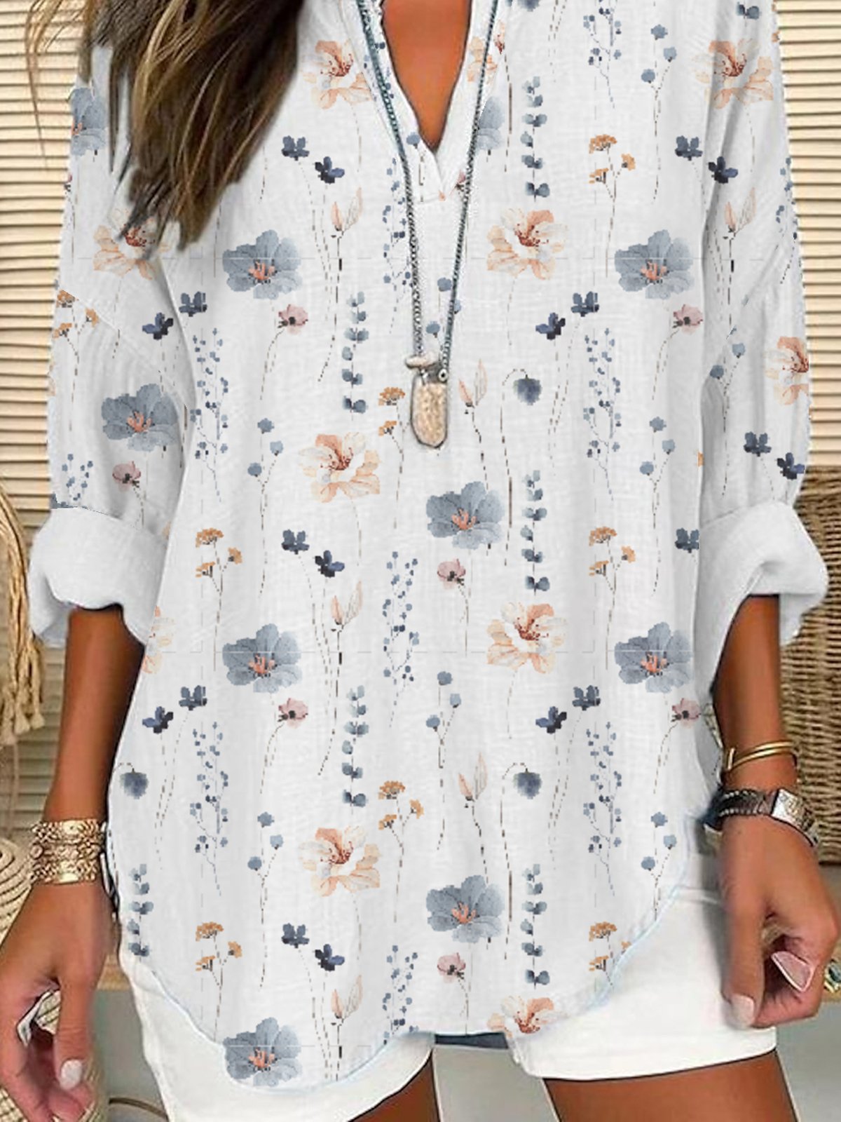 Fashion Long Sleeve Notched Floral Loose Regular Blouse - White / S is backordered and will ship as soon as it is back in stock.